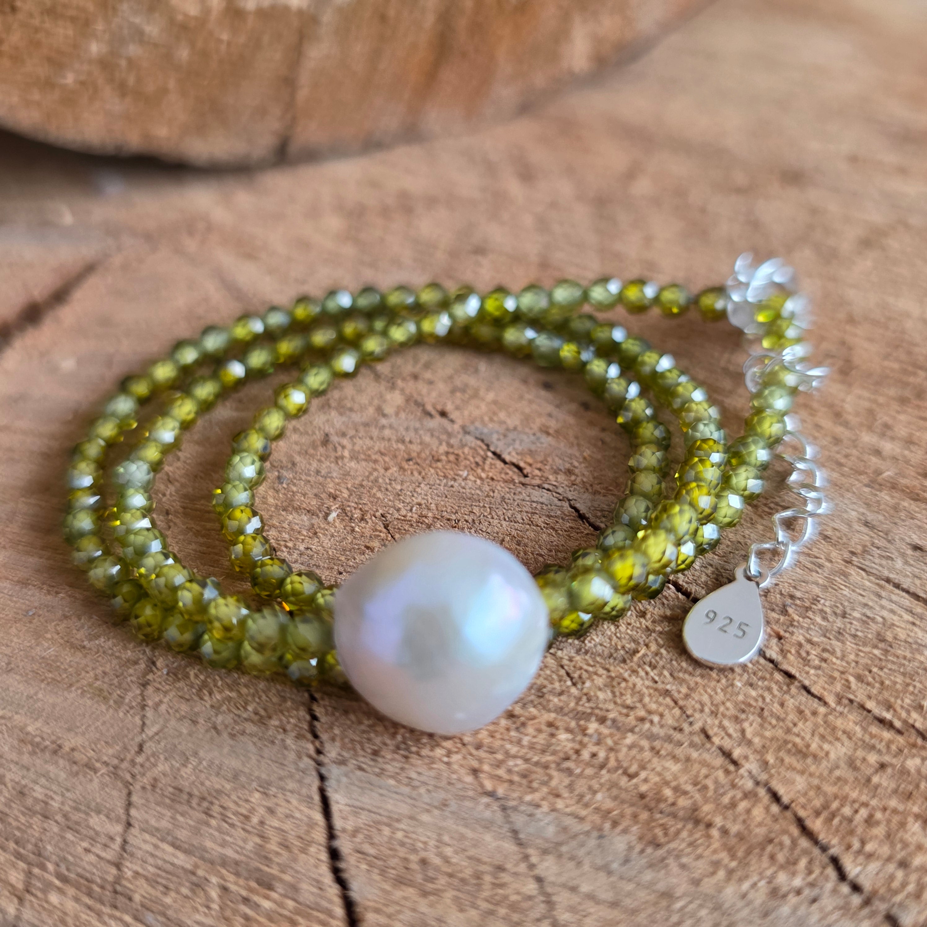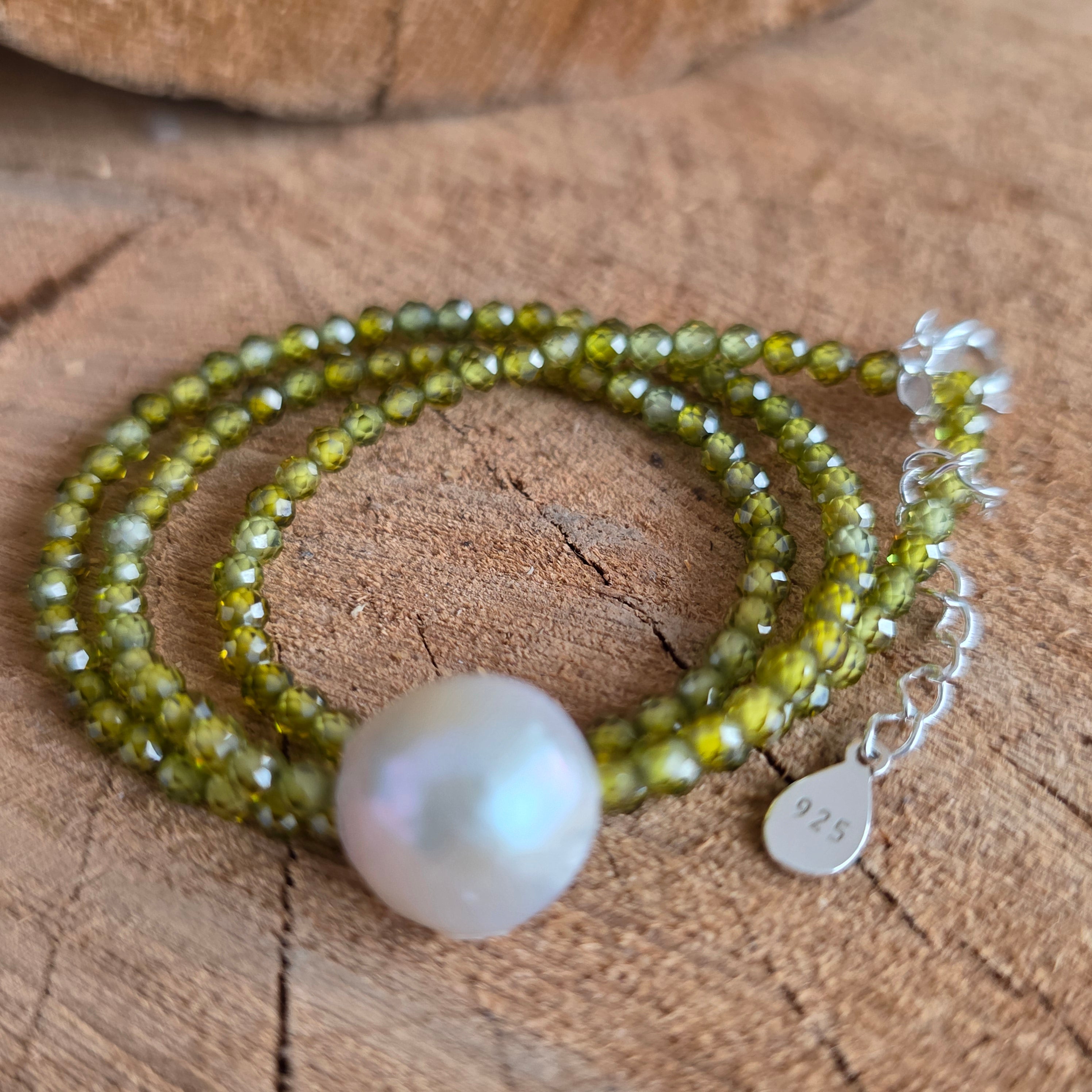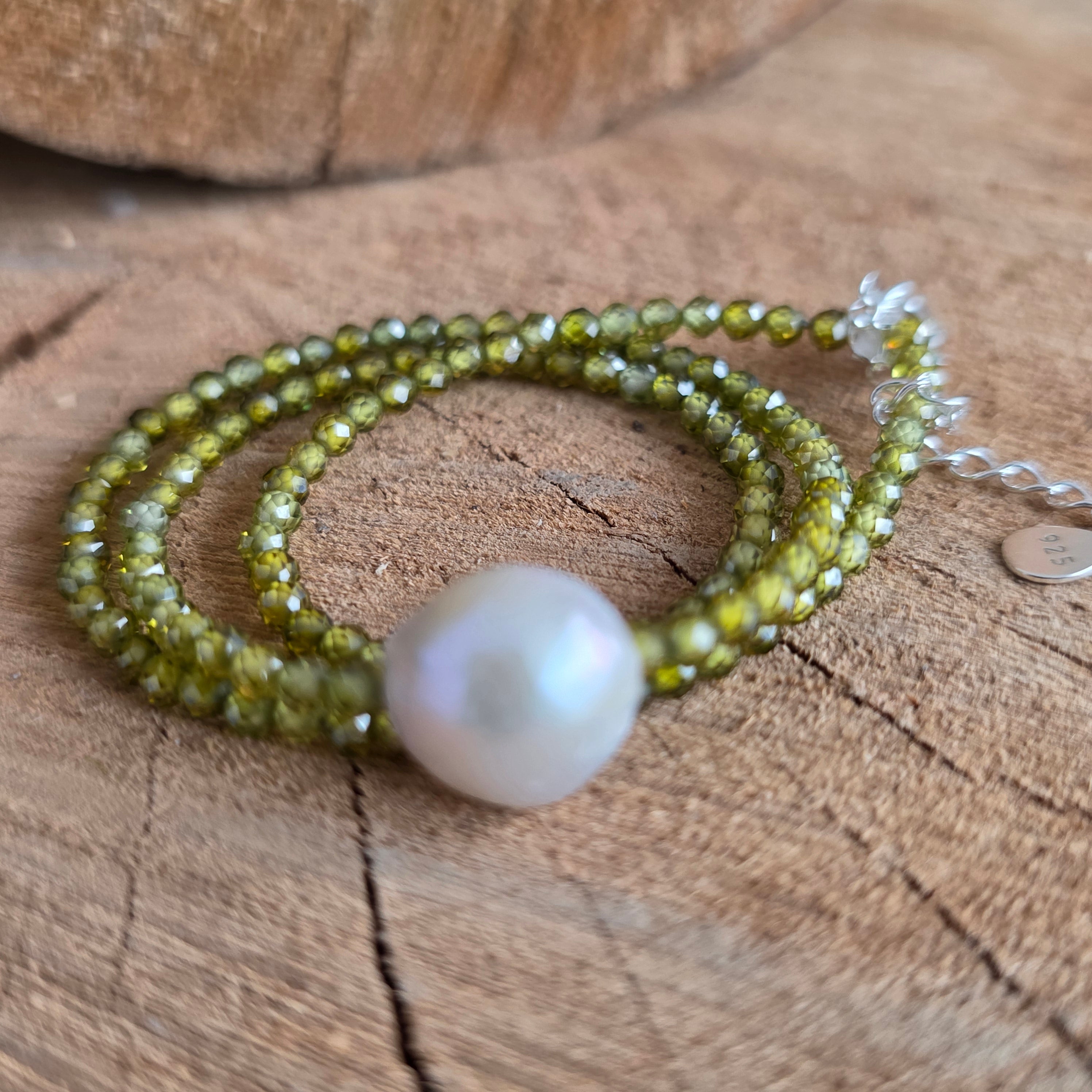 Υλικά: φακοειδείς χάντρες από πράσινο ζιργκόν 2,5 χλστ., ασήμι 925, μαργαριτάρι 1 εκ.