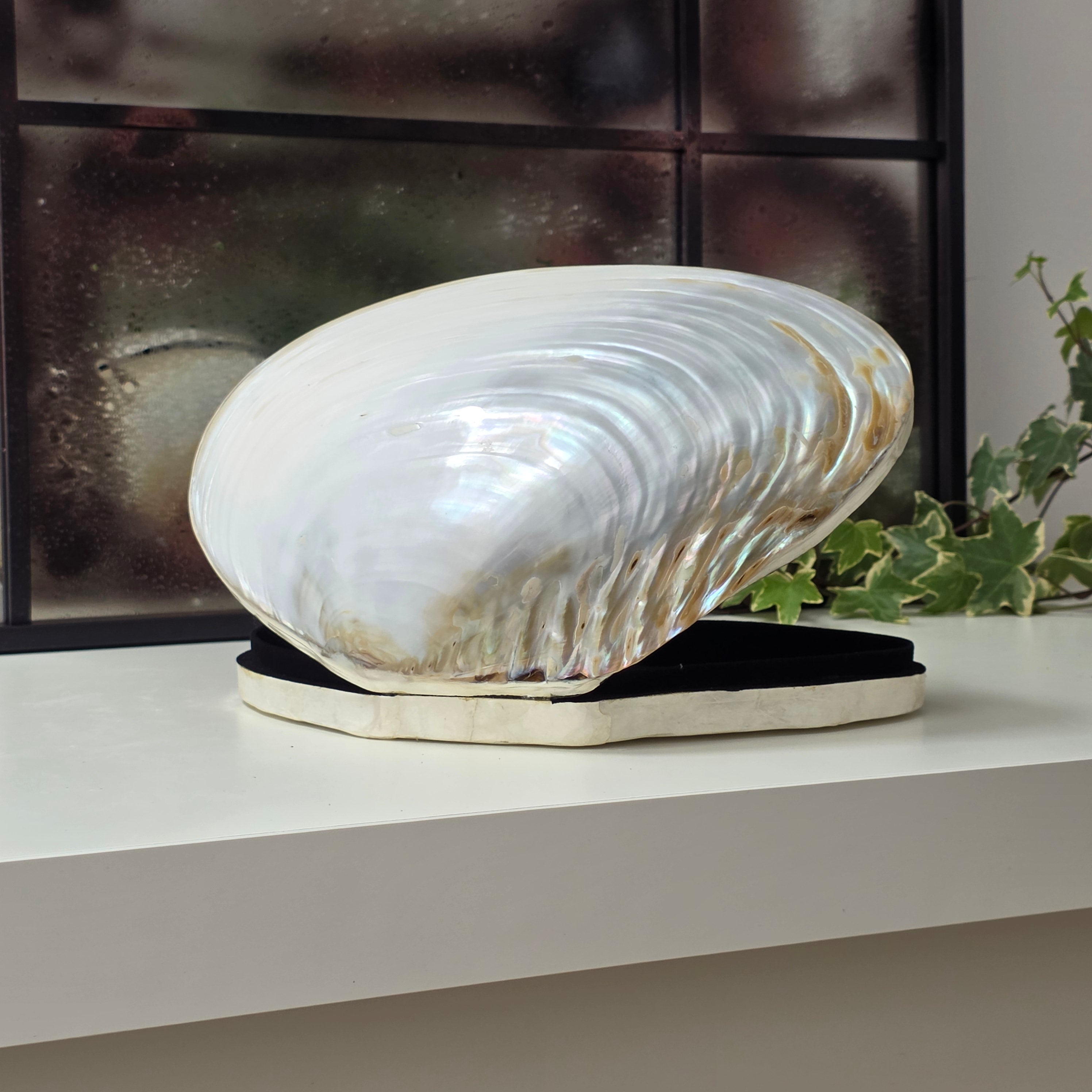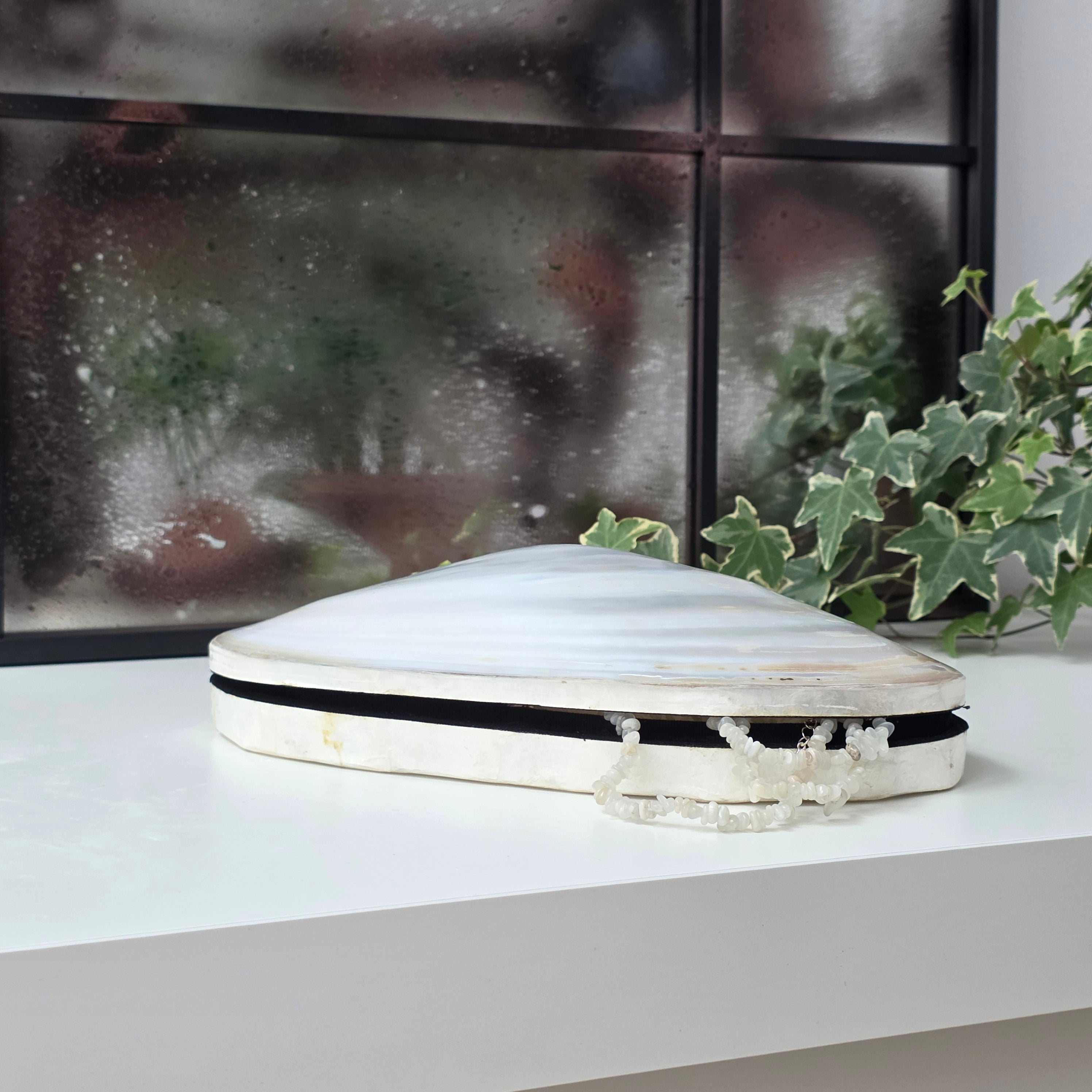 Ένα ευαίσθητο αντικείμενο, εμπνευσμένο από τη φυσική ομορφιά των κοχυλιών, αυτό το κουτί από όστρακο προσθέτει κομψότητα και φινέτσα σε οποιονδήποτε χώρο. Η ιριδίζουσα επιφάνειά του αντανακλά το φως σε περλέ αποχρώσεις, δημιουργώντας ένα διακριτικό παιχνίδι χρωμάτων, διαφορετικό από κομμάτι σε κομμάτι.