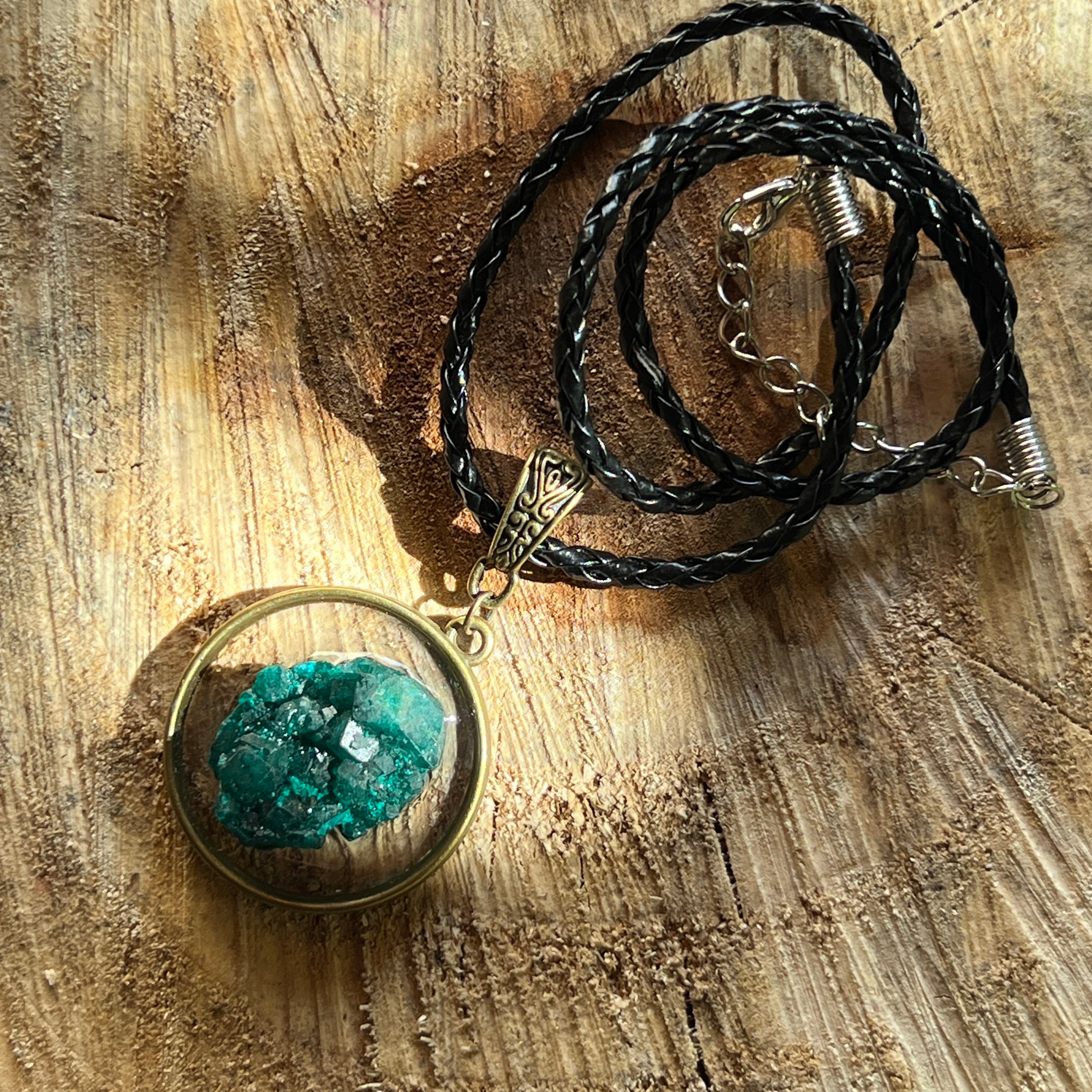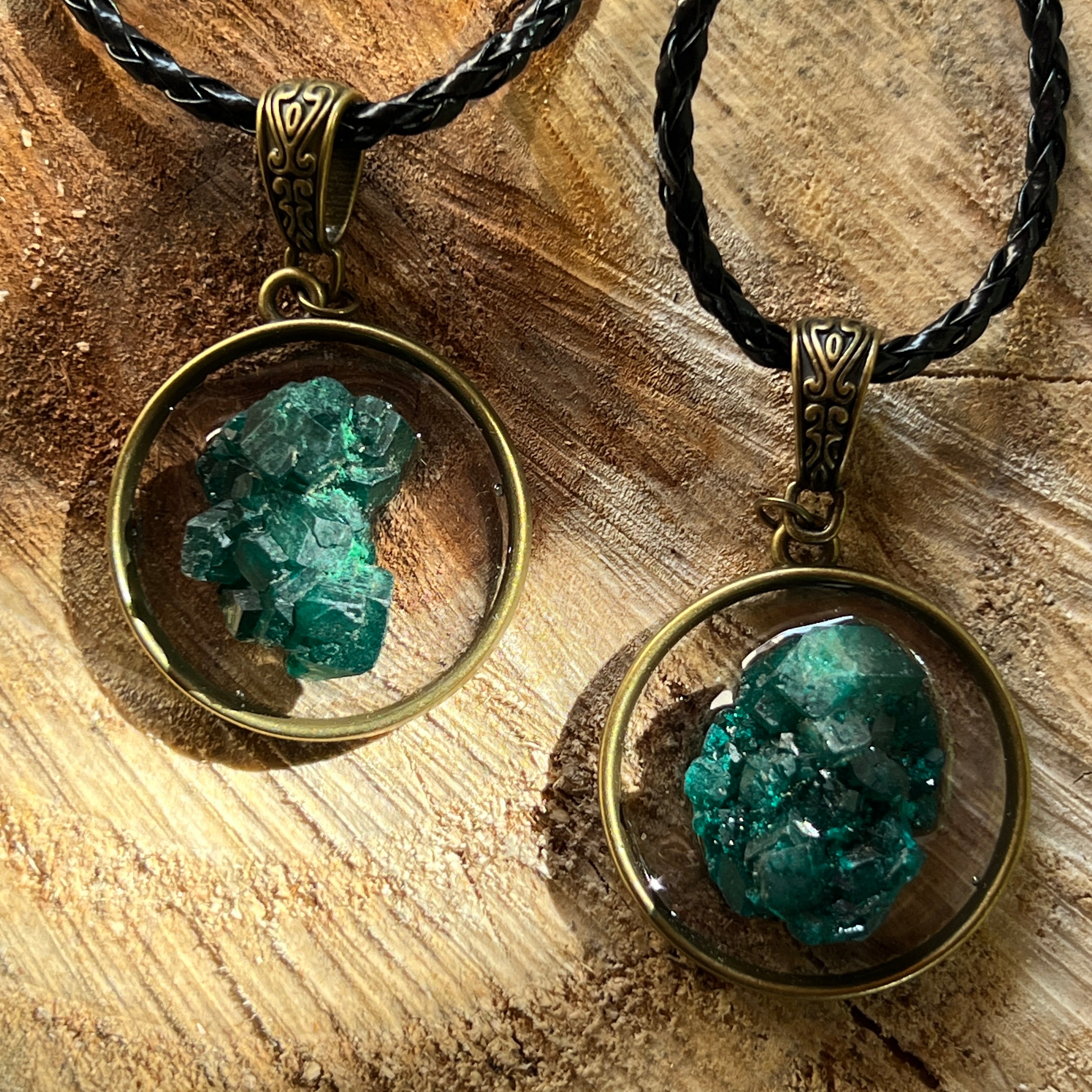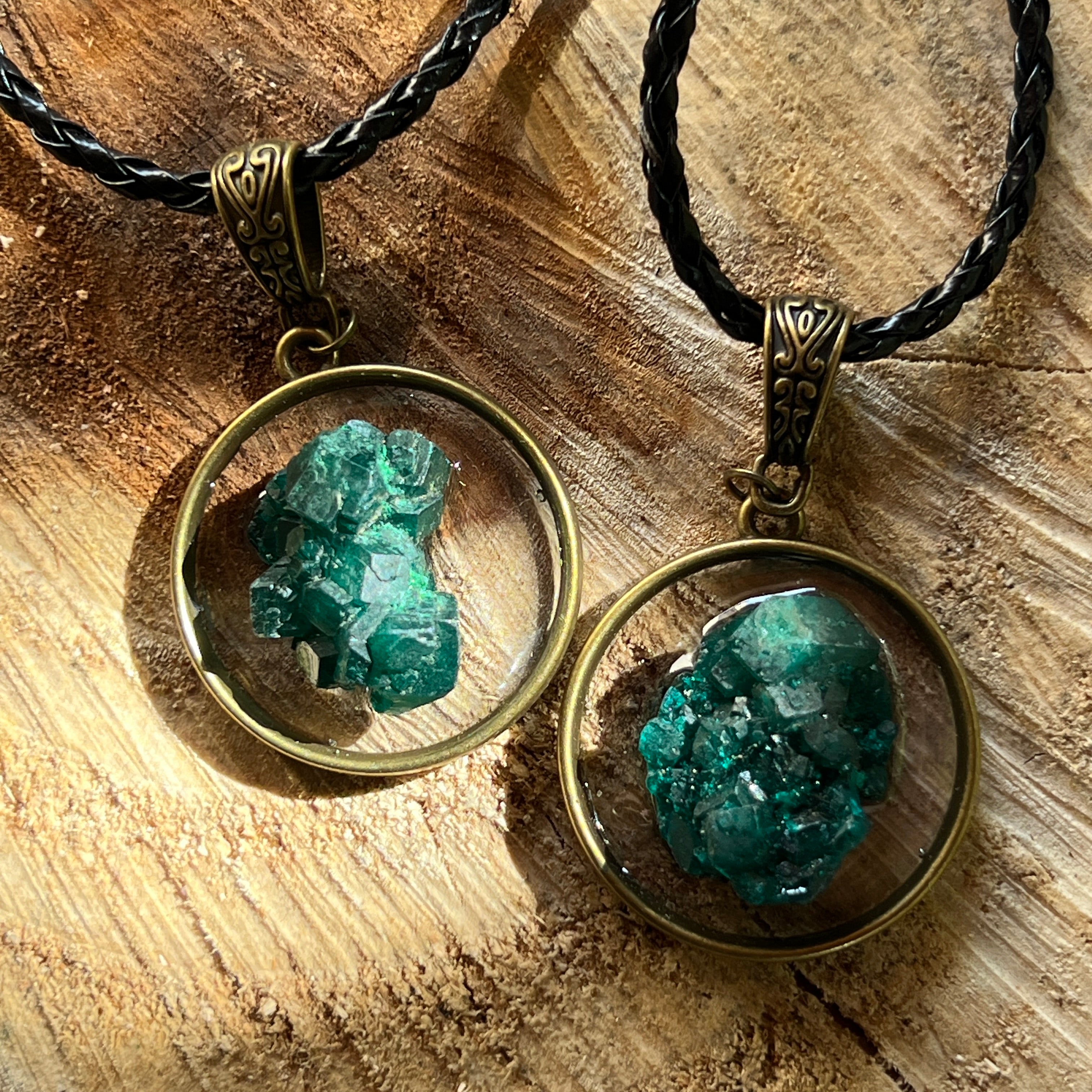 Αυτό το μοναδικό μενταγιόν δημιουργείται γύρω από α ακατέργαστα κομμάτια διοπτάσης, μια σπάνια και θεαματική πέτρα με έντονες αποχρώσεις του σμαραγδί πράσινου. Η φυσική του ενέργεια παραμένει ανέγγιχτη, επιτρέποντας στον κρύσταλλο να αποκαλύψει την αληθινή του ομορφιά, όπως ακριβώς σχηματίστηκε στη μήτρα της Γης.