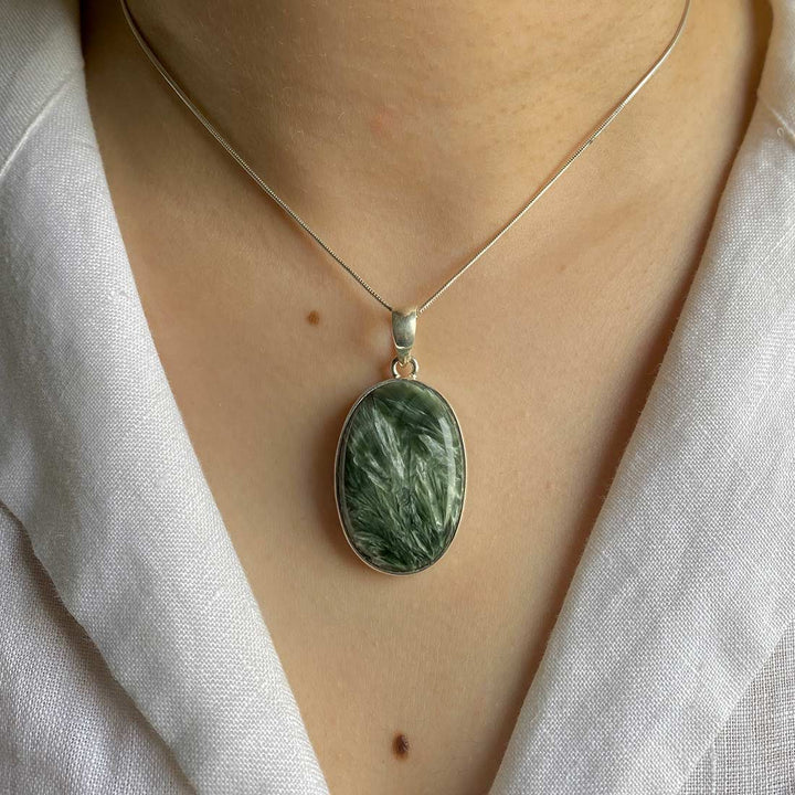 Ο σεραφινίτης ξεχωρίζει για τις λεπτές αποχρώσεις του πράσινου, που συνδυάζονται αρμονικά με ασημί ή λευκές ραβδώσεις, που θυμίζουν φτερά αγγέλου. Αυτός ο συνδυασμός φυσικών χρωμάτων και σχεδίων δημιουργεί μια λεπτή και γοητευτική εμφάνιση στα κοσμήματα. Ο σεραφίτης συνδέεται συχνά με αγγελικές και πνευματικές ενέργειες, καθώς θεωρείται πέτρα θεϊκού φωτός και αγάπης.