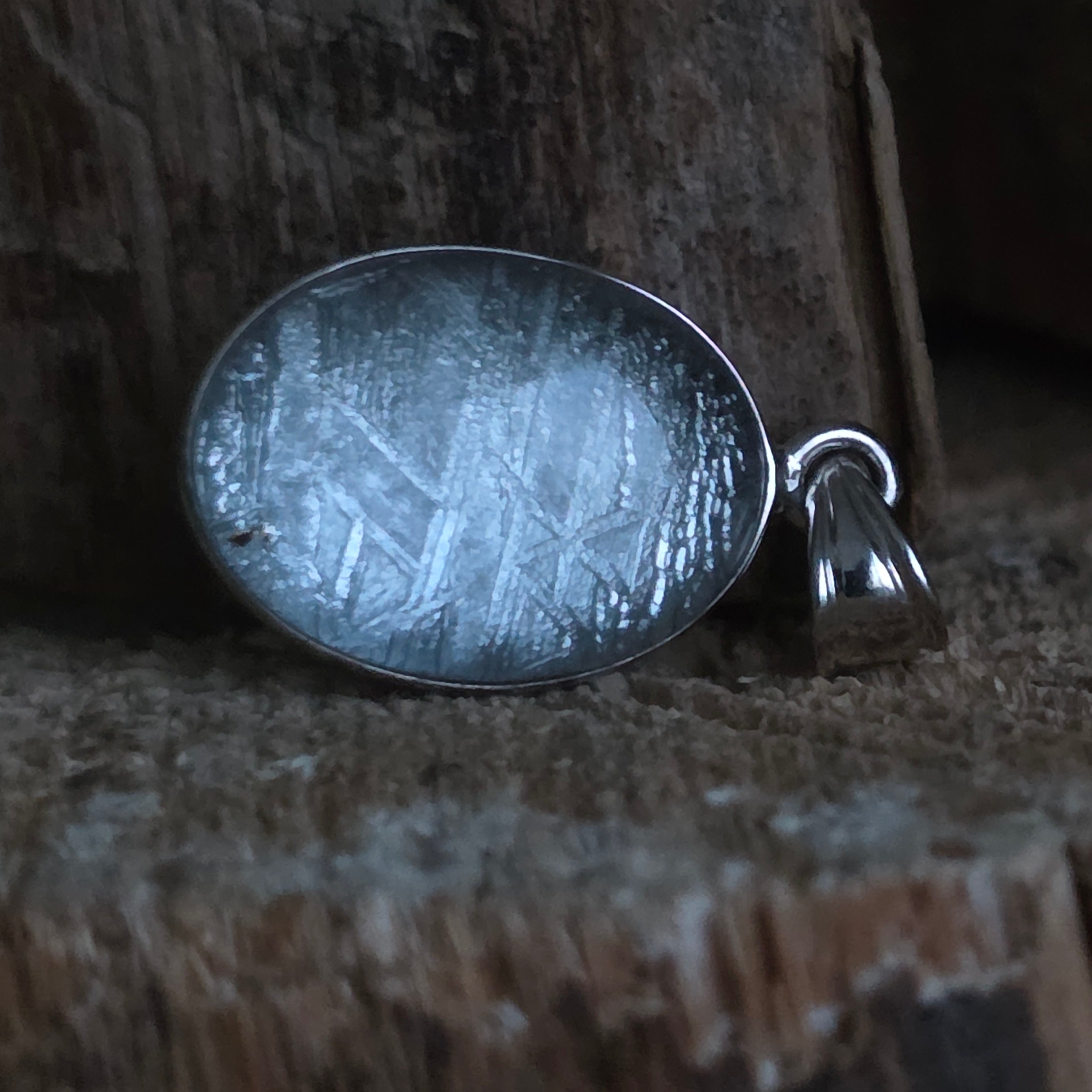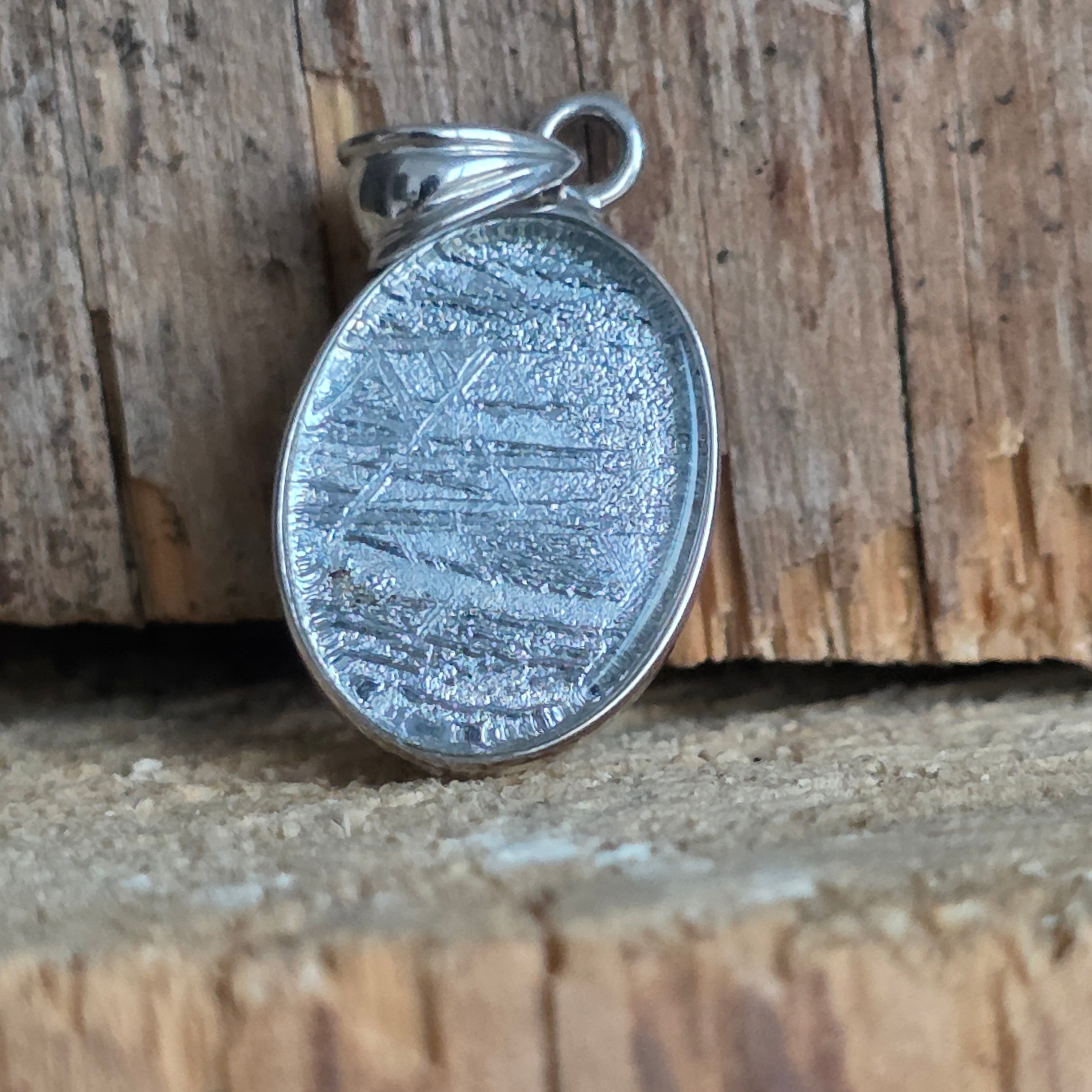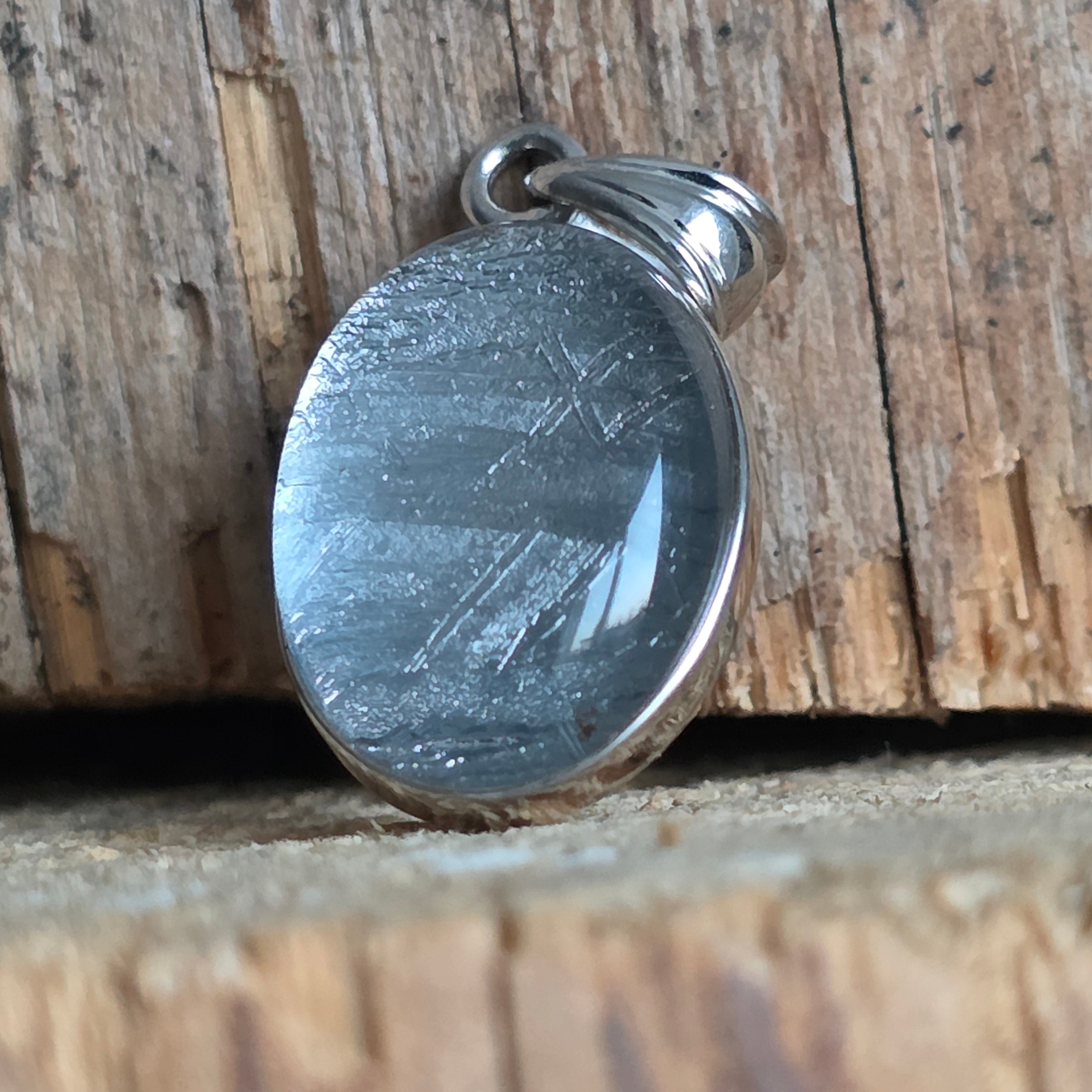 Αυτό το κρεμαστό περιέχει ένα αυθεντικό κομμάτι από Muonionalusta, έναν μετεωρίτη που ανακαλύφθηκε στο βορειότερο άκρο της Σουηδίας, γνωστό ως ένας από τους αρχαιότερους και πιο συναρπαστικούς μεταλλικούς μετεωρίτες που έχουν πέσει στη Γη. Κάθε κομμάτι φέρει μέσα του μια κοσμική ιστορία πολλών εκατομμυρίων ετών, αποτελώντας ένα σπάνιο παράδειγμα υλικού που προέρχεται από το διάστημα.