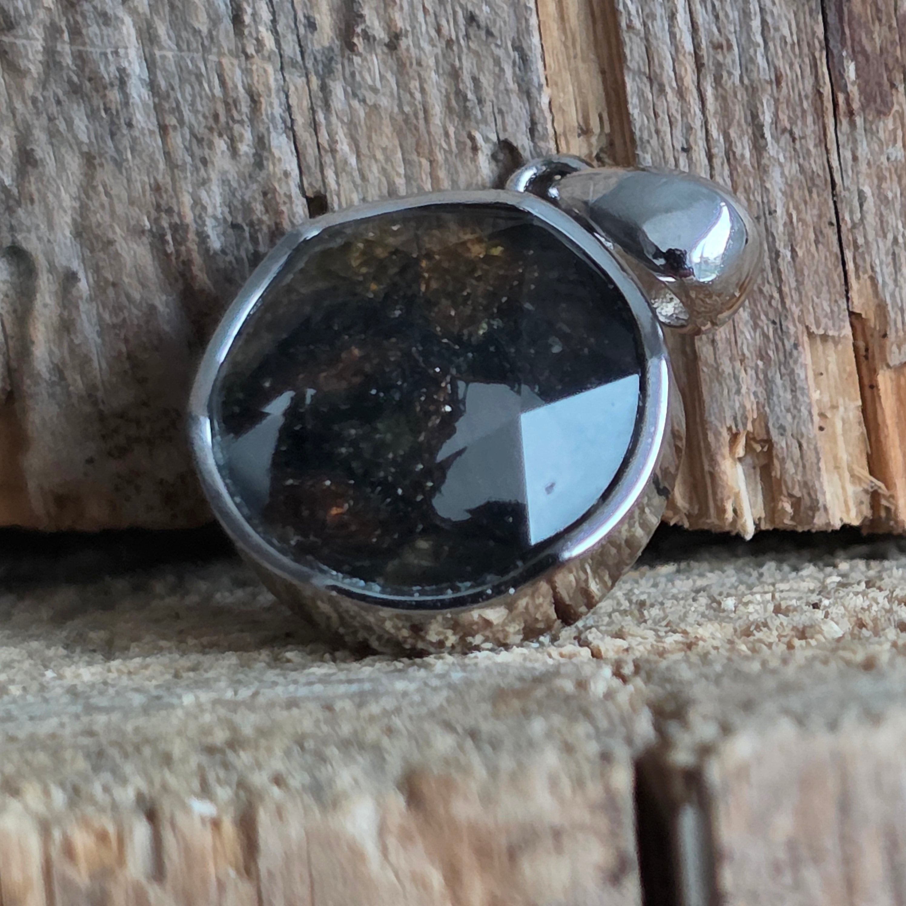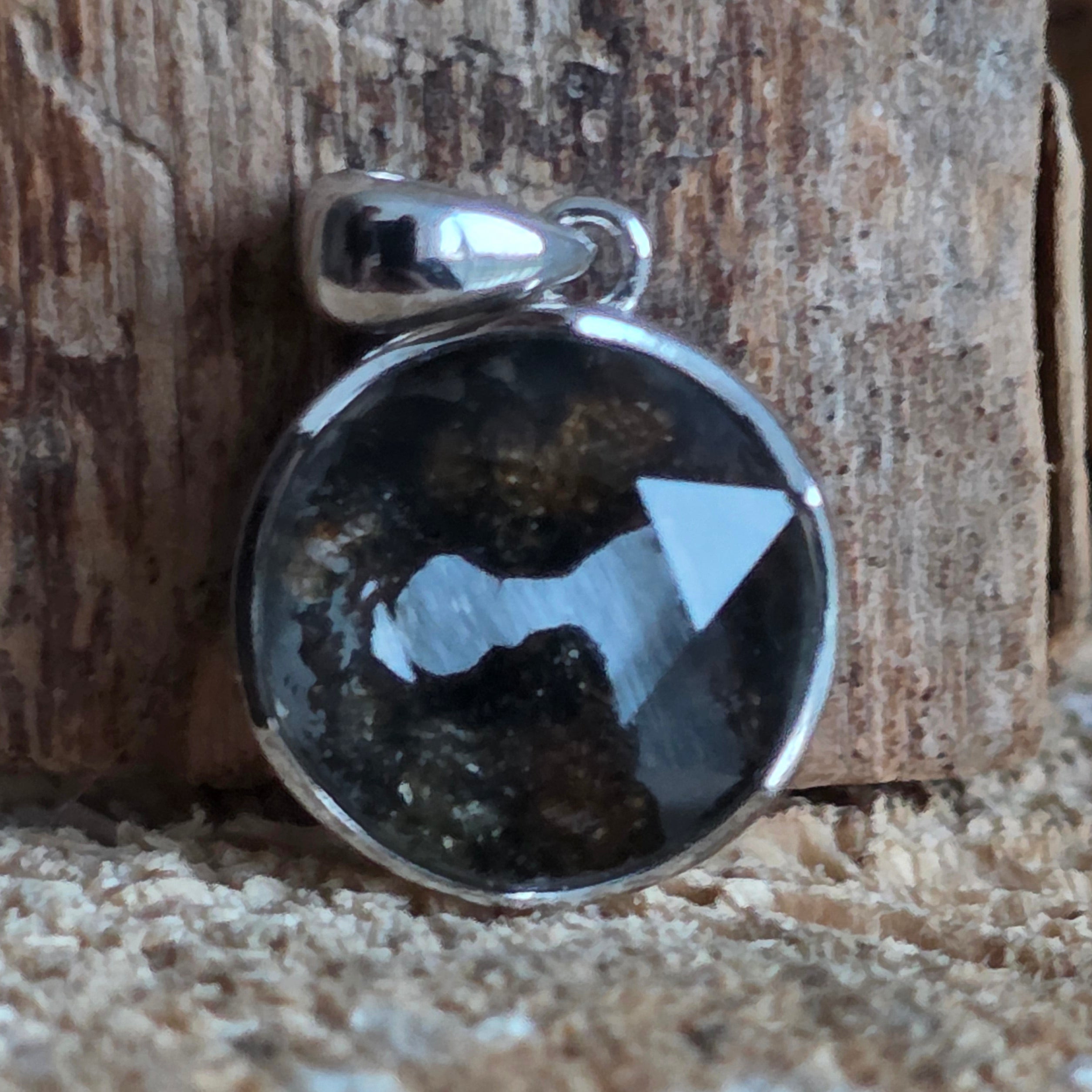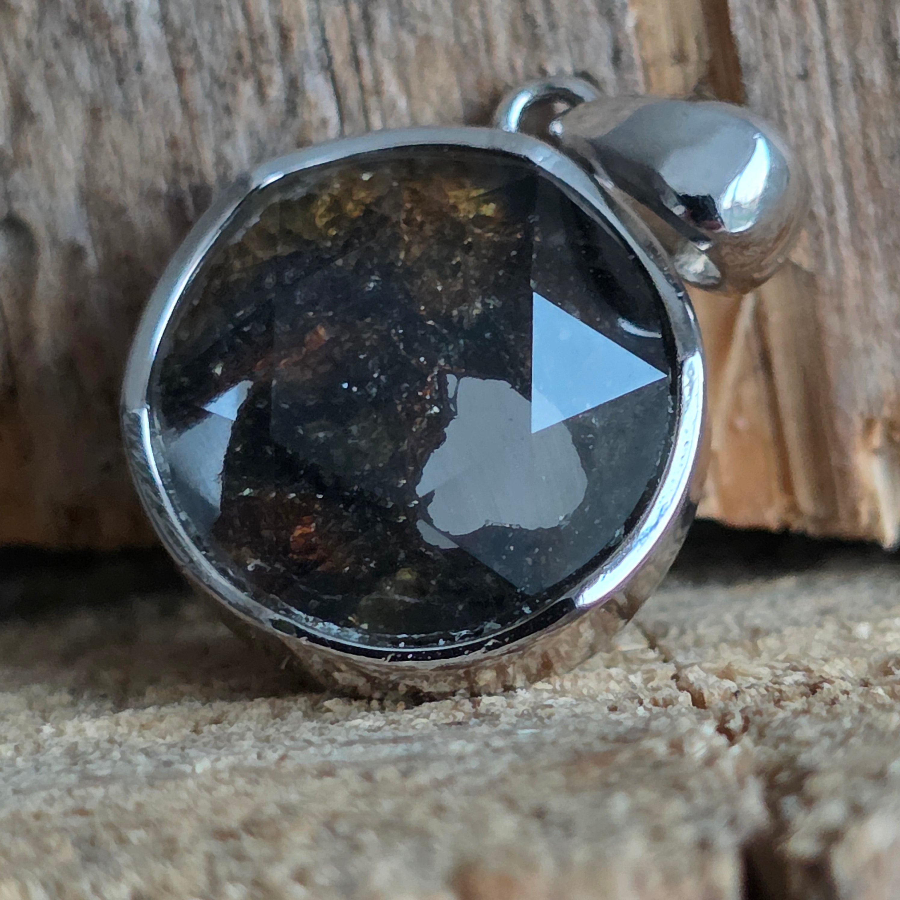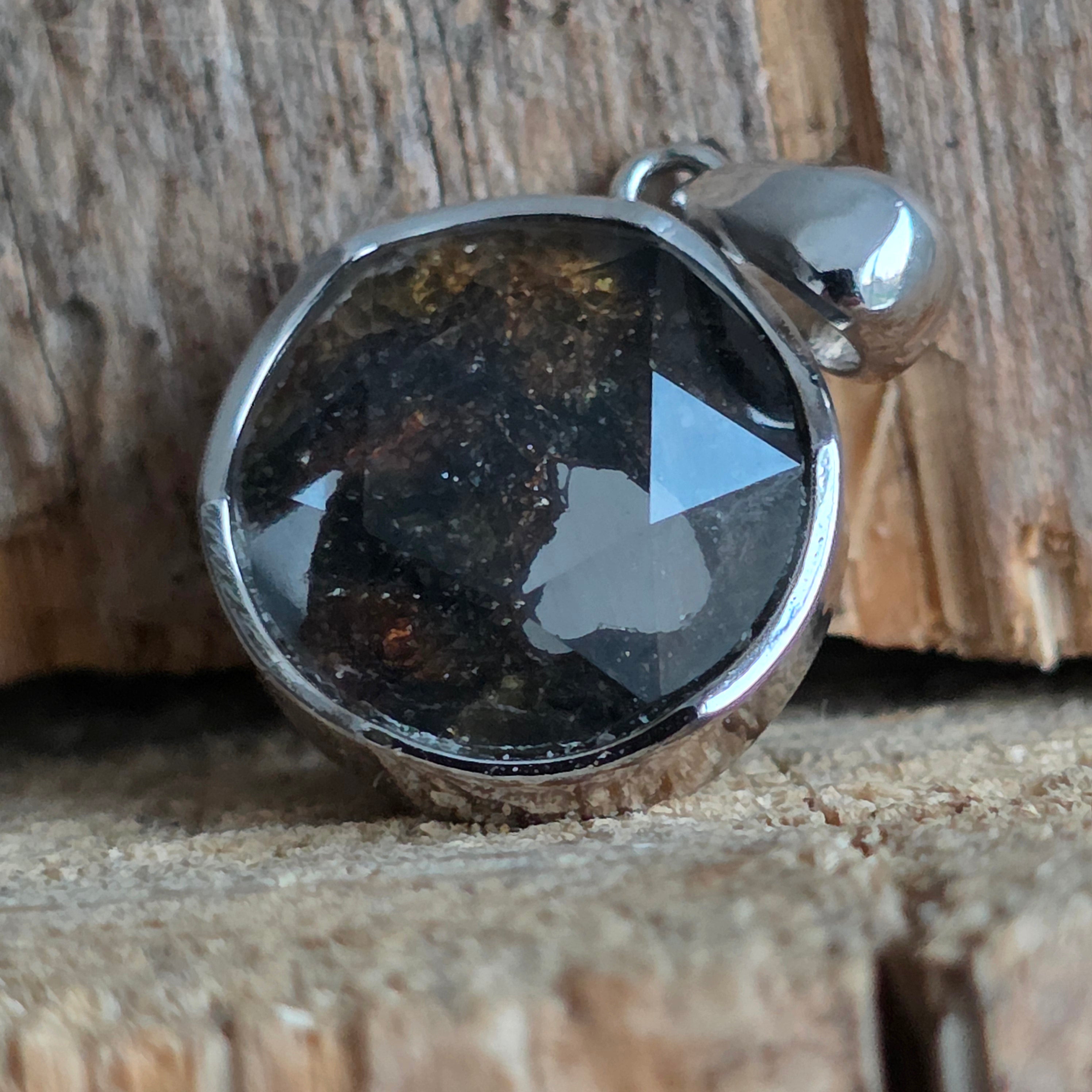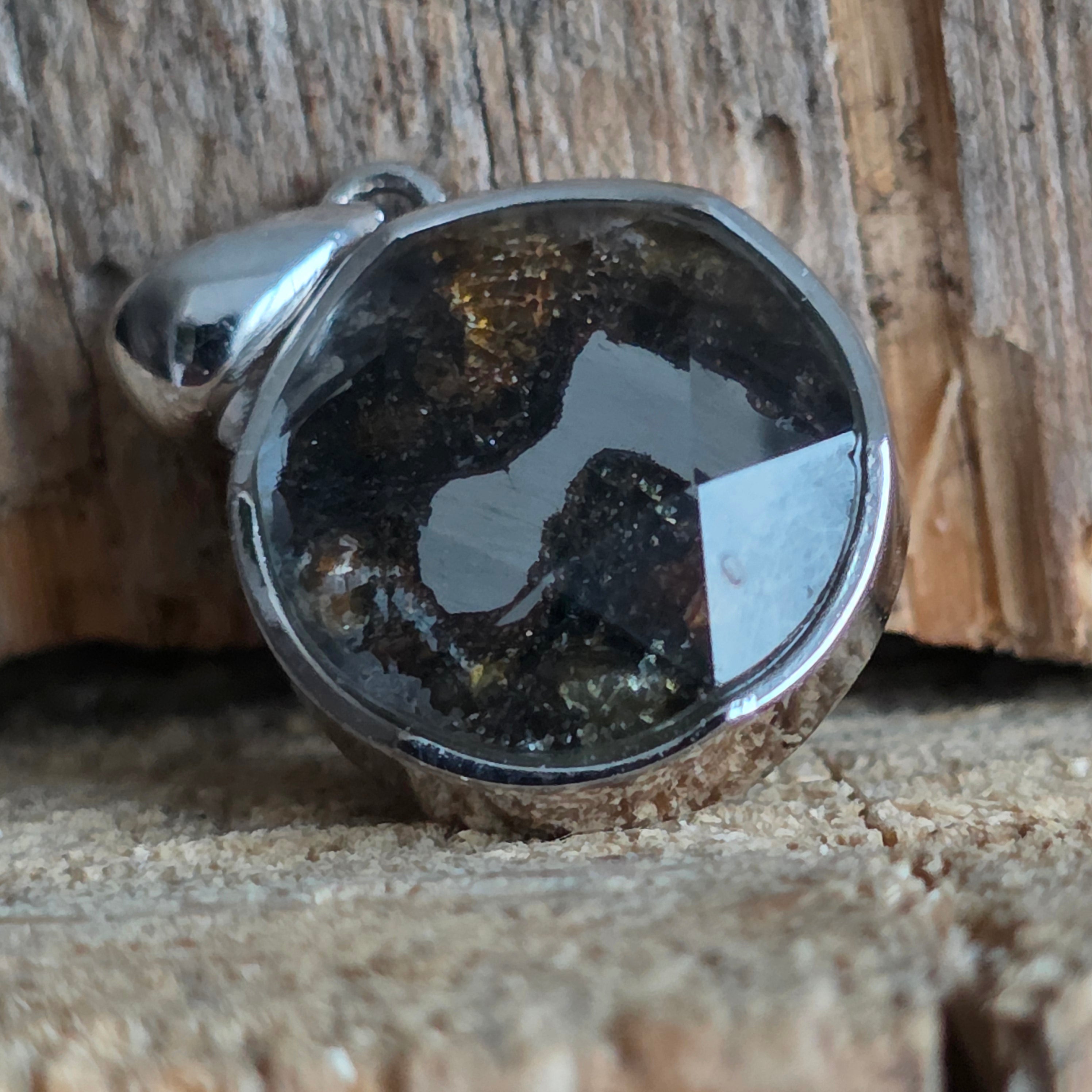 Αυτό το κρεμαστό περιέχει ένα αυθεντικό κομμάτι από Muonionalusta, έναν μετεωρίτη που ανακαλύφθηκε στο βορειότερο άκρο της Σουηδίας, γνωστό ως ένας από τους αρχαιότερους και πιο συναρπαστικούς μεταλλικούς μετεωρίτες που έχουν πέσει στη Γη. Κάθε κομμάτι φέρει μέσα του μια κοσμική ιστορία πολλών εκατομμυρίων ετών, αποτελώντας ένα σπάνιο παράδειγμα υλικού προερχόμενου από το διάστημα.