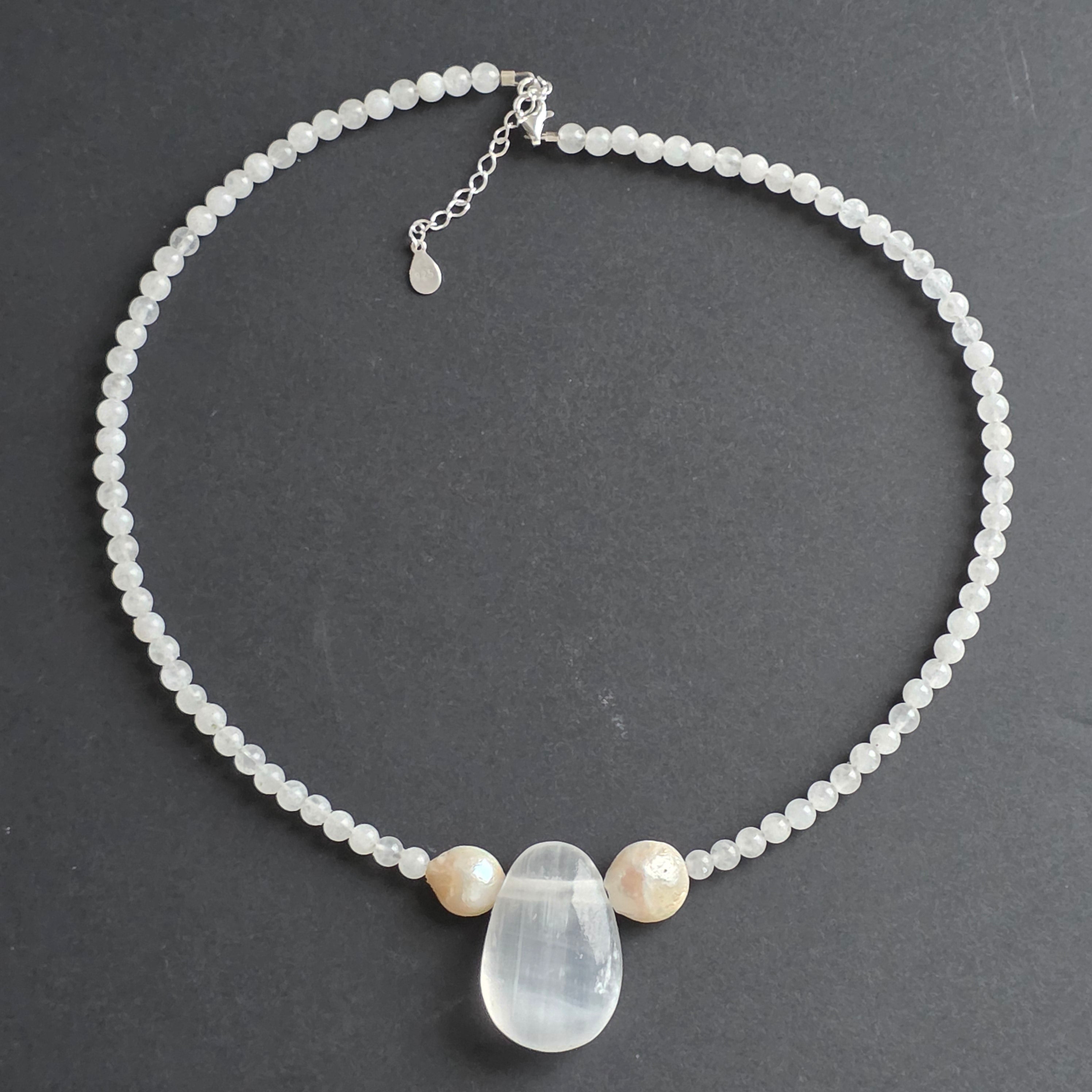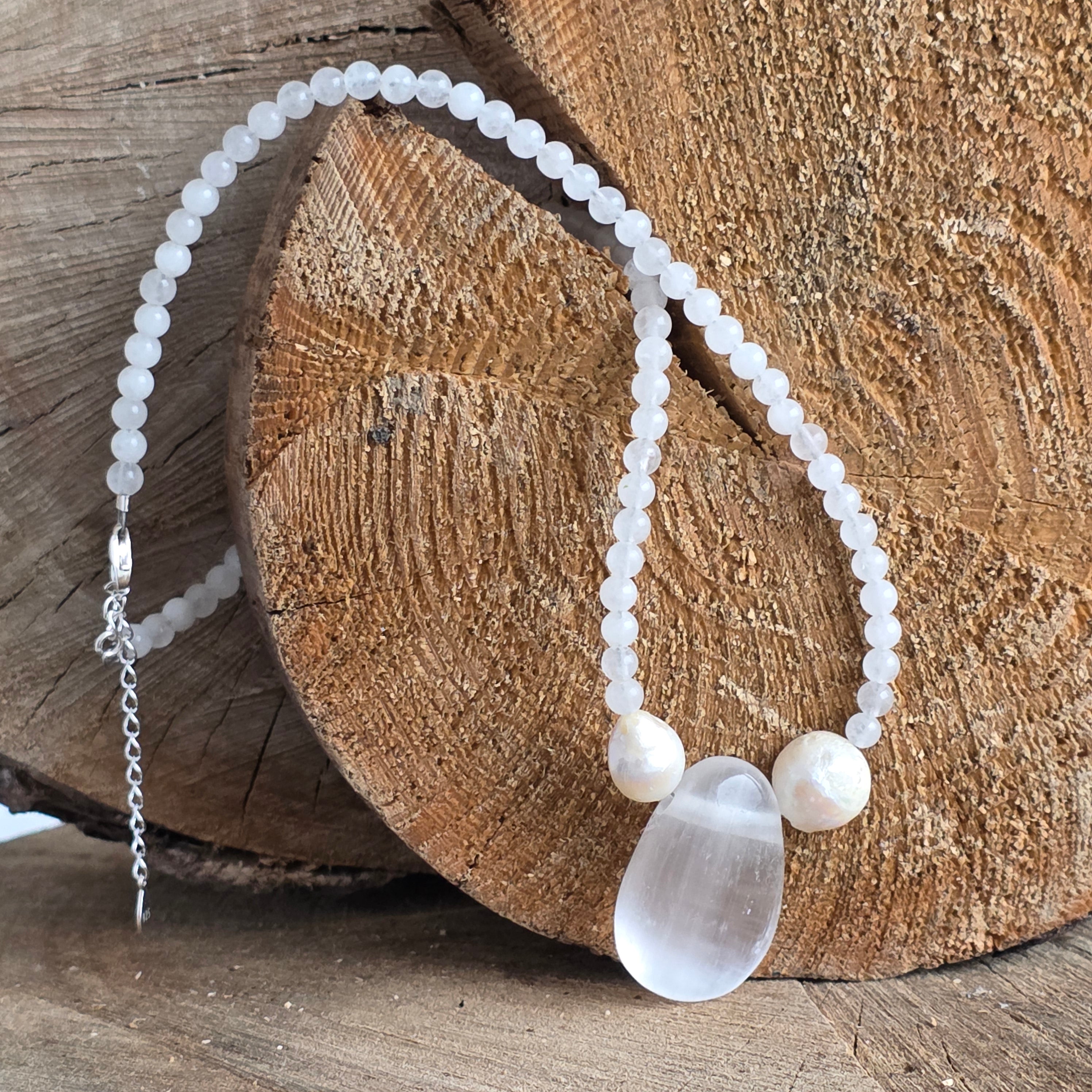 Λευκό κολιέ νεφρίτη, μαργαριτάρια και φεγγάρι Selenite#29