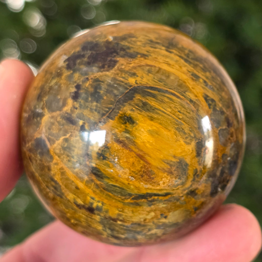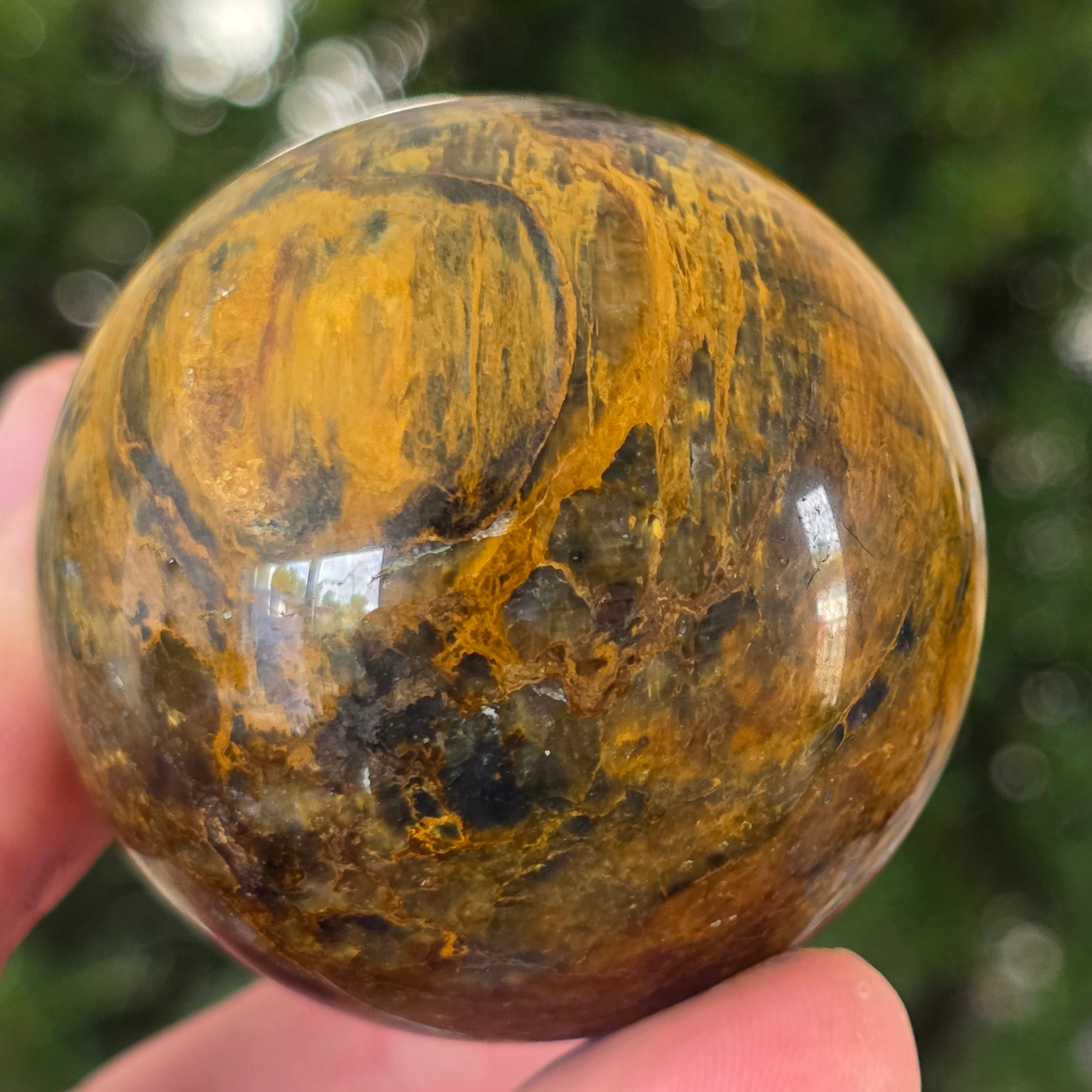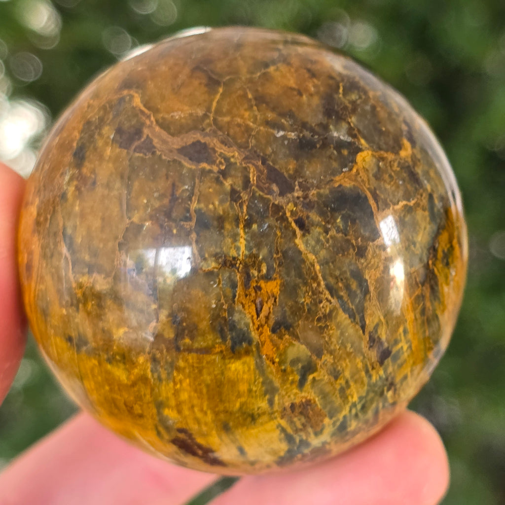 Αυτό Σφαίρα Pietersit Φαίνεται να περιέχει μια κοσμική καταιγίδα παγιδευμένη σε πέτρα. Οι μπλε και χρυσές αντανακλάσεις του κινούνται σαν σύννεφα και αστραπές παγωμένες στο χρόνο, δημιουργώντας μια ψευδαίσθηση αέναης κίνησης.