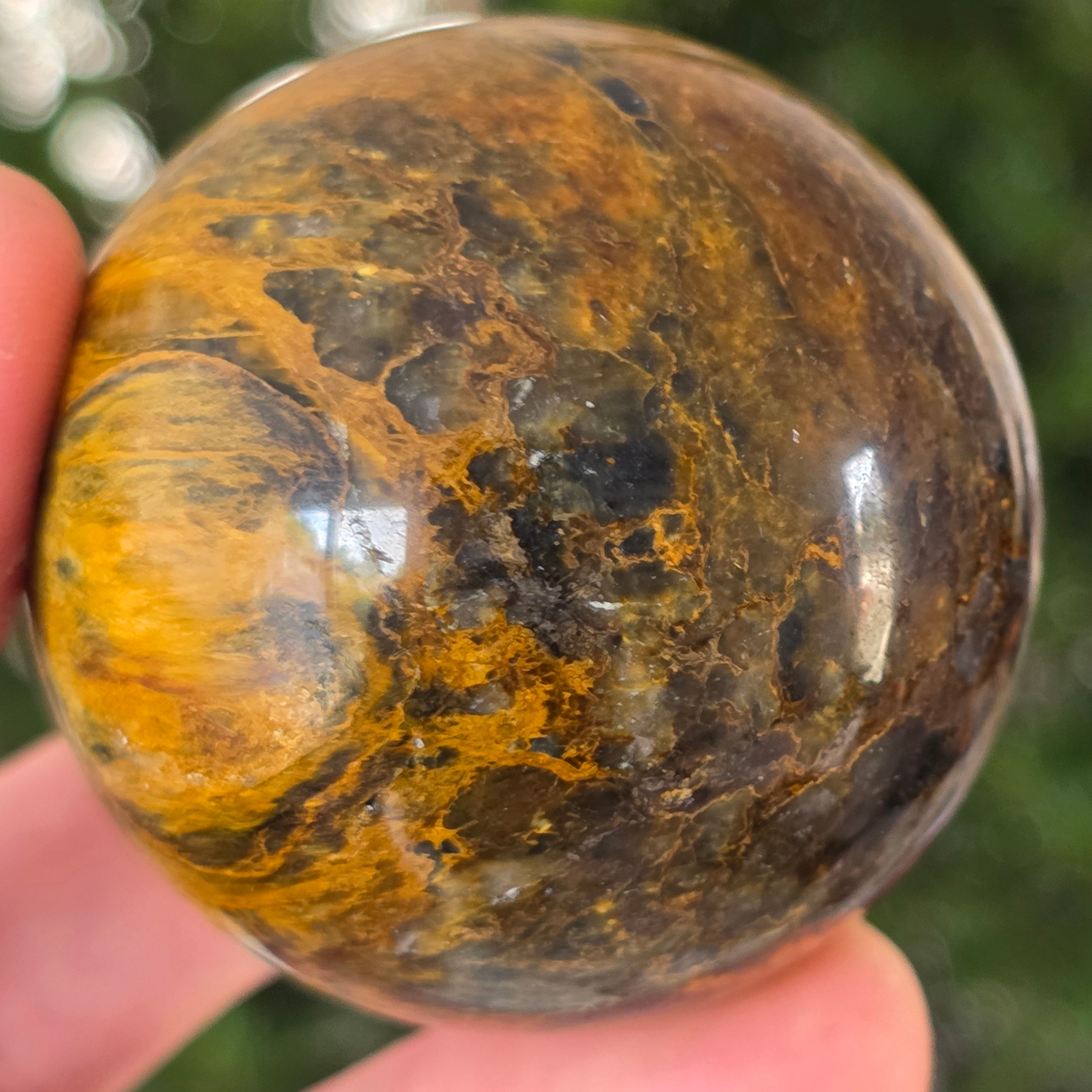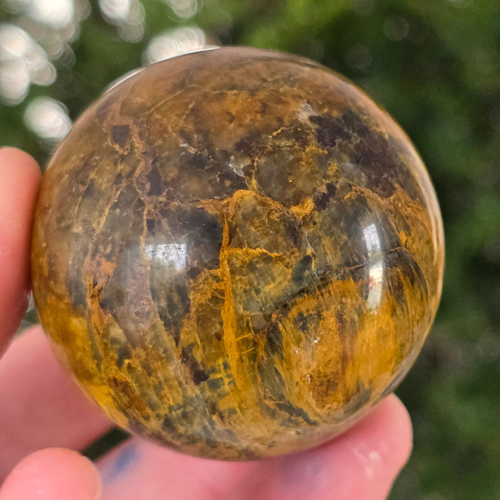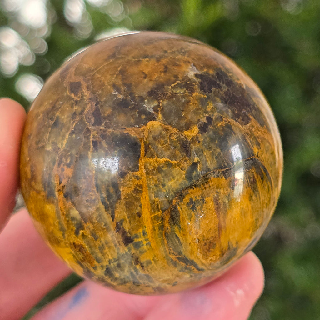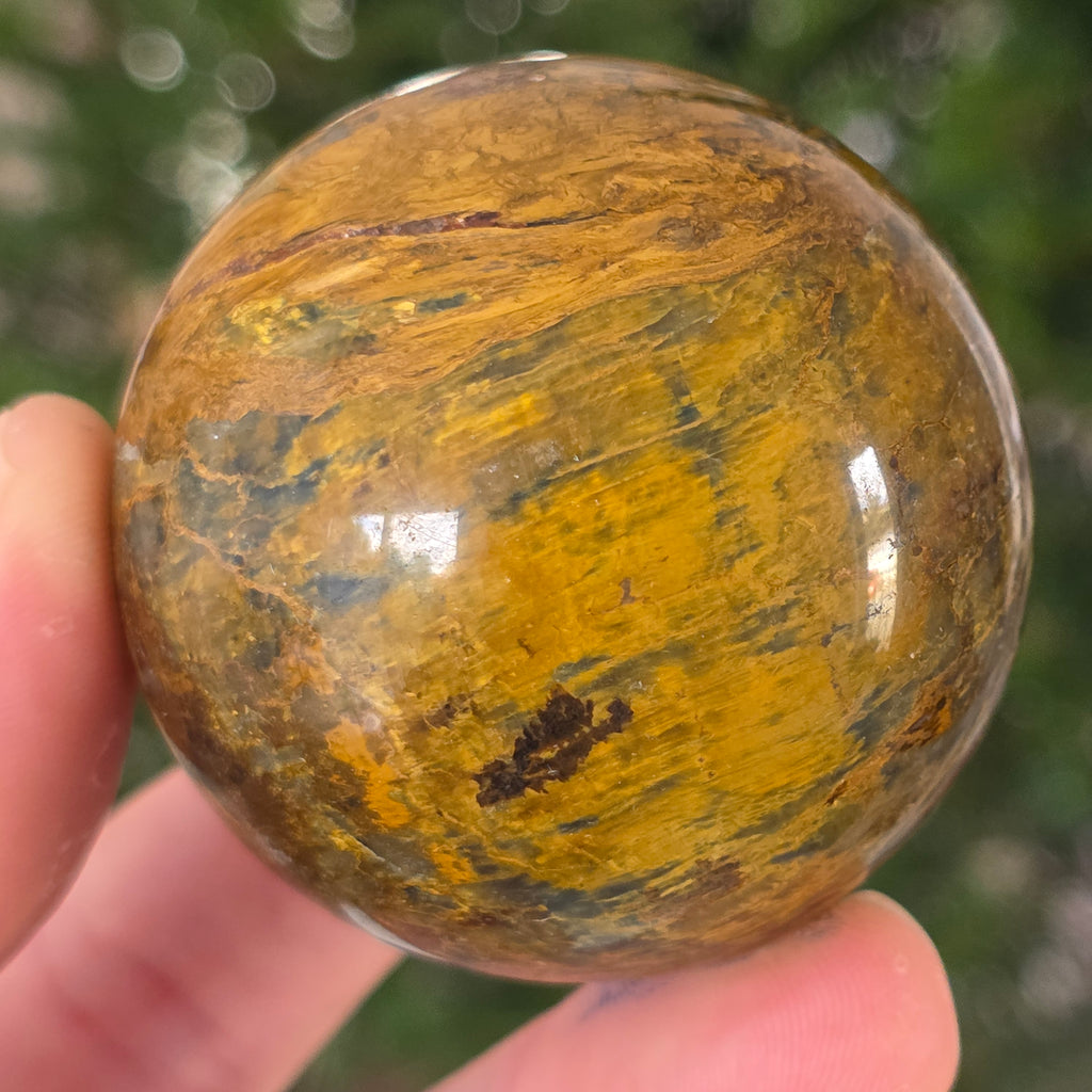 Αυτό Σφαίρα Pietersit Φαίνεται να περιέχει μια κοσμική καταιγίδα παγιδευμένη σε πέτρα. Οι μπλε και χρυσές αντανακλάσεις του κινούνται σαν σύννεφα και αστραπές παγωμένες στο χρόνο, δημιουργώντας μια ψευδαίσθηση αέναης κίνησης.