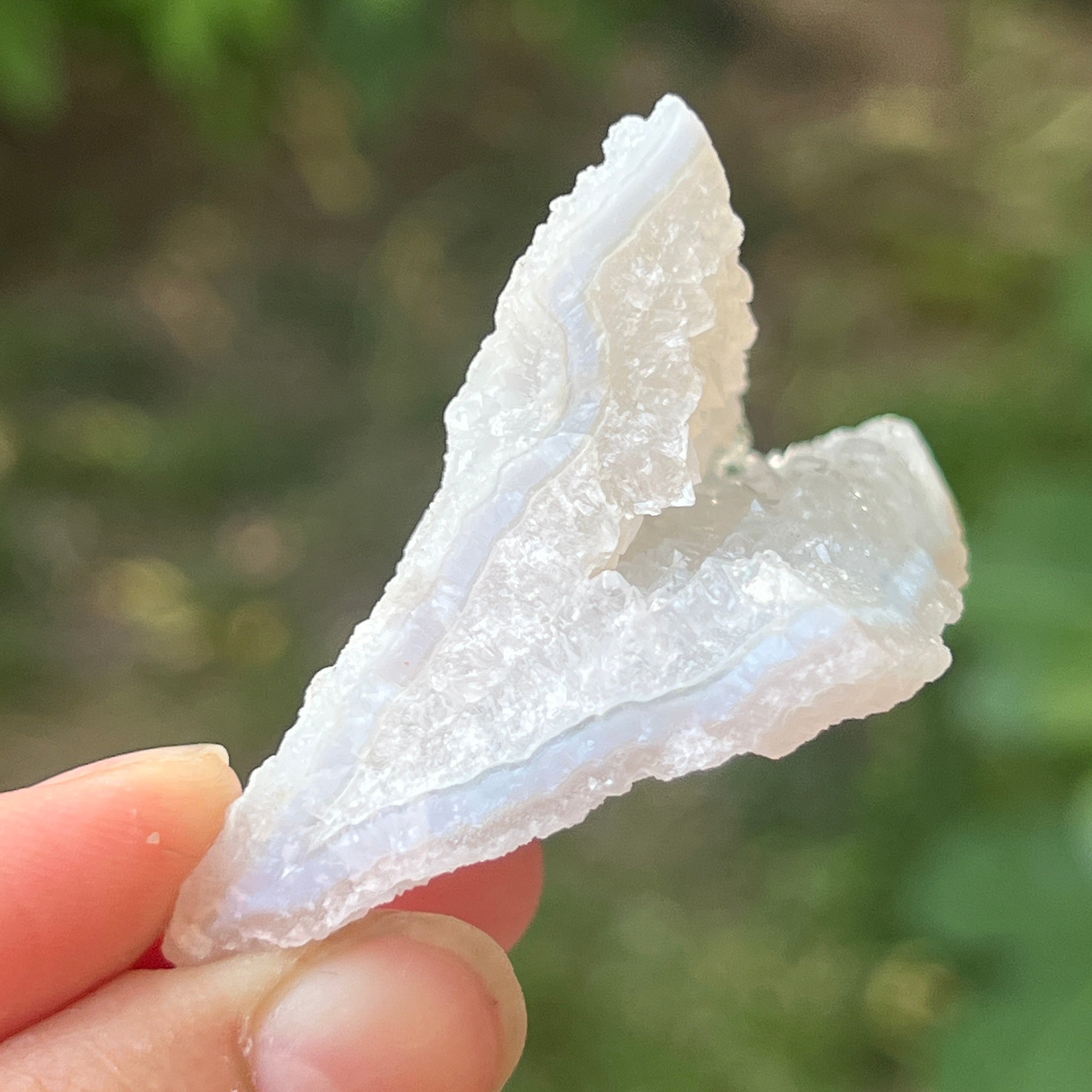 Μπλε δαντέλα και μπλε δαντελωτό δαντελωτό δείγμα, από Nsanje, Μαλάουι. Αυτοί οι ειδικοί σχηματισμοί περνούν από μια πολύπλοκη διαδικασία όξινων λουτρών στη Νότιο Αφρική, η οποία απομακρύνει σχολαστικά τα περισσότερα ή όλα τα ίχνη της μήτρας, αφήνοντας πίσω την καθαρή μπλε δαντέλα και μπλε Chalcedon από μια αξιοσημείωτη ομορφιά.
