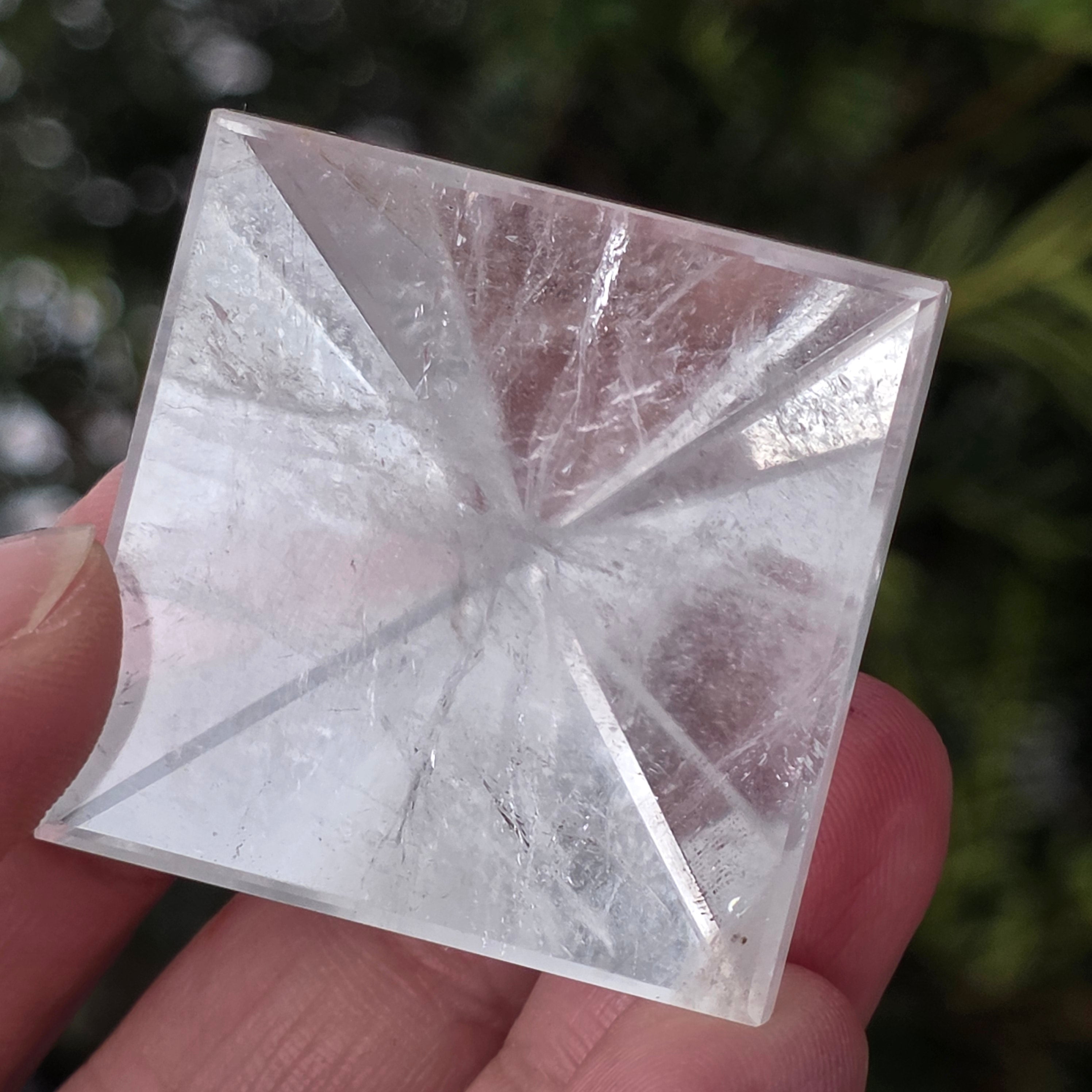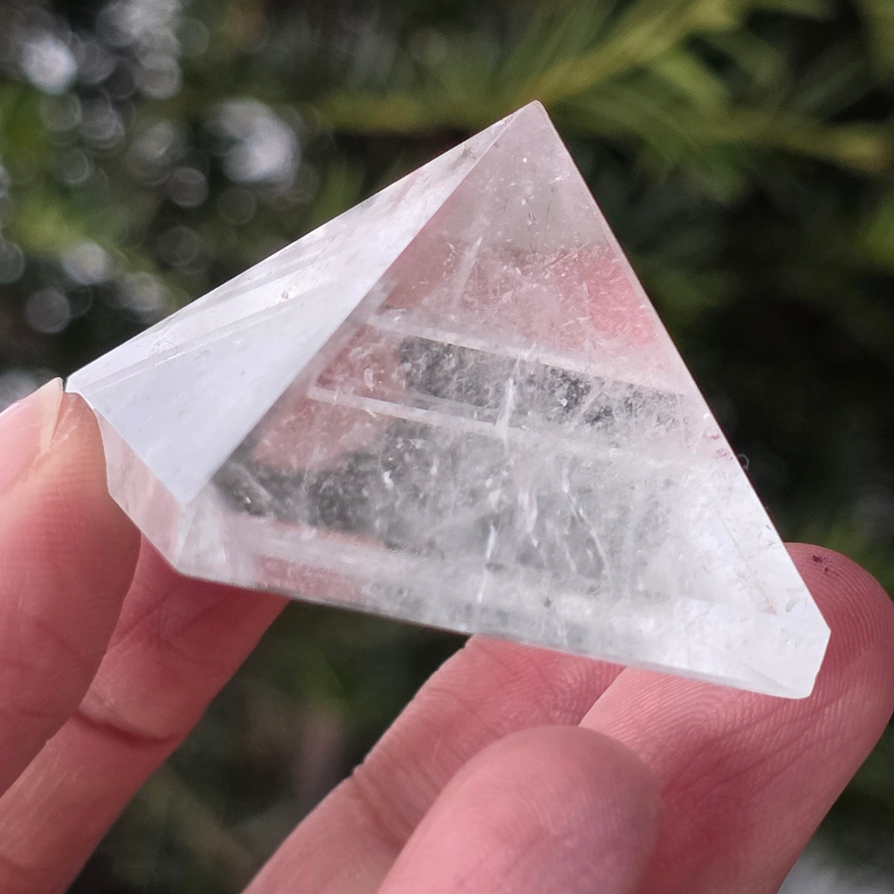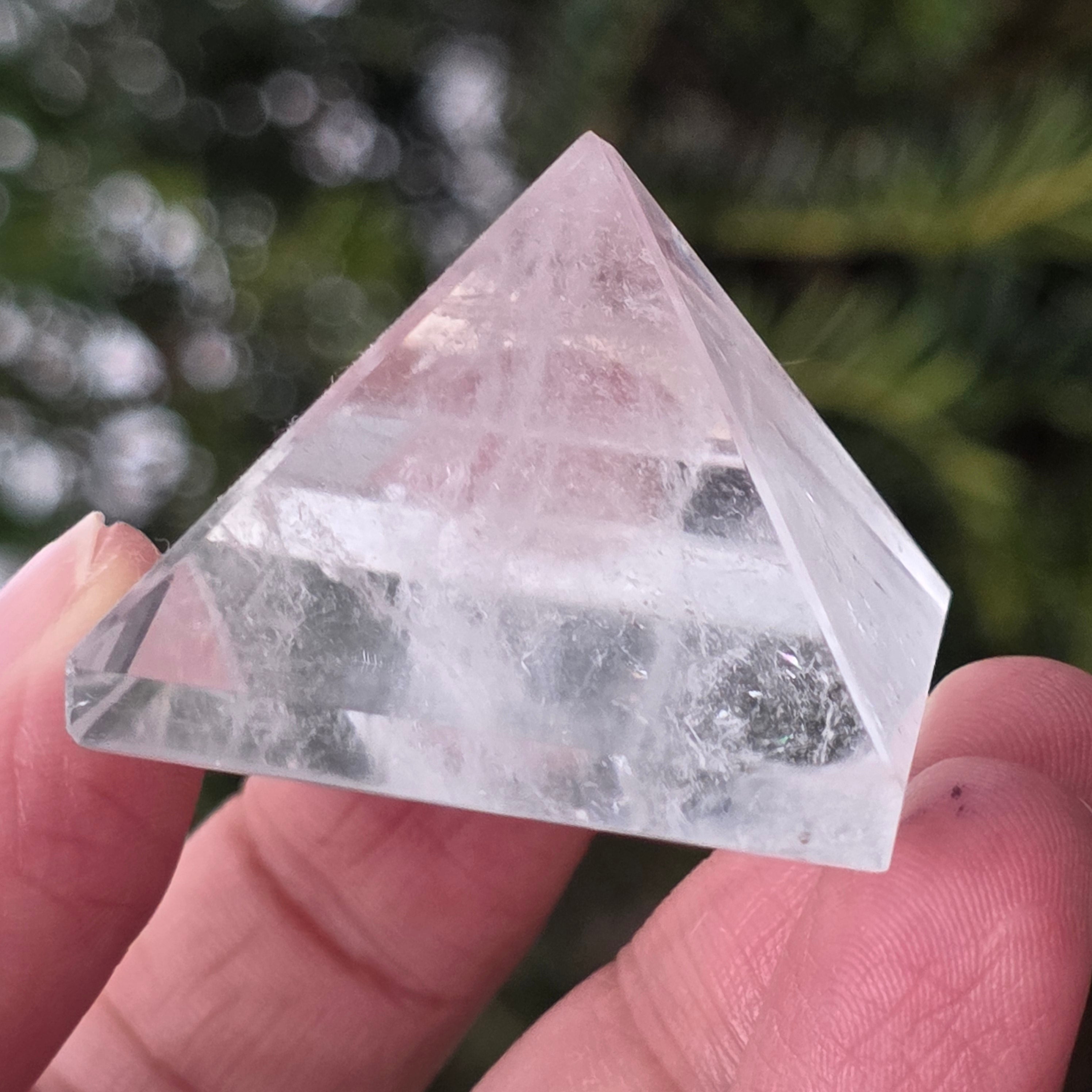 Η πυραμίδα από διαφανή χαλαζία σχετίζεται με την καθαρότητα, την ενίσχυση της πρόθεσης και την ενεργειακή ισορροπία, με το σχήμα της να συγκεντρώνει και να κατευθύνει την ενέργεια με έναν οργανωμένο τρόπο. Χρησιμοποιείται συχνά ως σύμβολο του καθαρού μυαλού και της αρμονίας μεταξύ σκέψης, συναισθήματος και πράξης.