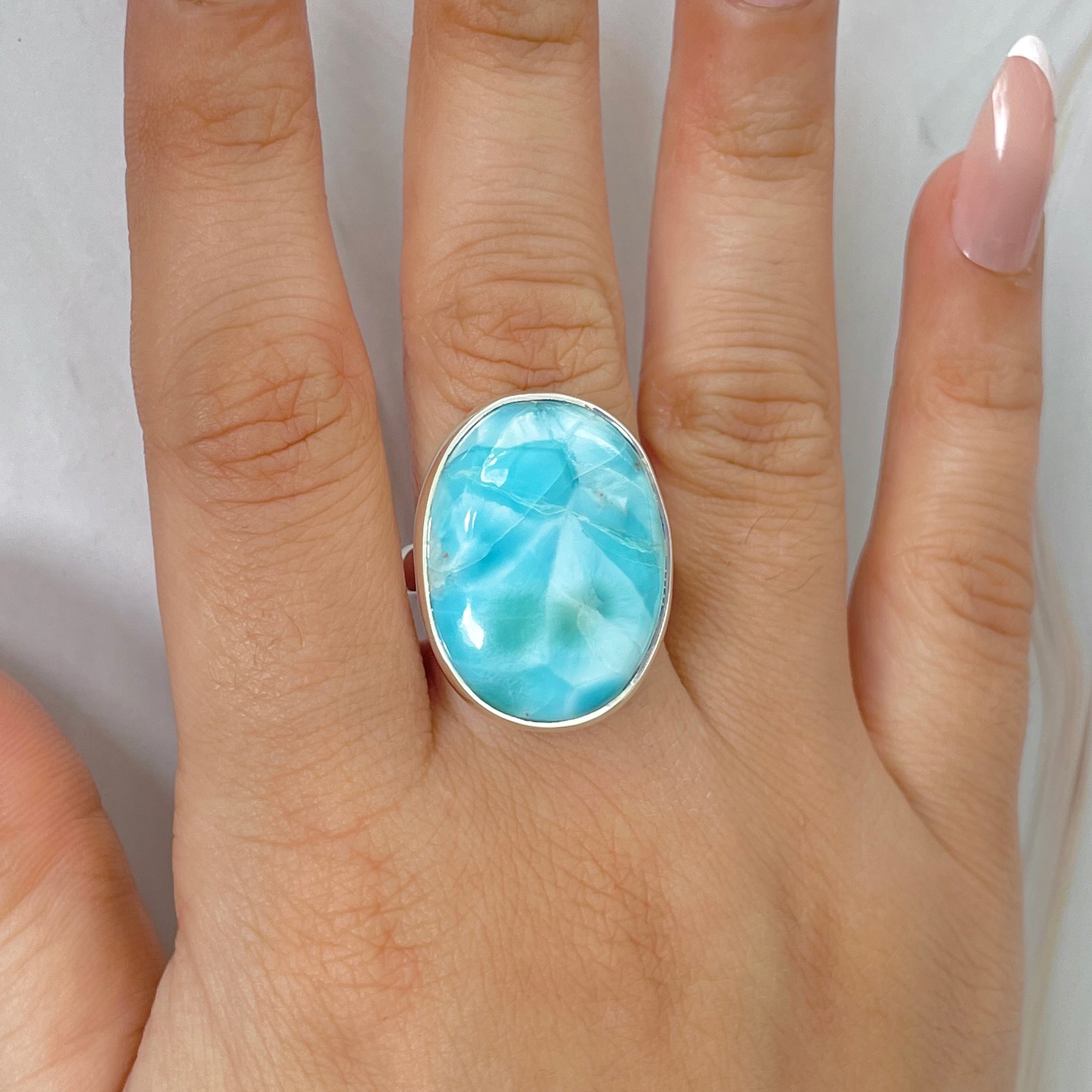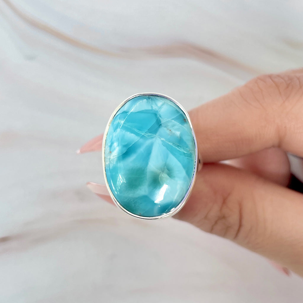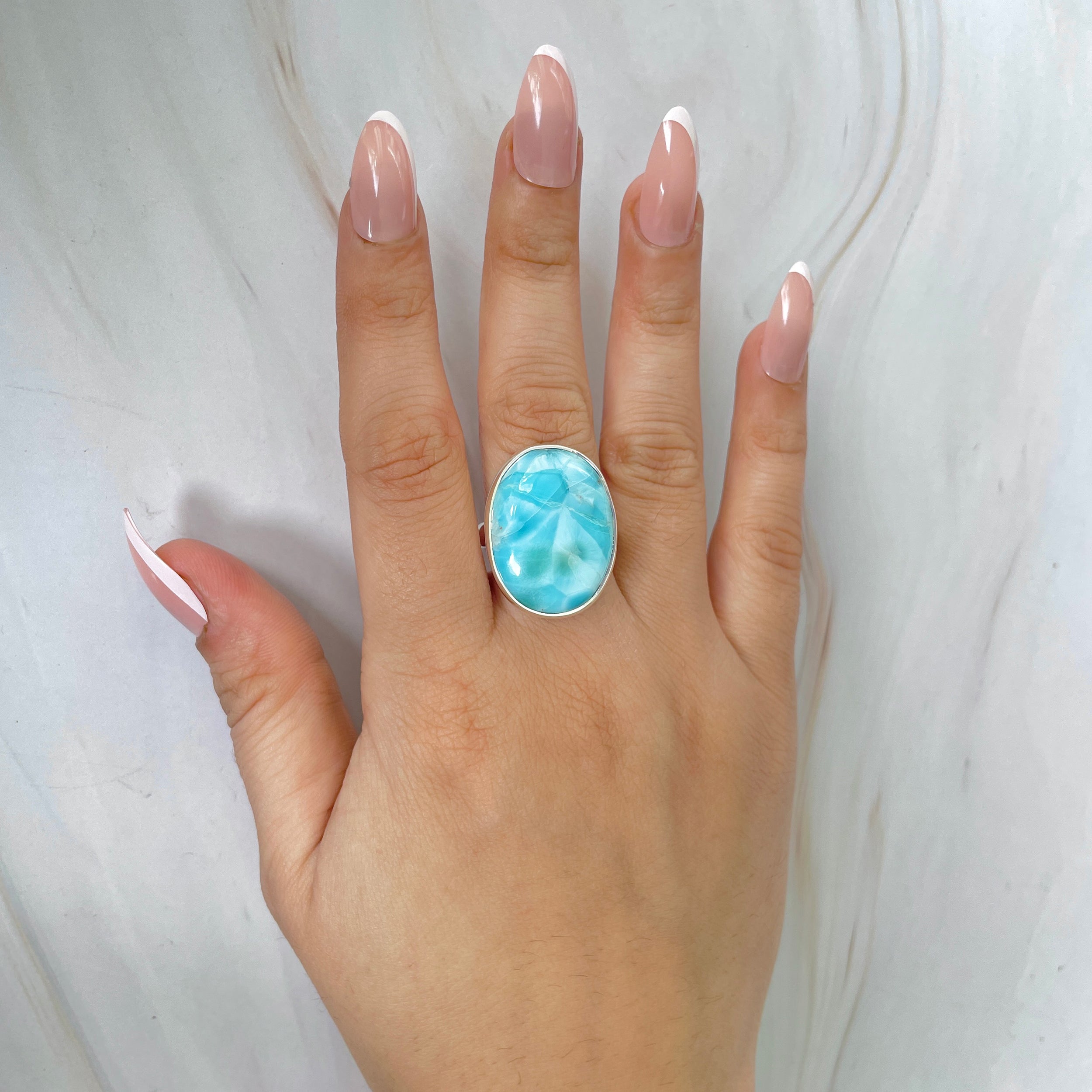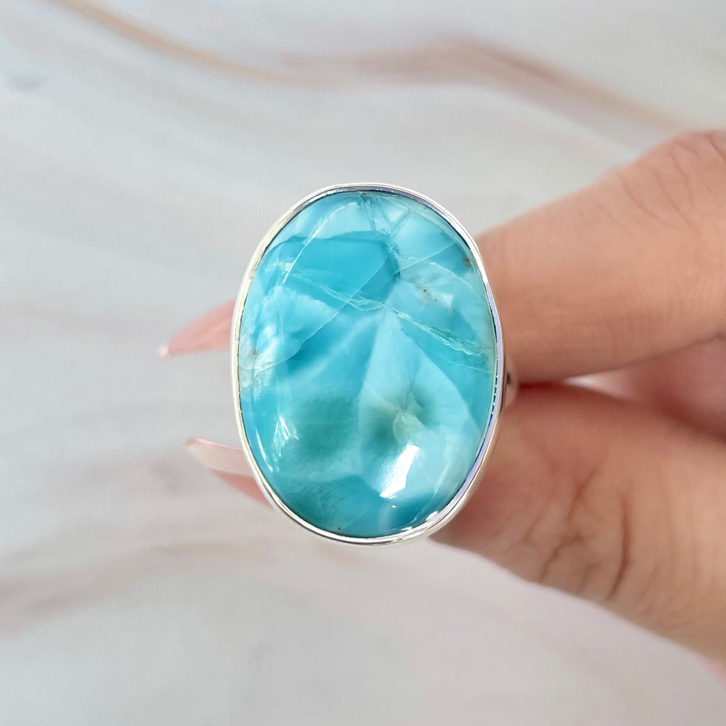 Ένα μοναδικό δαχτυλίδι από φυσικό λαριμάρ, γνωστό ως straight πέτρα του ουρανού και του ωκεανού. Οι αποχρώσεις του του aqua blue, με λευκές ανταύγειες όπως τα κύματα της θάλασσας, φέρνουν εσωτερική γαλήνη και μια αίσθηση απέραντης ελευθερίας.