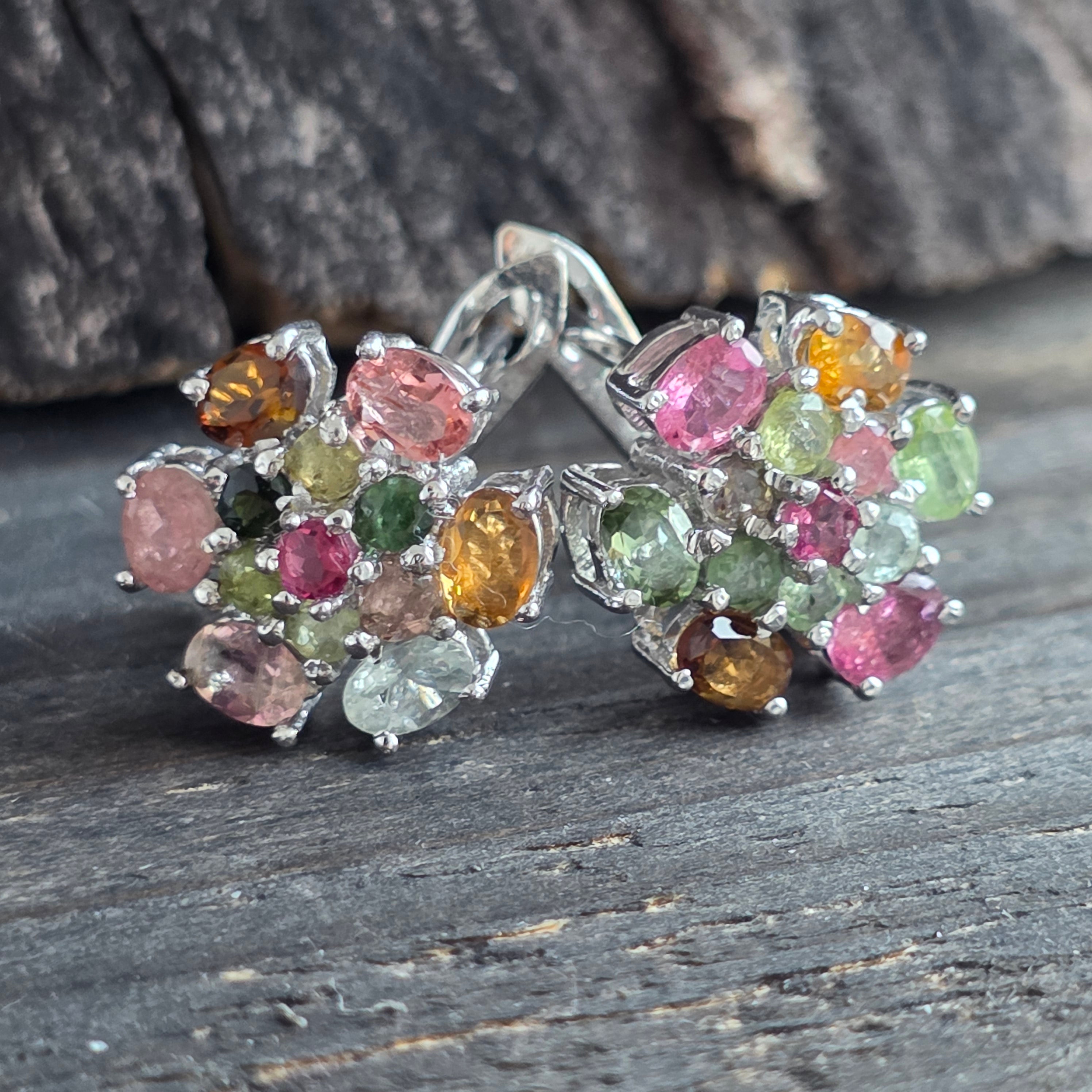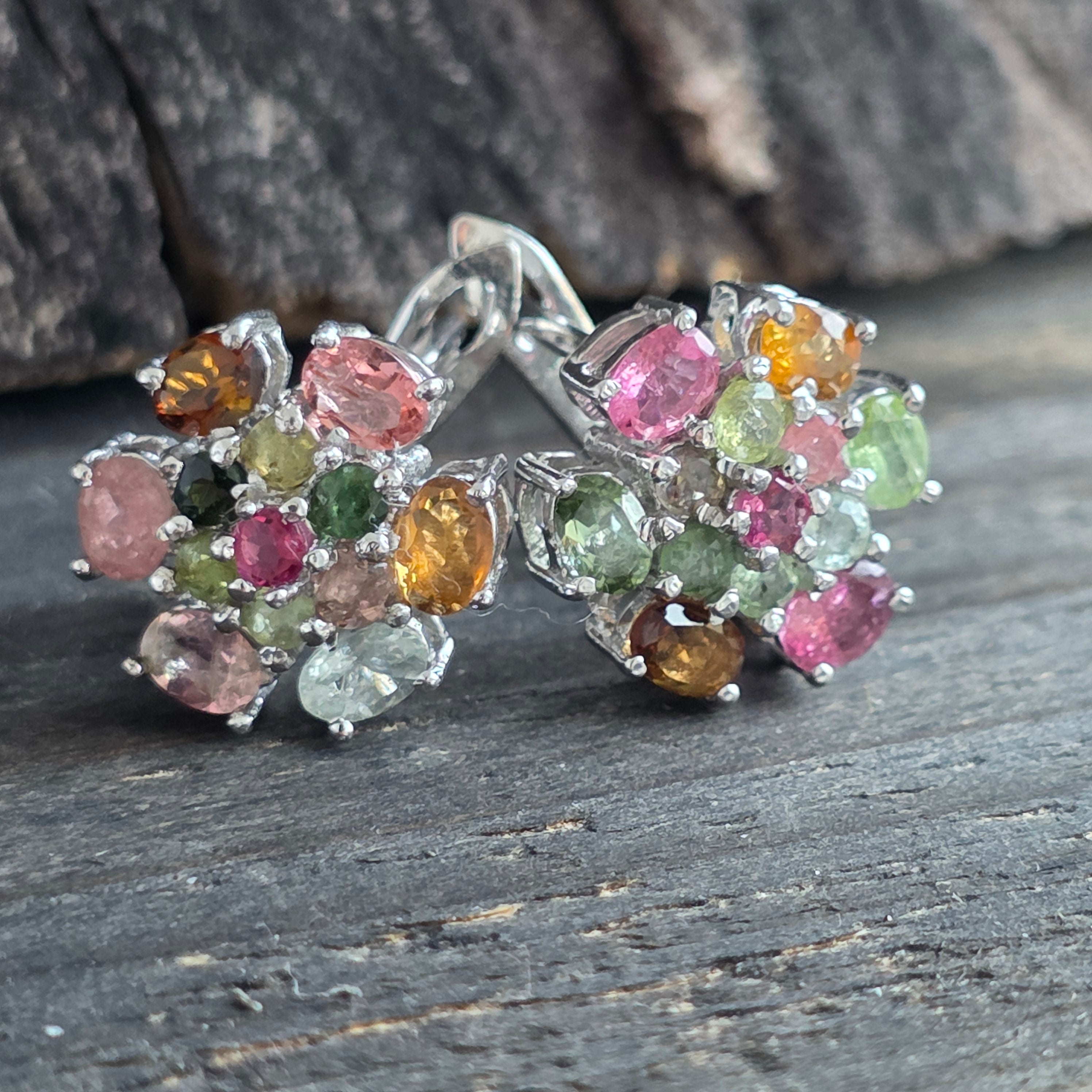 Αυτά τα σκουλαρίκια είναι φτιαγμένα από στερεό ασήμι 925,επικαλυμμένο με ρόδιο για μακρά διάρκεια λάμψης και προστασία από την οξείδωση. Ο λεπτός τους σχεδιασμός, σε μορφή φλοράλ συστάδας, συνδυάζει προσεκτικά κομμένες πολύχρωμες τουρμαλίνες σε οβάλ και στρογγυλά σχήματα,δημιουργώντας ένα αρμονικό παιχνίδι αποχρώσεων – από ροζ και πράσινο, έως κίτρινο και ζεστούς γήινους τόνους.
