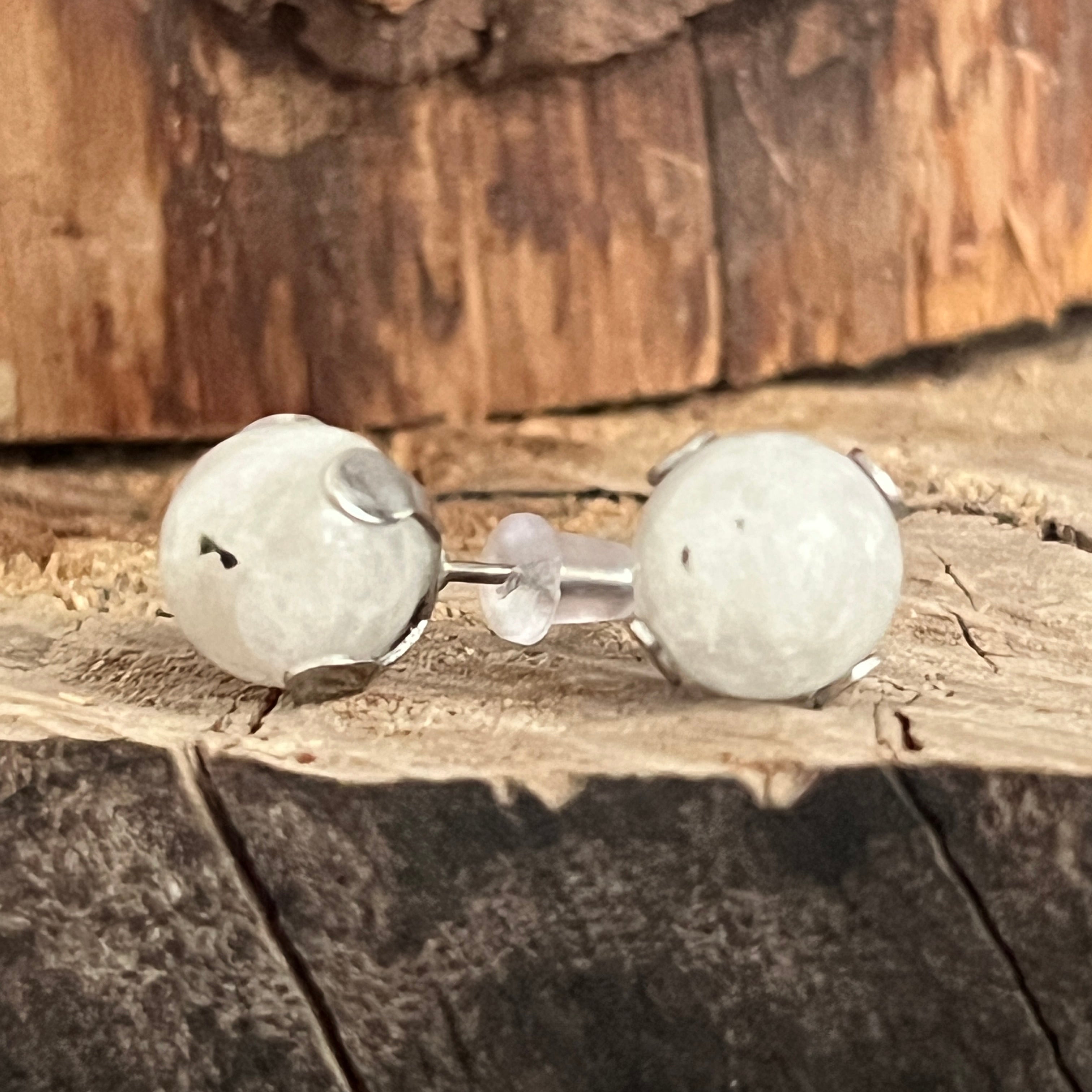 Αυτά Φεγγαρόπετρα καρφωτά σκουλαρίκια φαίνονται φτιαγμένα από μια ακτίνα φωτός—τέλεια στρογγυλές σφαίρες που αντανακλούν απαλά μαργαριταρένιες αποχρώσεις και μπλε ιριδισμό, σαν την αντανάκλαση μιας καθαρής καλοκαιρινής νύχτας.