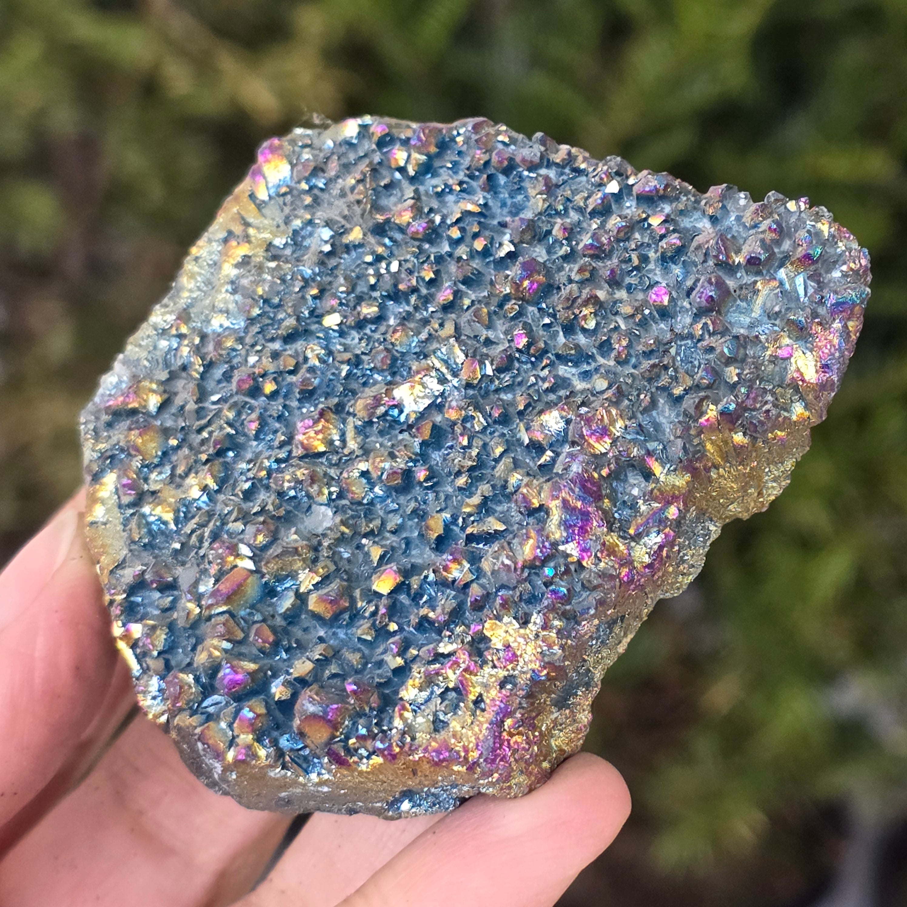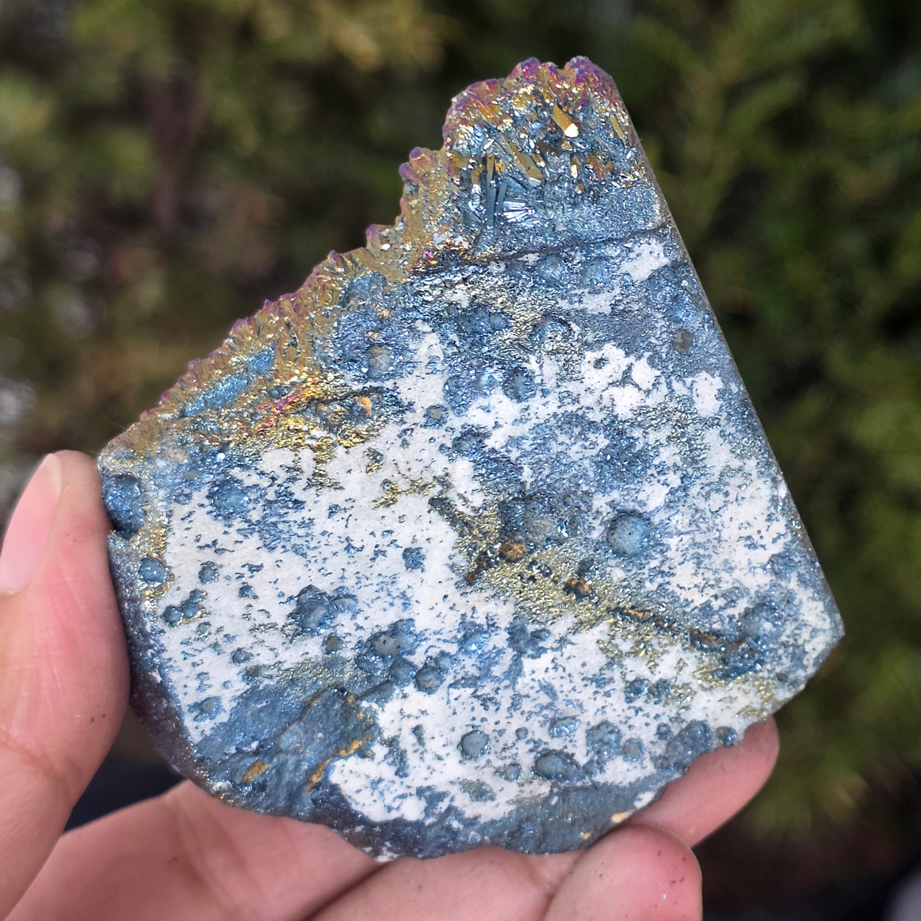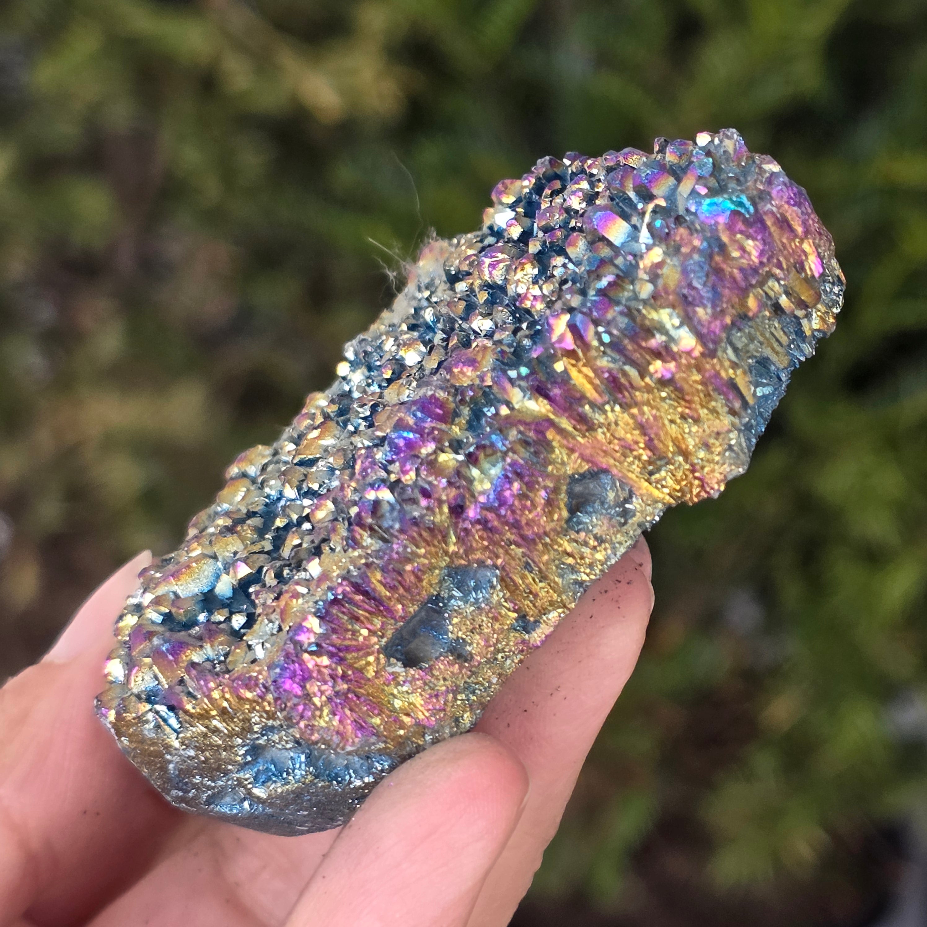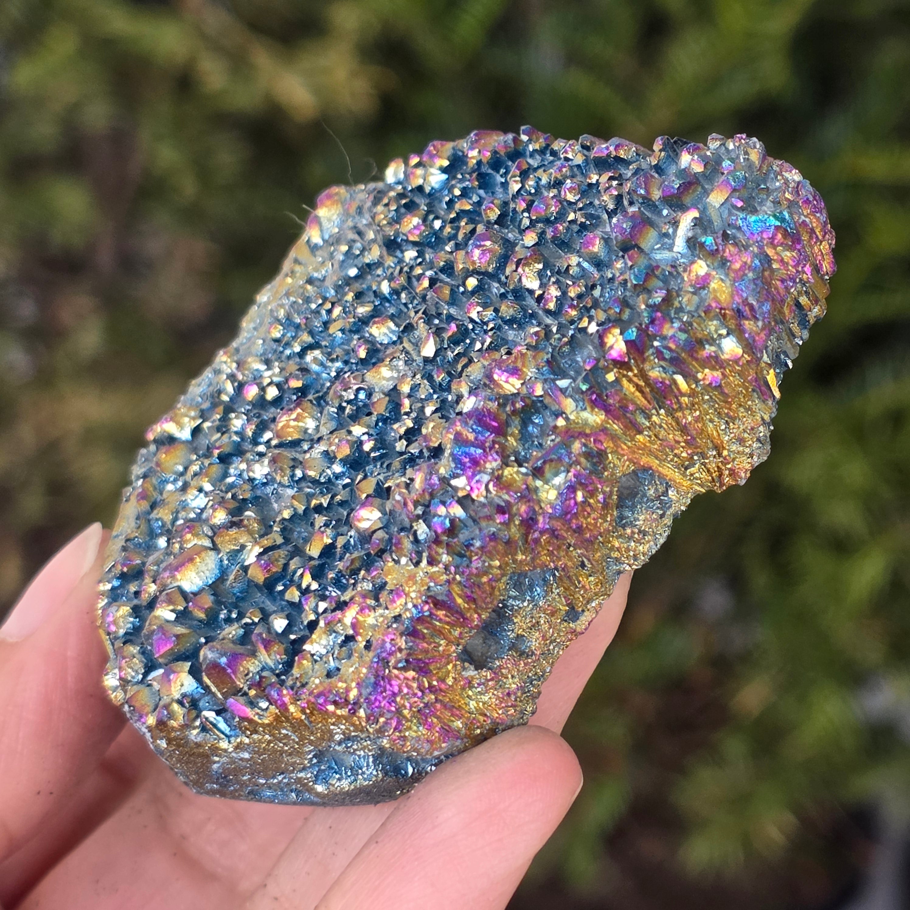 Αυτή η επεξεργασία δεν αλλάζει τη βασική δομή του χαλαζία, αλλά ενισχύει την οπτική του εμφάνιση, προσφέροντας ένα ζωντανό και μοντέρνο παιχνίδι χρωμάτων. Το αποτέλεσμα είναι ένα κομμάτι με μαγευτική εμφάνιση, όπου η καθαρή διαφάνεια του χαλαζία συνδυάζεται με πολύχρωμες μεταλλικές αντανακλάσεις.