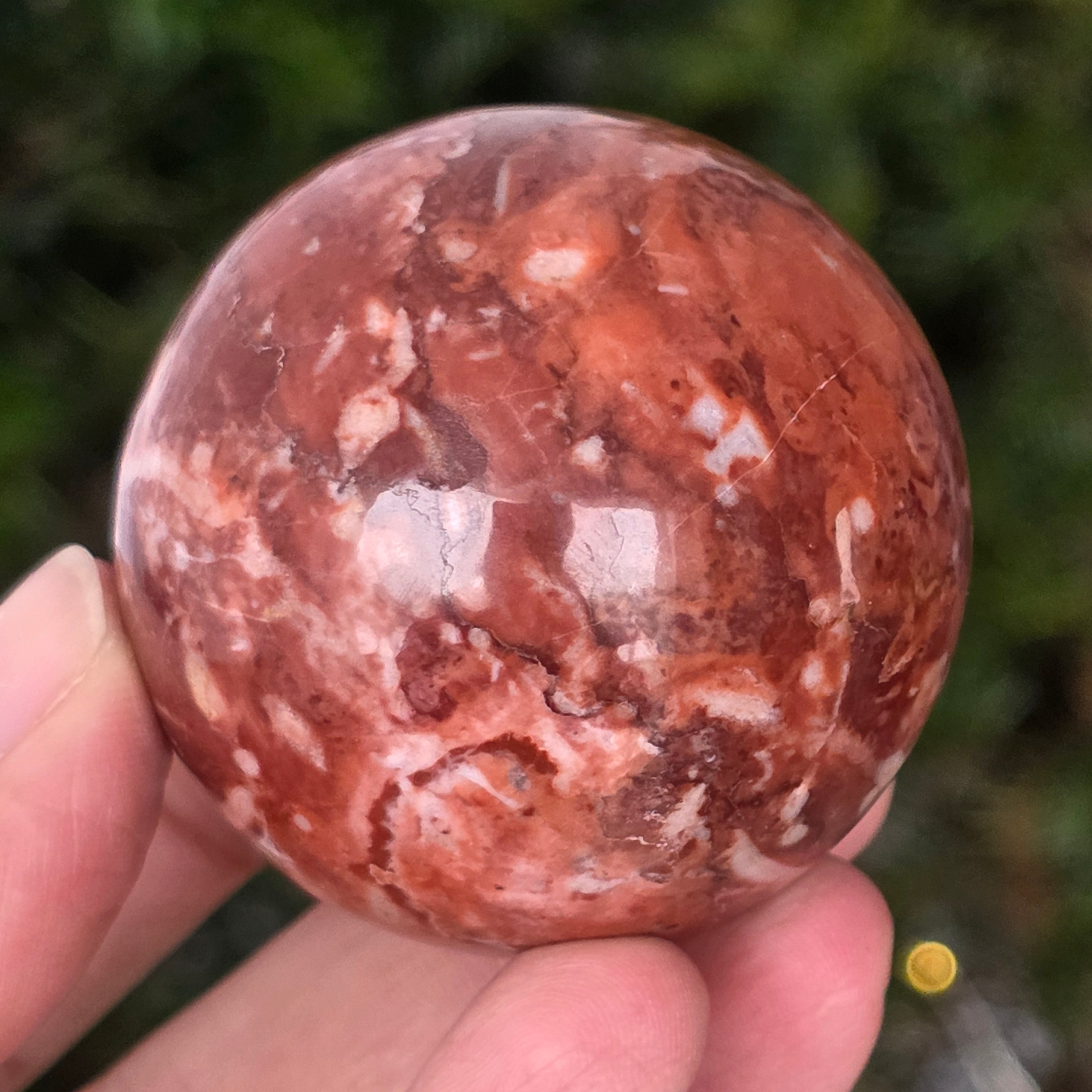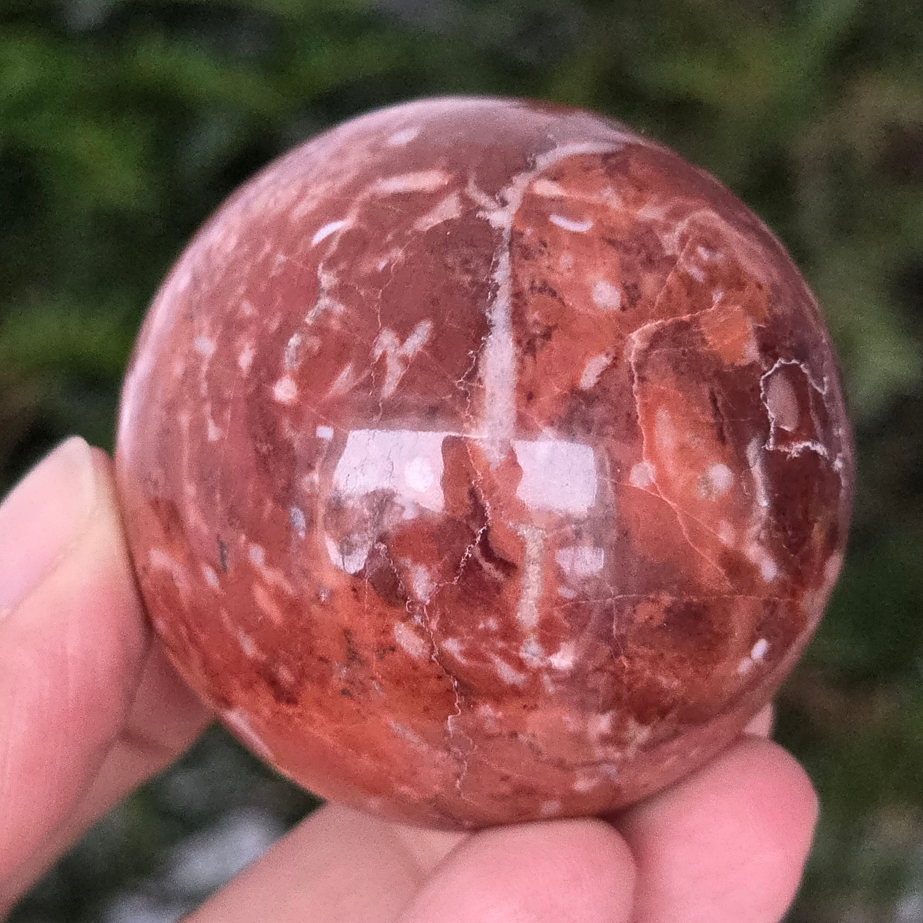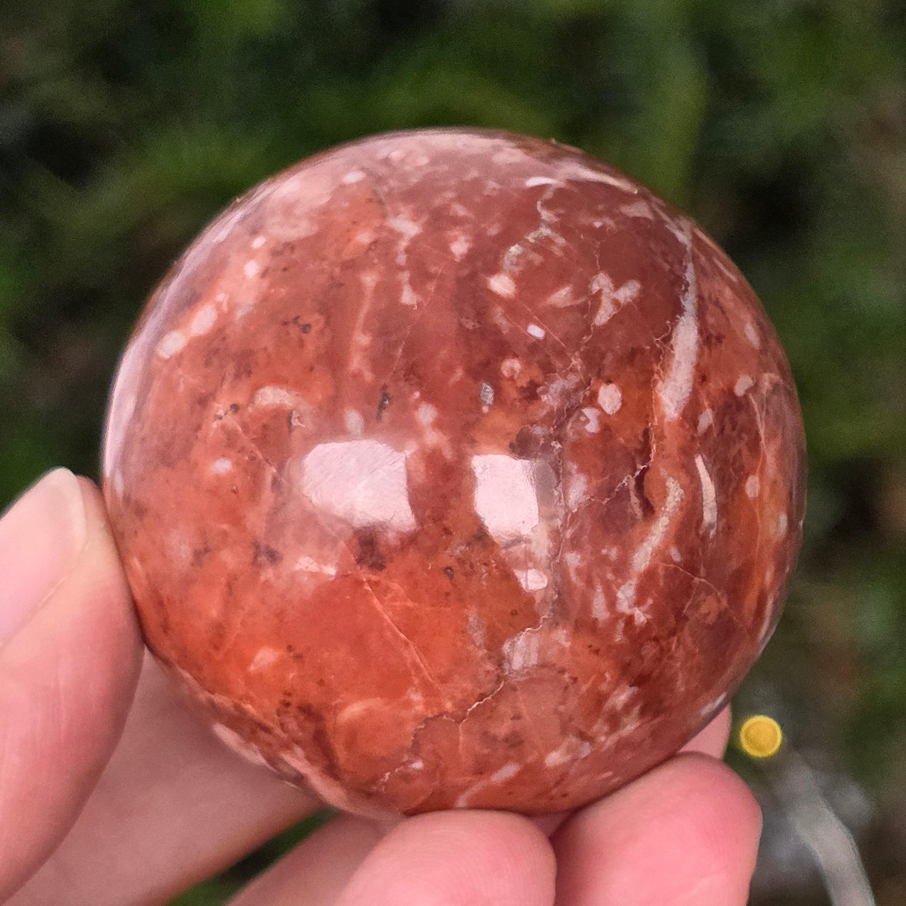 Διαμορφωμένη από τα βάθη της Γης, αυτή σφαίρα από κόκκινο ιασπίτη εκπέμπει ζεστή, σταθερή και βαθιά ριζωμένη ενέργεια. Η πέτρα, γνωστή από τα αρχαιότερα χρόνια ως «πέτρα της ζωτικότητας», φέρει τα χρώματα του αίματος και της εσωτερικής φωτιάς – σύμβολο ζωτικής δύναμης, θάρρους και επιμονής.