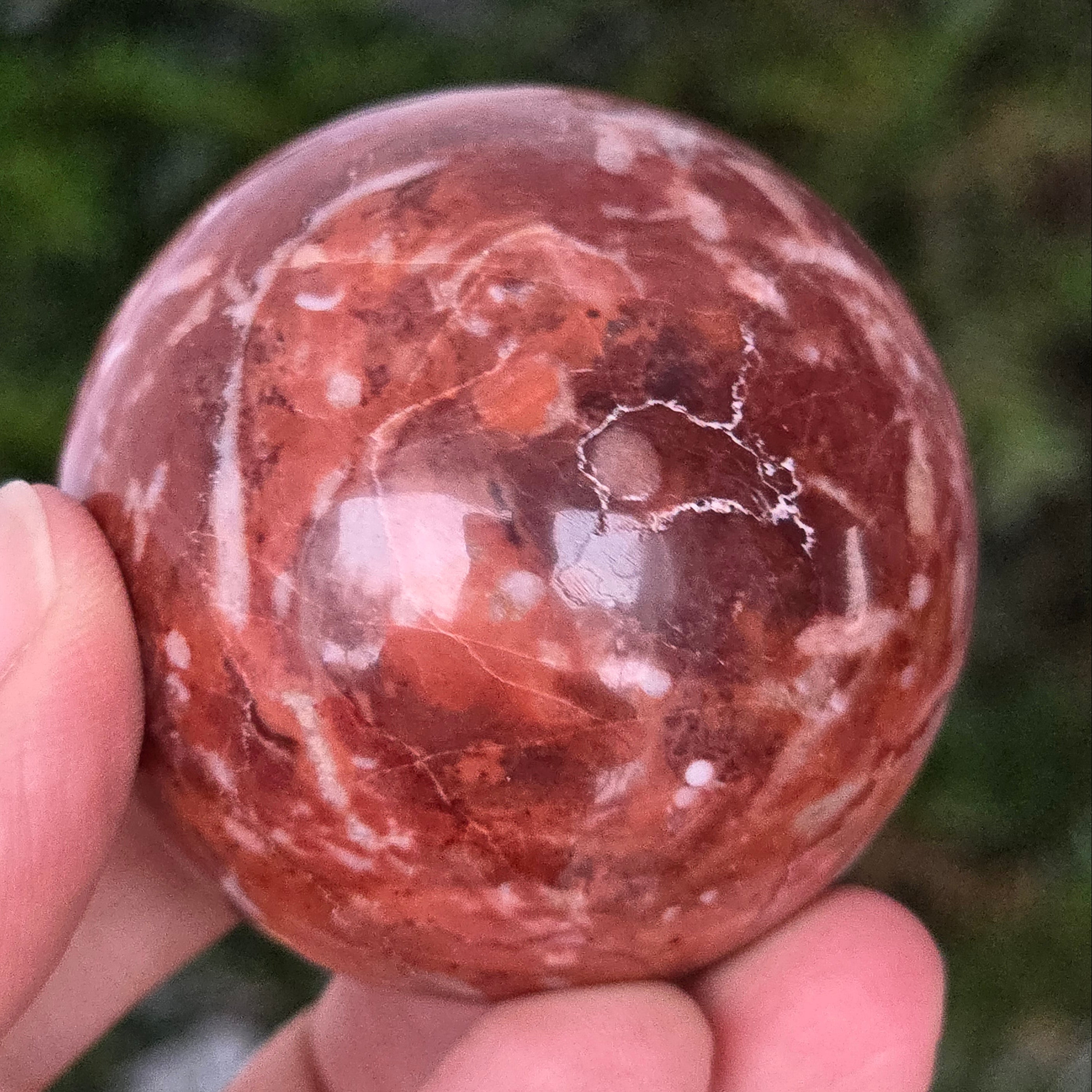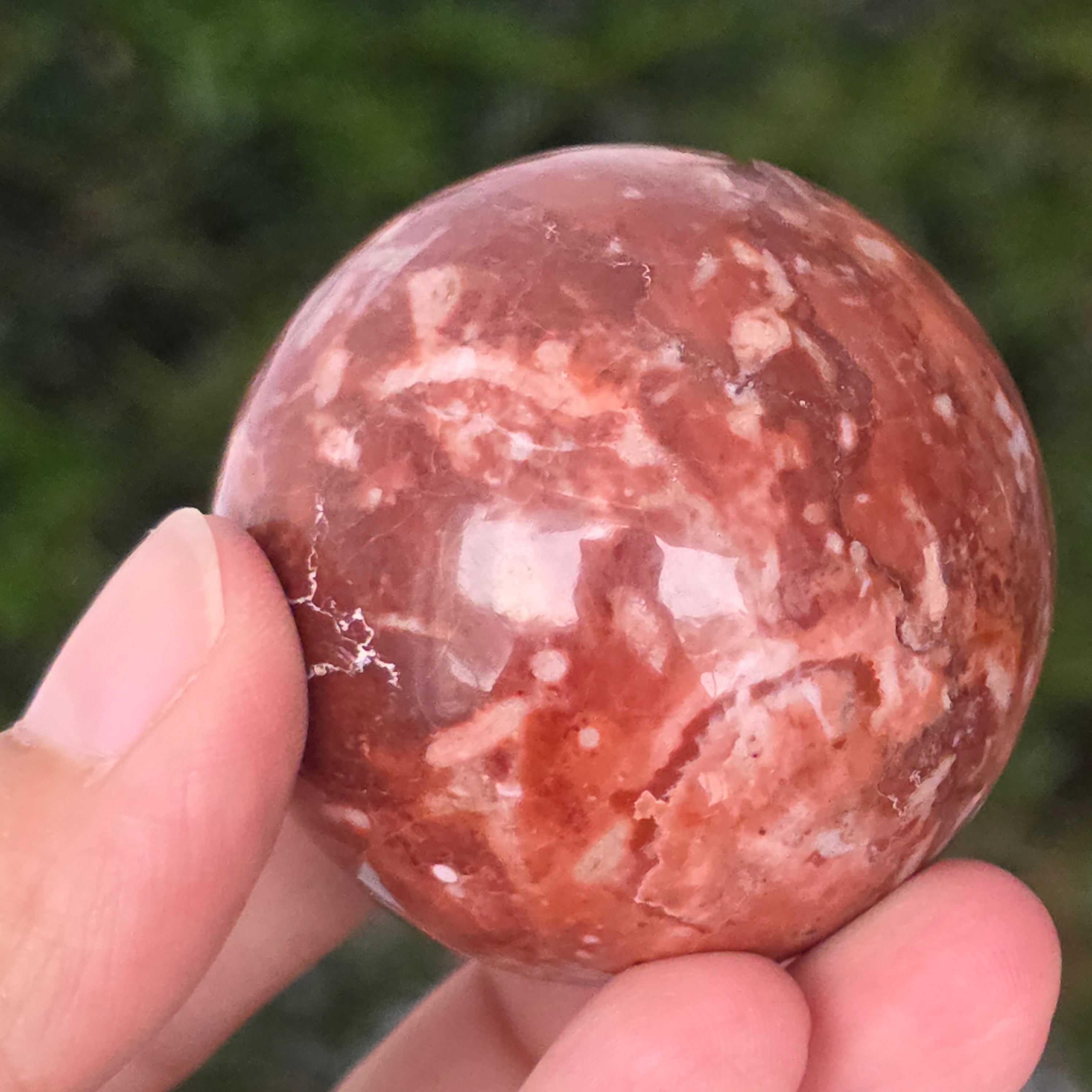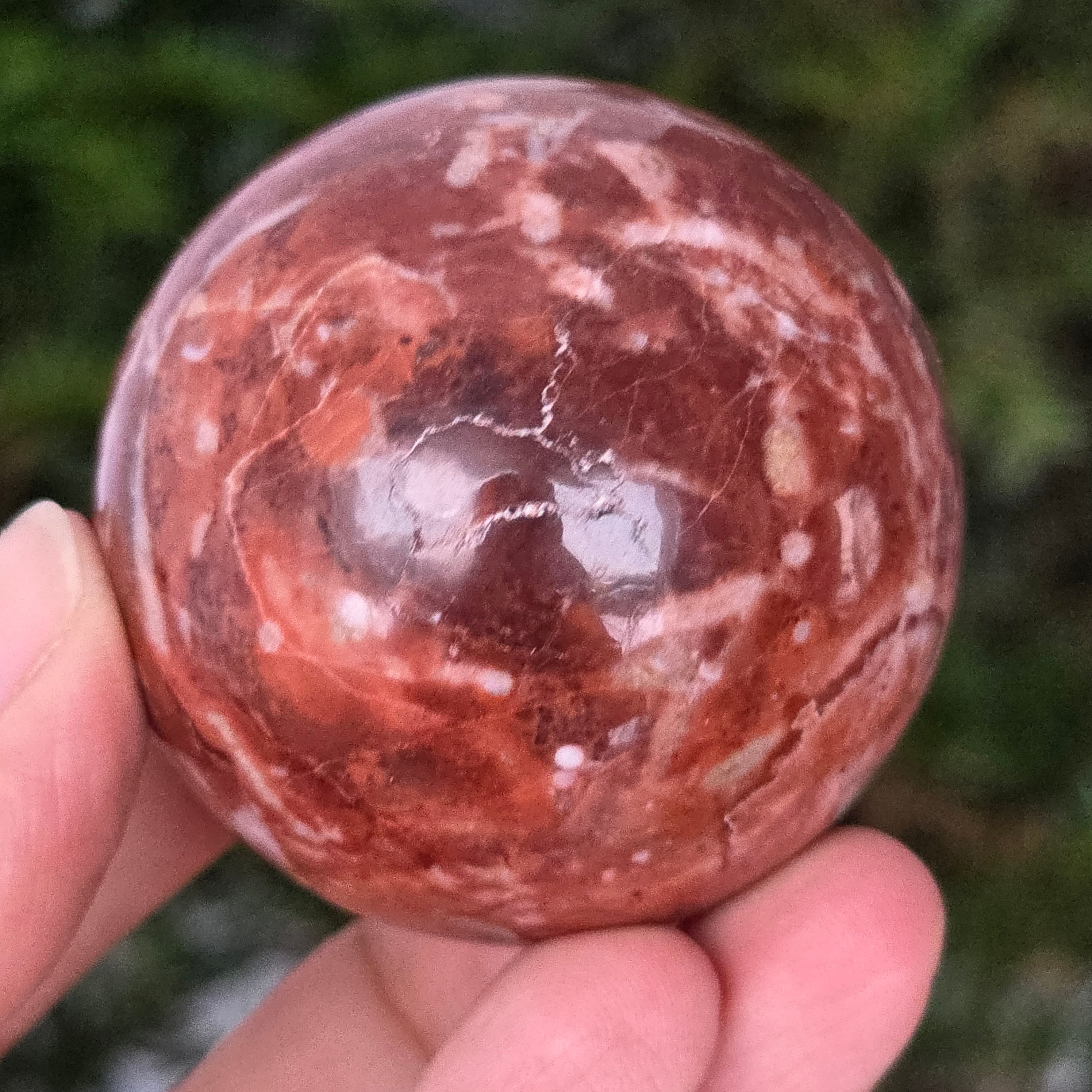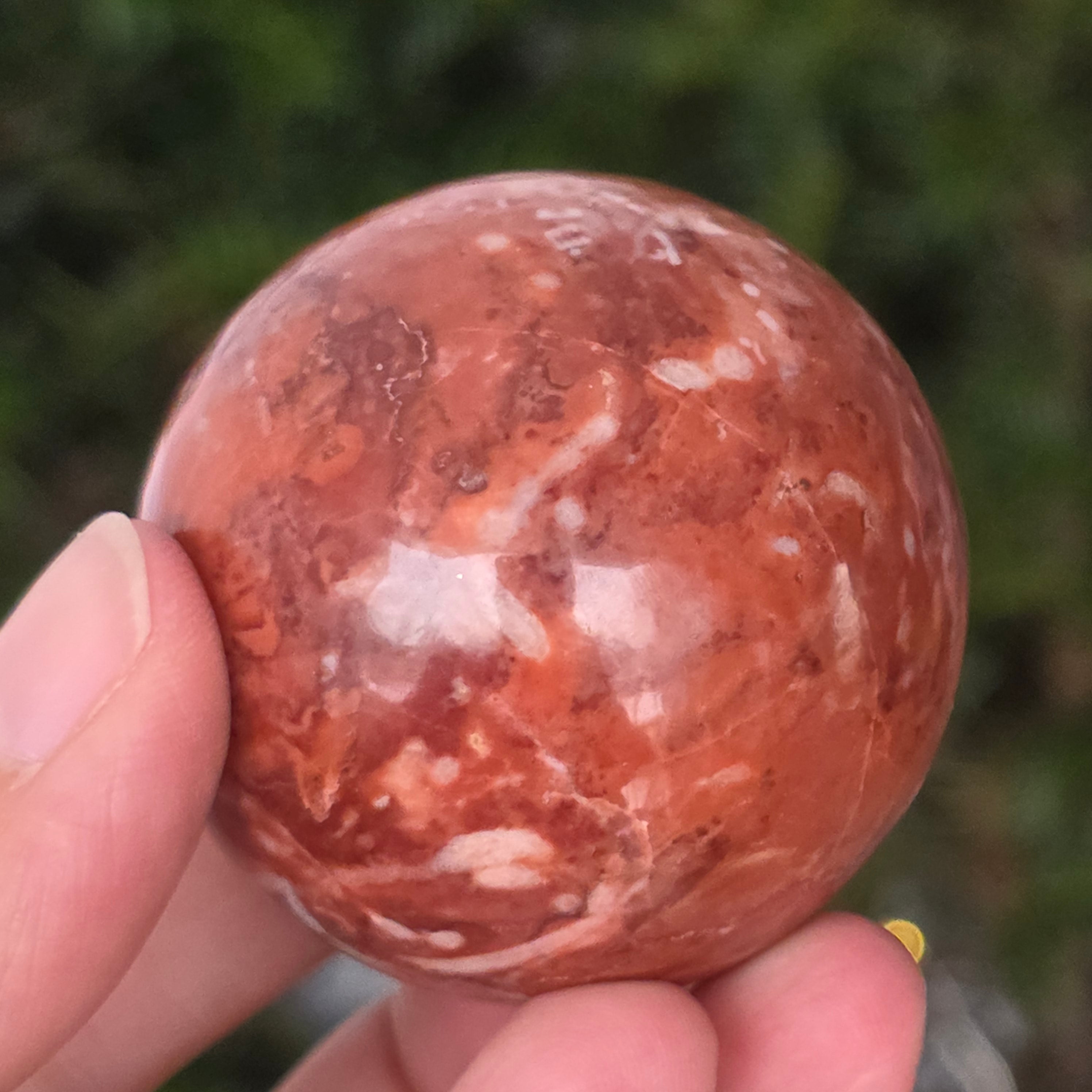 Διαμορφωμένη από τα βάθη της Γης, αυτή σφαίρα από κόκκινο ιασπίτη εκπέμπει ζεστή, σταθερή και βαθιά ριζωμένη ενέργεια. Η πέτρα, γνωστή από τα αρχαιότερα χρόνια ως «πέτρα της ζωτικότητας», φέρει τα χρώματα του αίματος και της εσωτερικής φωτιάς – σύμβολο ζωτικής δύναμης, θάρρους και επιμονής.