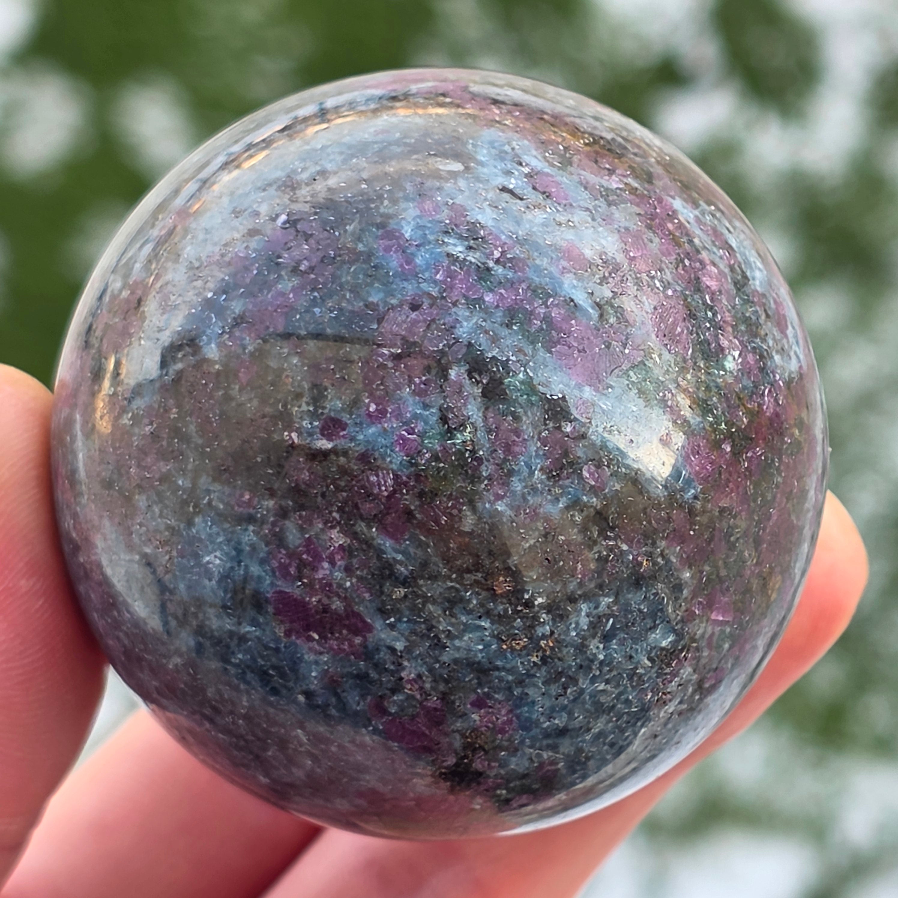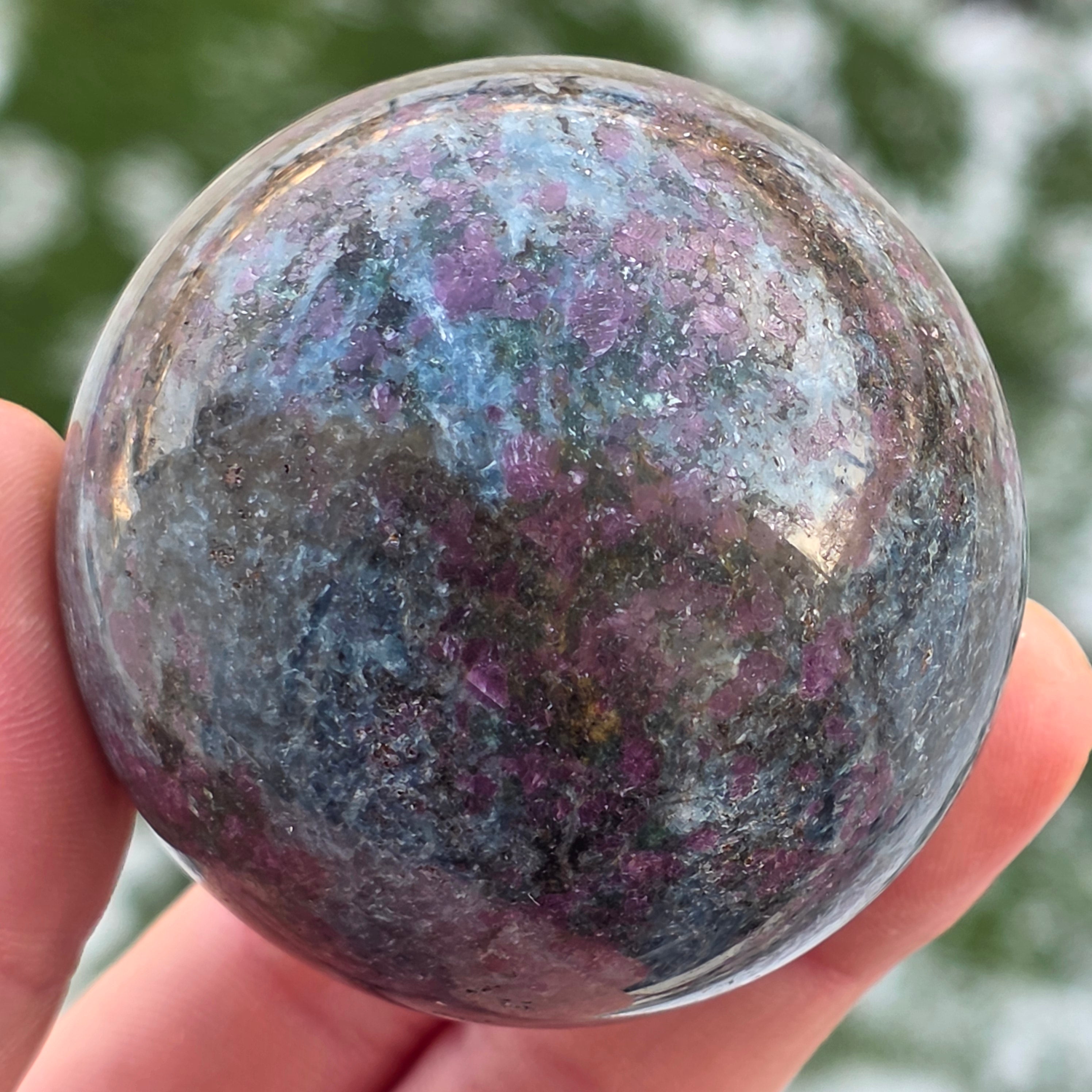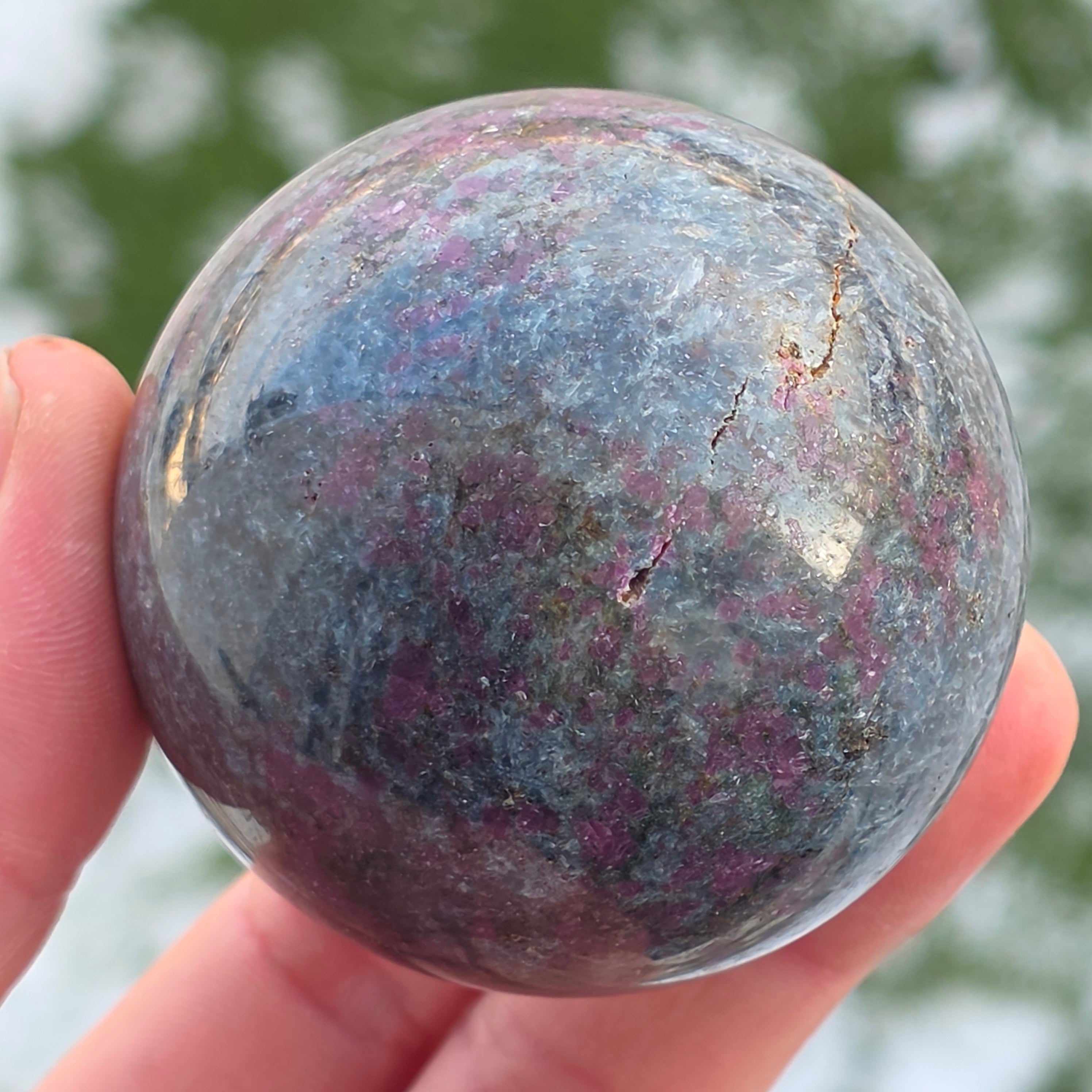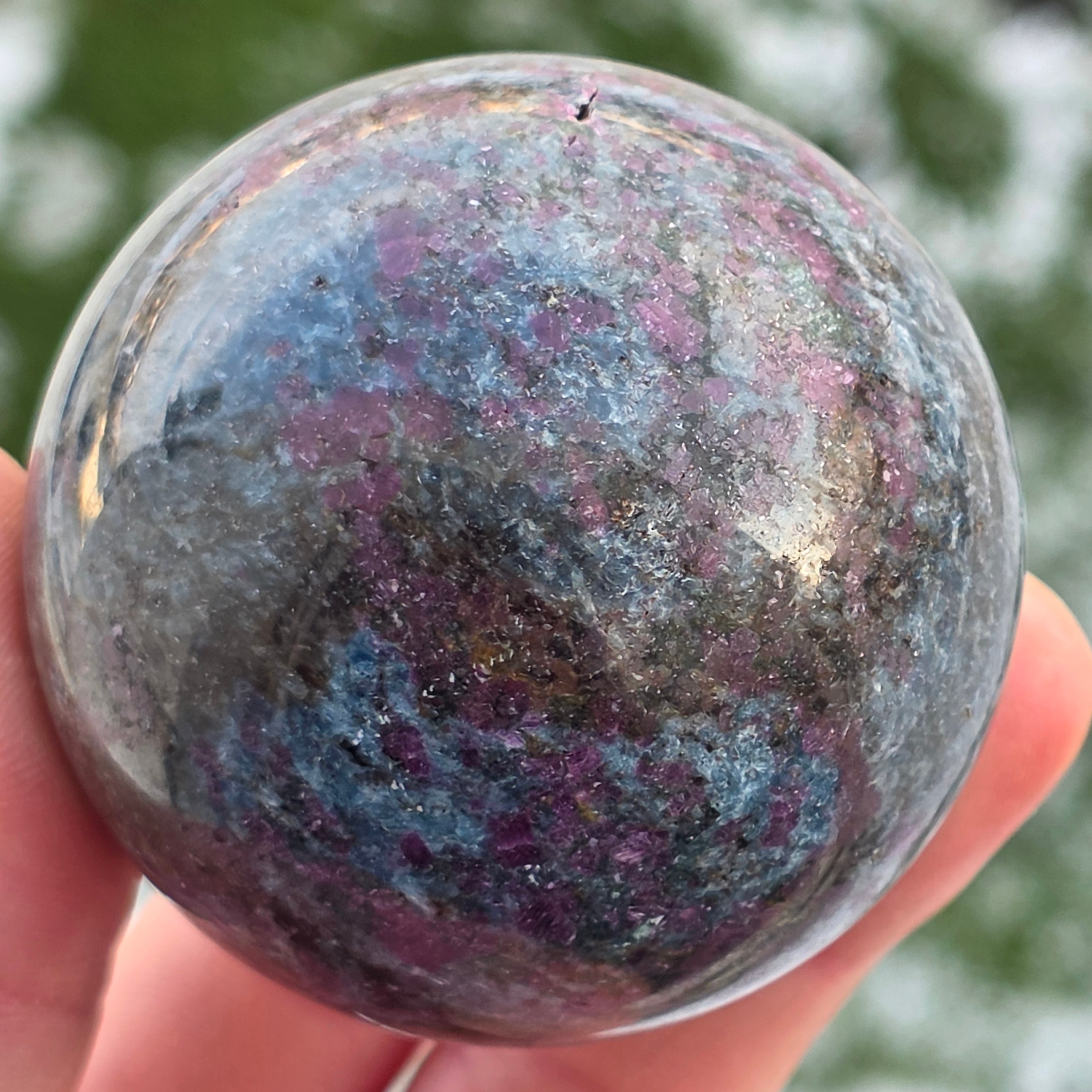 Η σφαίρα από ρουμπίνι σε φυξίτη με κιανίτη συνδυάζει τρεις συμπληρωματικές ενέργειες: τη ζωτικότητα του ρουμπινιού, την αναζωογονητική ηρεμία του φυξίτη και τη διαύγεια του κιανίτη. Το σφαιρικό σχήμα υποστηρίζει την ισορροπία μεταξύ πάθους, ηρεμίας και αυθεντικής έκφρασης, συνδεόμενο με την εναρμόνιση των συναισθημάτων και την ενίσχυση της σύνδεσης μεταξύ καρδιάς και νου.
