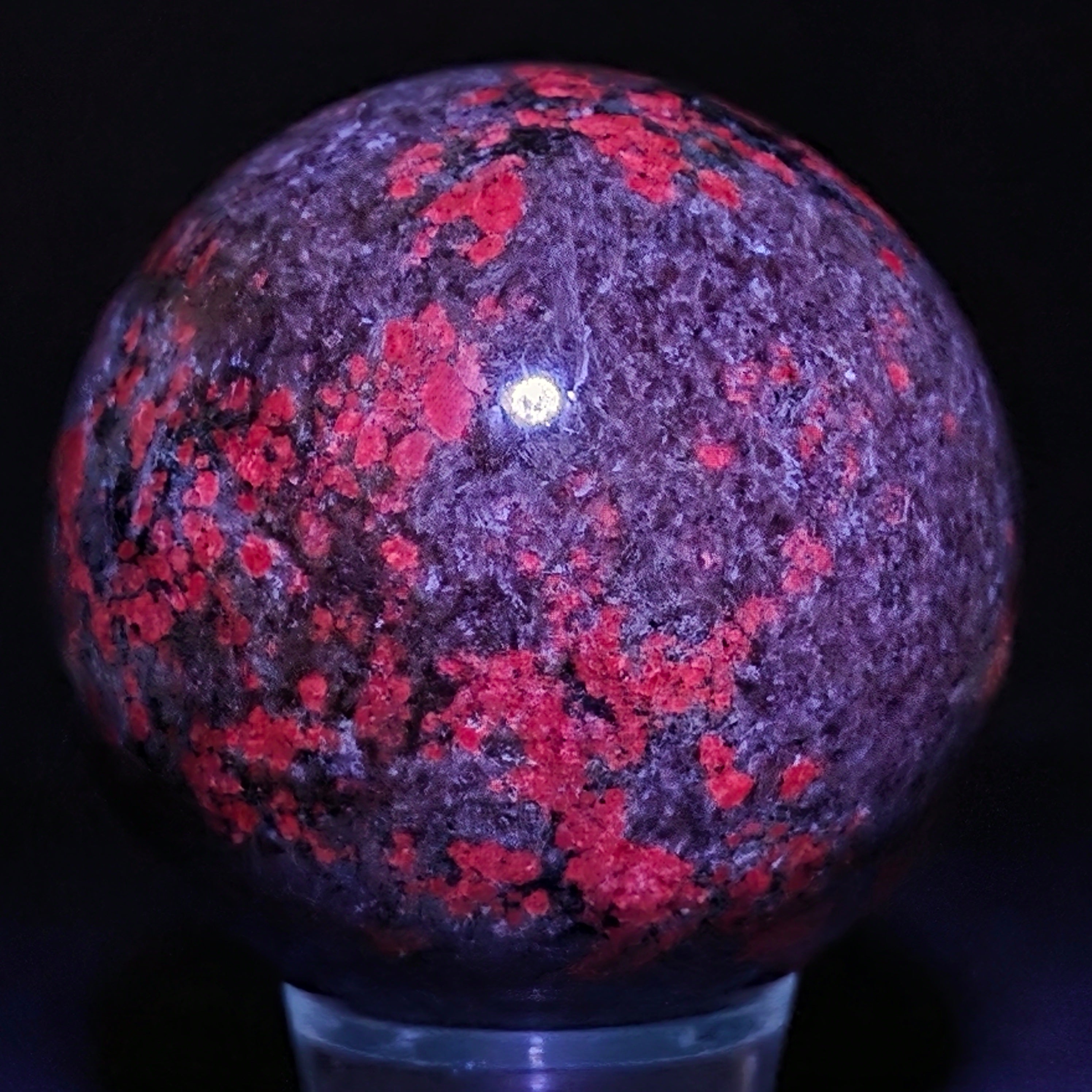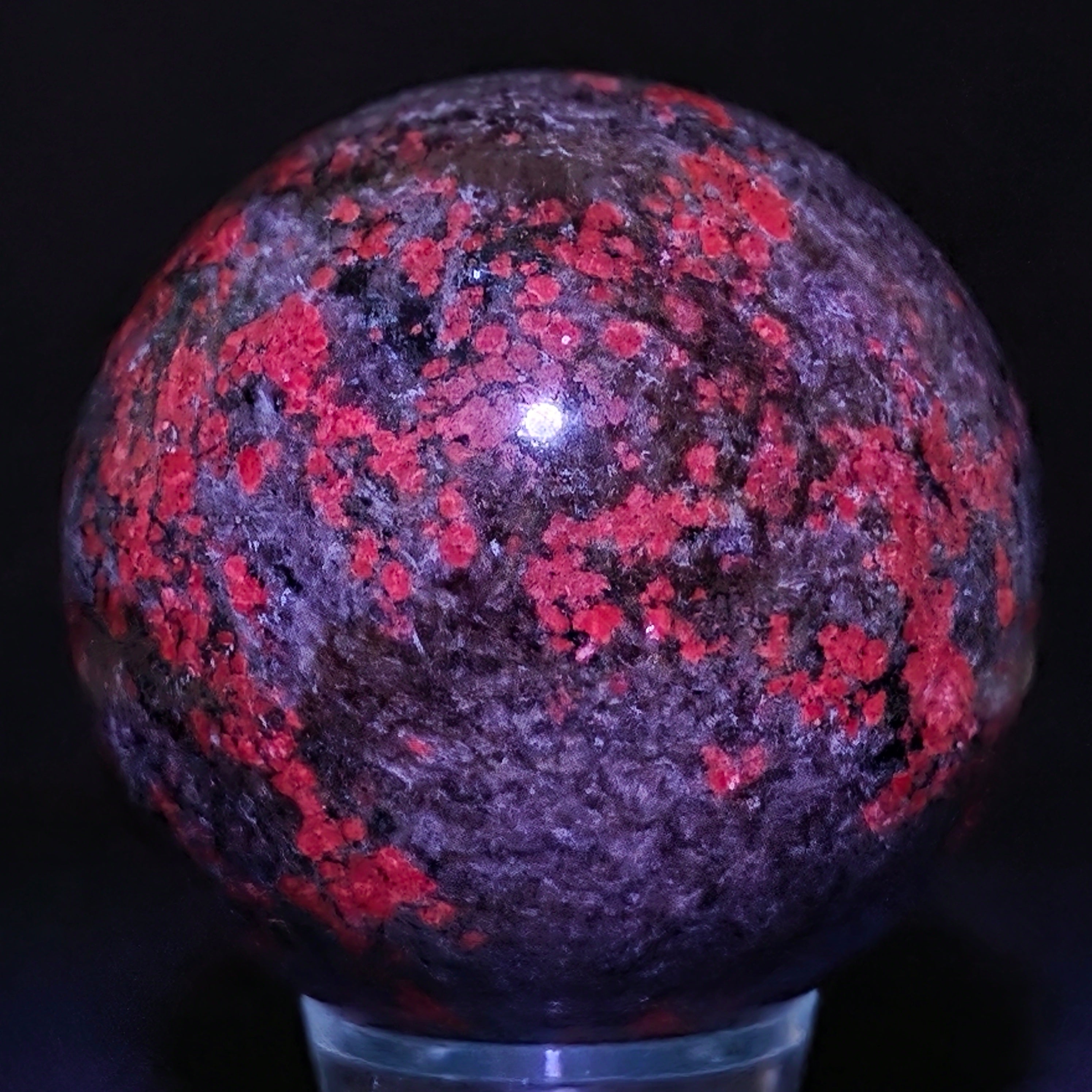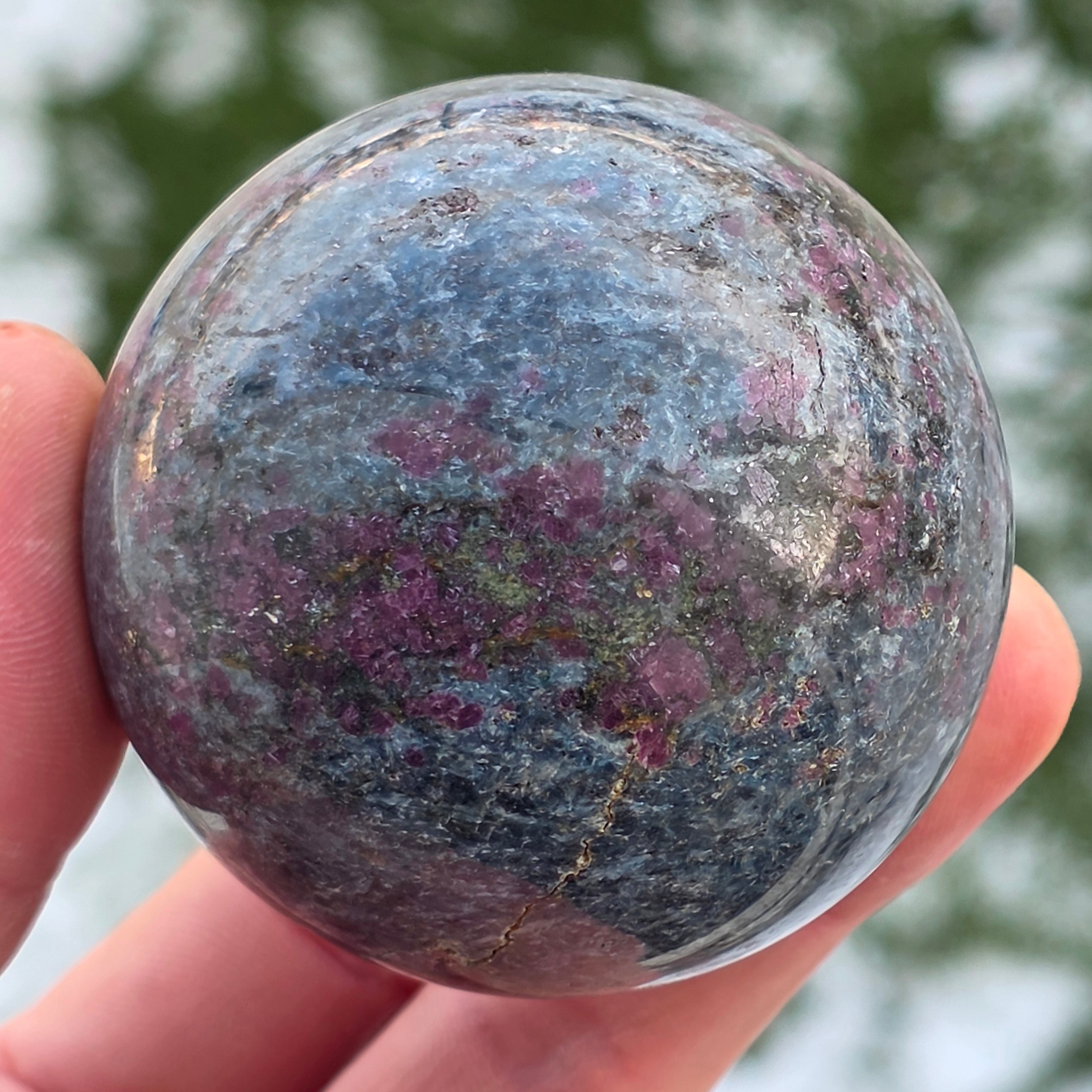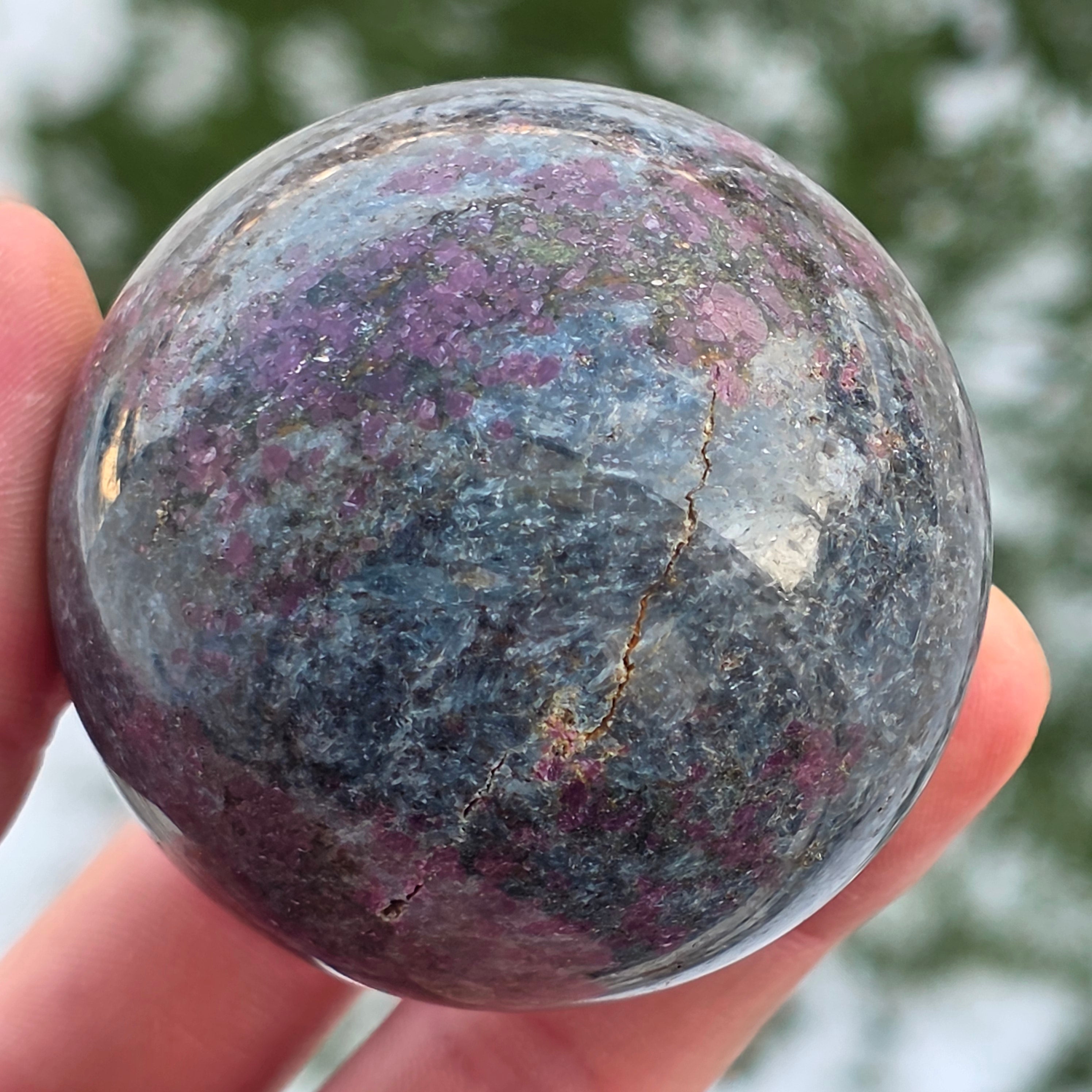 Η σφαίρα από ρουμπίνι σε φυξίτη με κιανίτη συνδυάζει τρεις συμπληρωματικές ενέργειες: τη ζωτικότητα του ρουμπινιού, την αναζωογονητική ηρεμία του φυξίτη και τη διαύγεια του κιανίτη. Το σφαιρικό σχήμα υποστηρίζει την ισορροπία μεταξύ πάθους, ηρεμίας και αυθεντικής έκφρασης, συνδεόμενο με την εναρμόνιση των συναισθημάτων και την ενίσχυση της σύνδεσης μεταξύ καρδιάς και νου.
