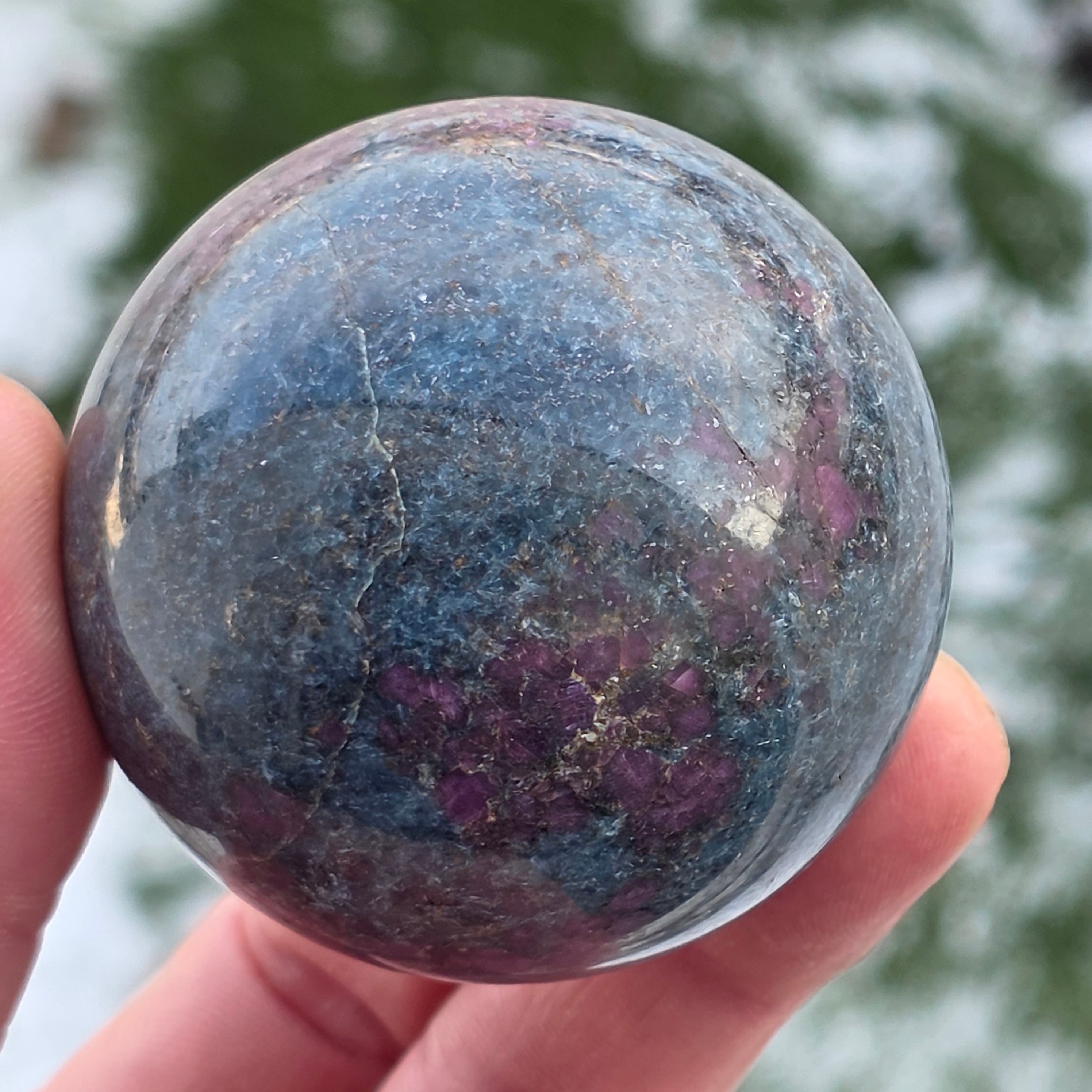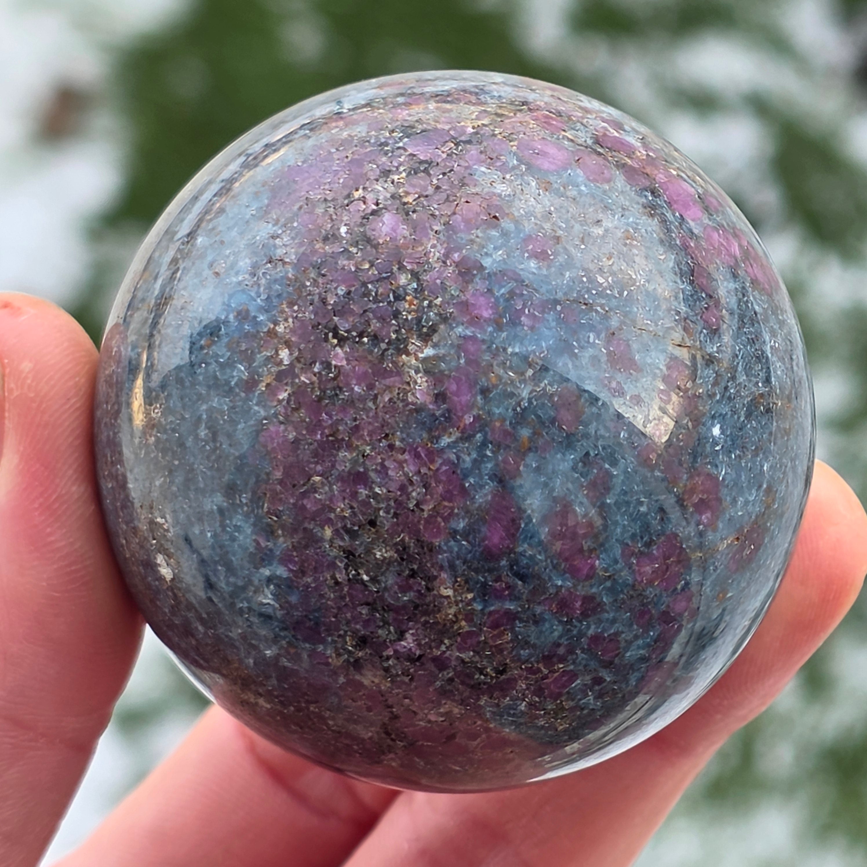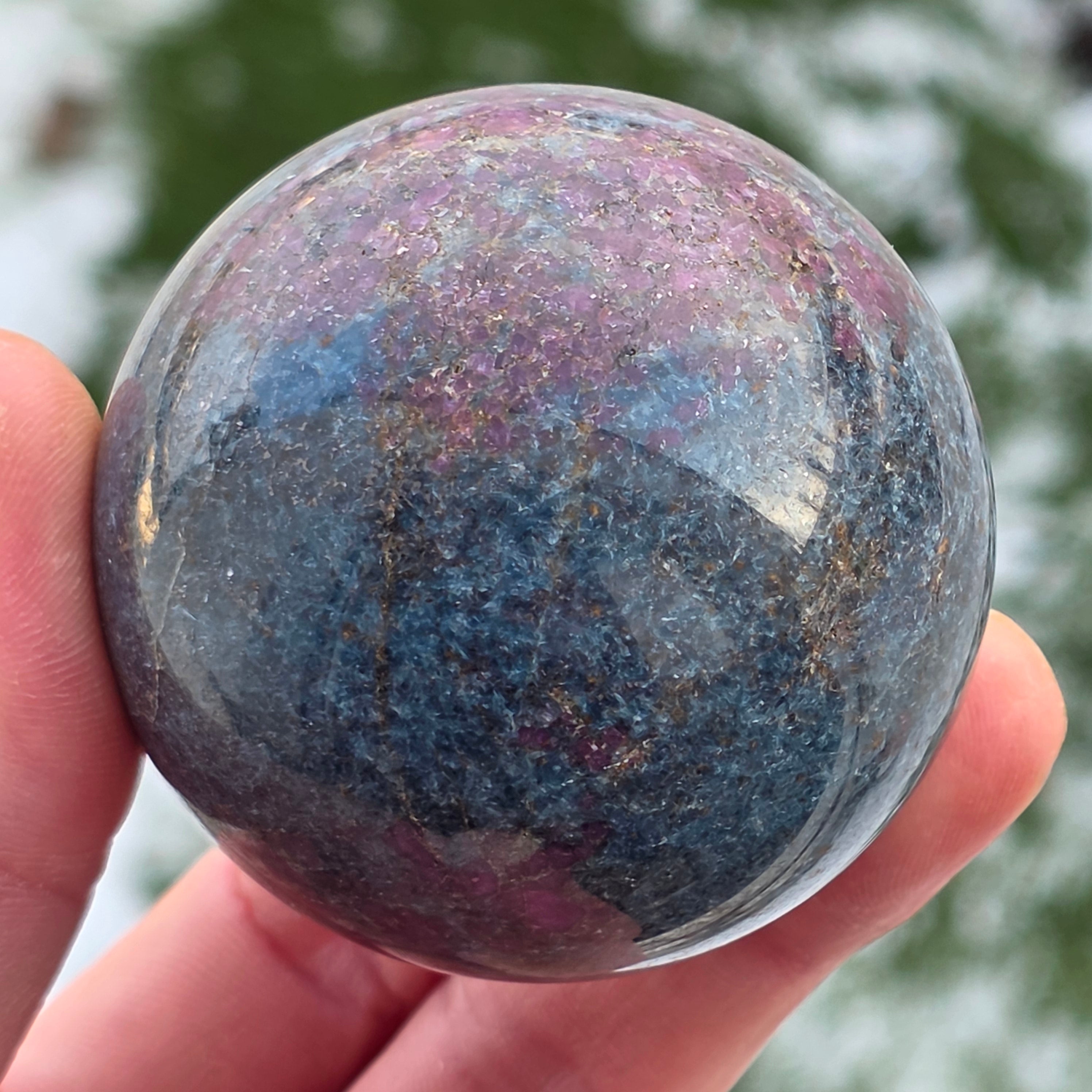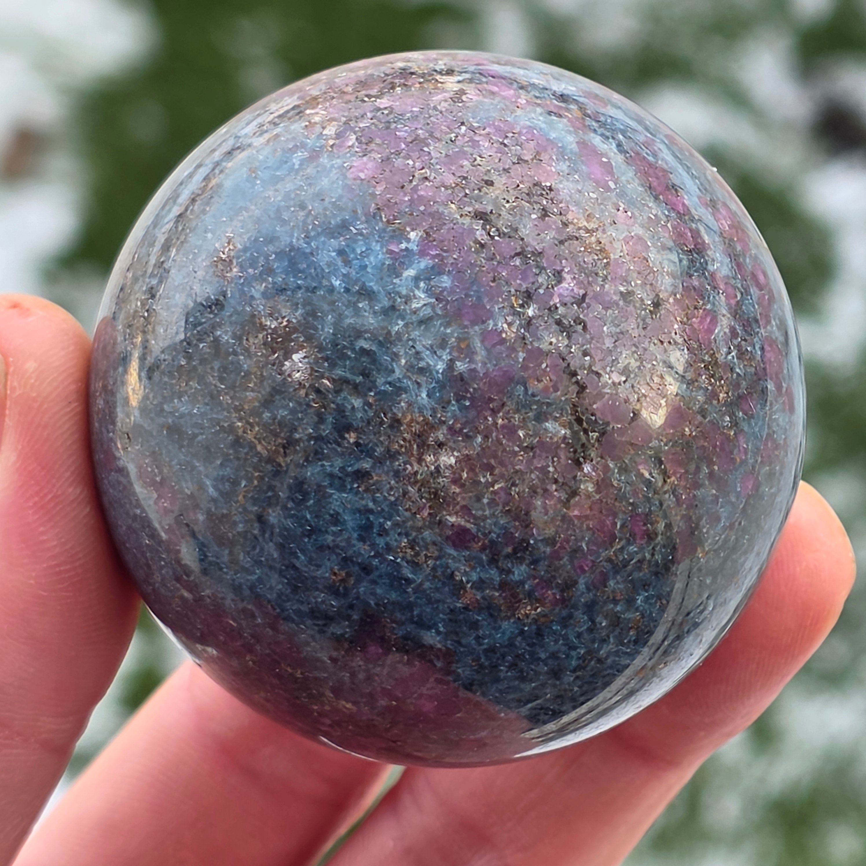 Η σφαίρα από ρουμπίνι σε φυκσίτη με κιανίτη συνδυάζει τρεις συμπληρωματικές ενέργειες: τη ζωτικότητα του ρουμπινιού, την αναζωογονητική ηρεμία του φυκσίτη και τη διαύγεια του κιανίτη. Το σφαιρικό σχήμα υποστηρίζει την ισορροπία μεταξύ πάθους, ηρεμίας και αυθεντικής έκφρασης, συνδέεται με την εναρμόνιση των συναισθημάτων και την ενίσχυση της σύνδεσης μεταξύ καρδιάς και μυαλού.