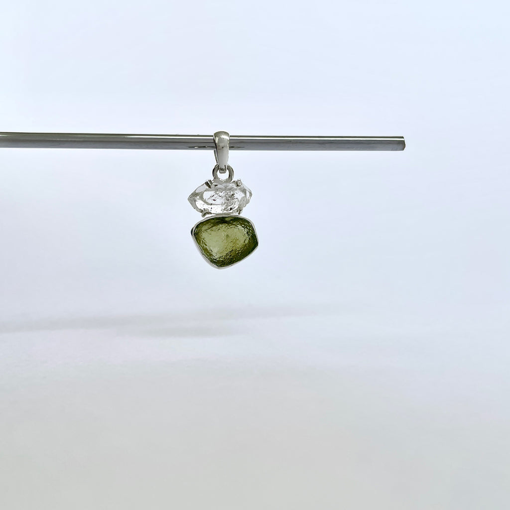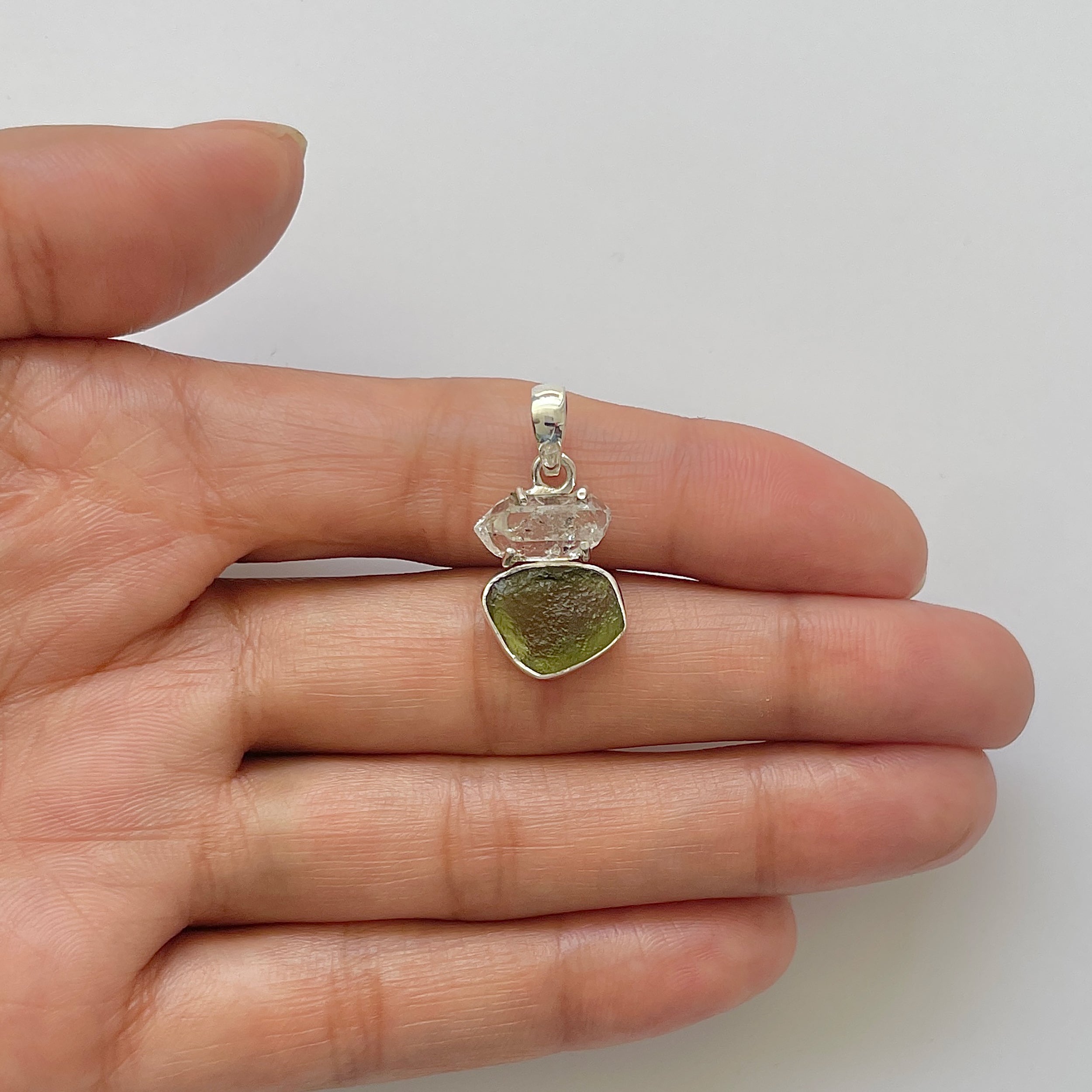 Ένα σπάνιο και αυθεντικό μενταγιόν με ακατέργαστος μολδαβίτης, μινιμαλιστική τοποθέτηση Ασήμι 925 για να αναδείξει το φυσικό του σχήμα.