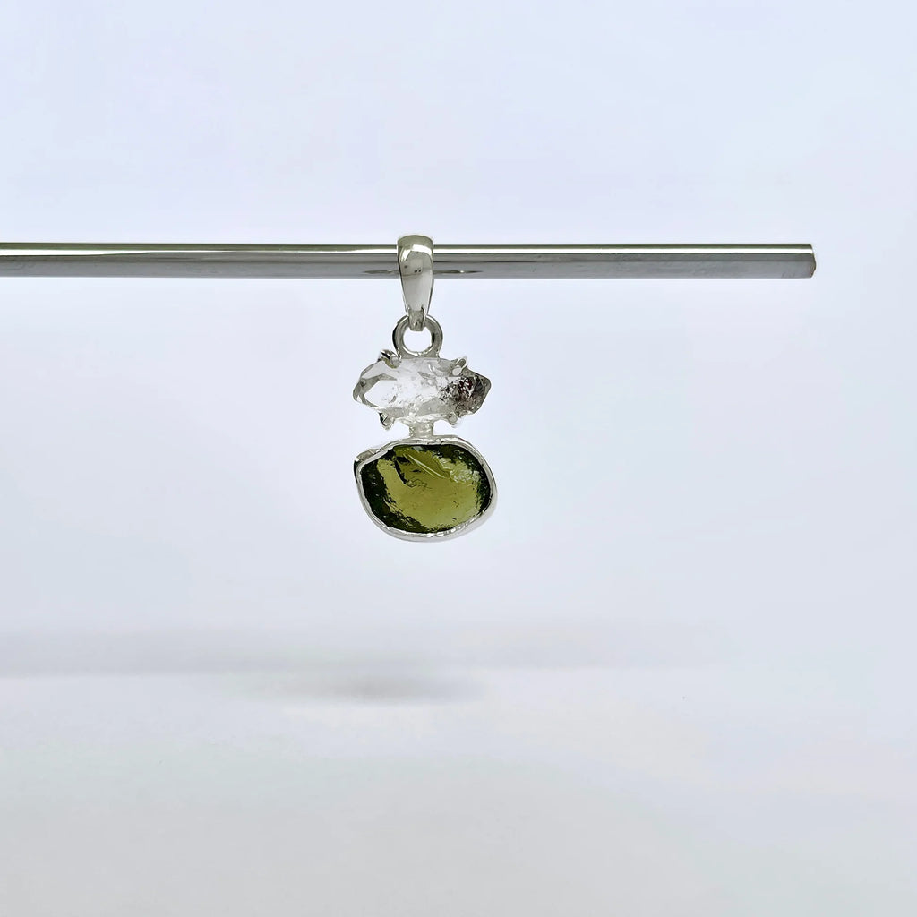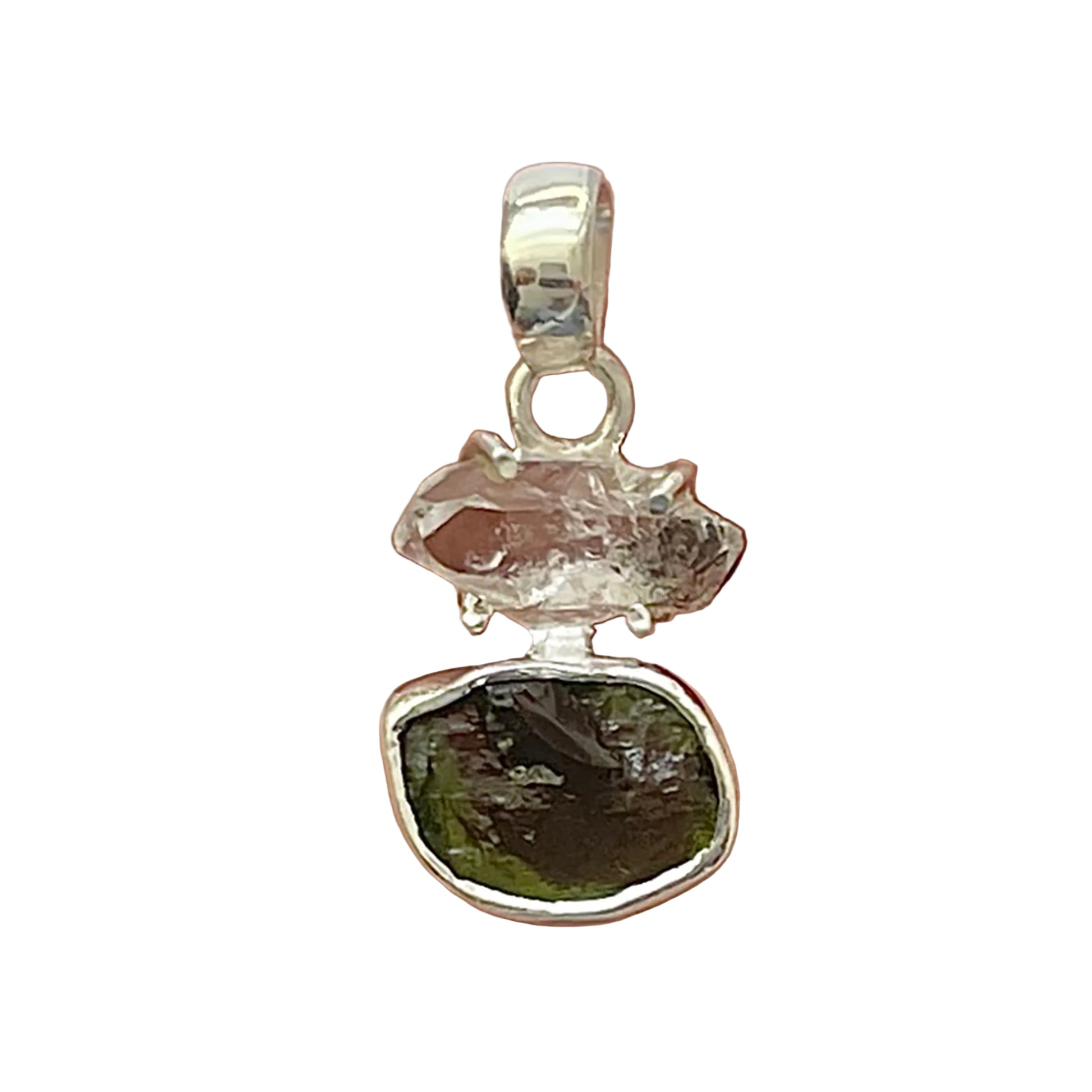 ✨ Χαλαζία Herkimer, διπλός τερματικός κρύσταλλος με σπάνια σαφήνεια, η οποία ενισχύει και καθαρίζει τις ενέργειες.Μαζί σχηματίζουν ένα Κοσμικός Ταλίσμα της συνέργειας, όπου ο Moldavit ανοίγει τις πύλες σε νέες διαστάσεις και ο Herkimer φέρνει σαφήνεια και οδηγό.