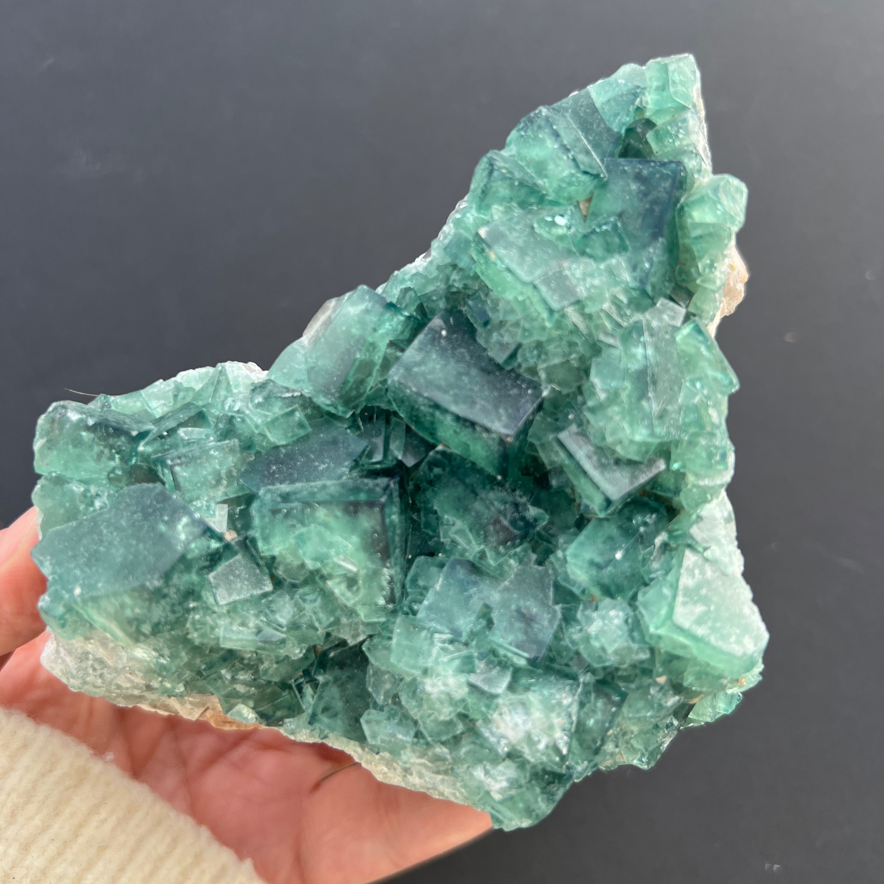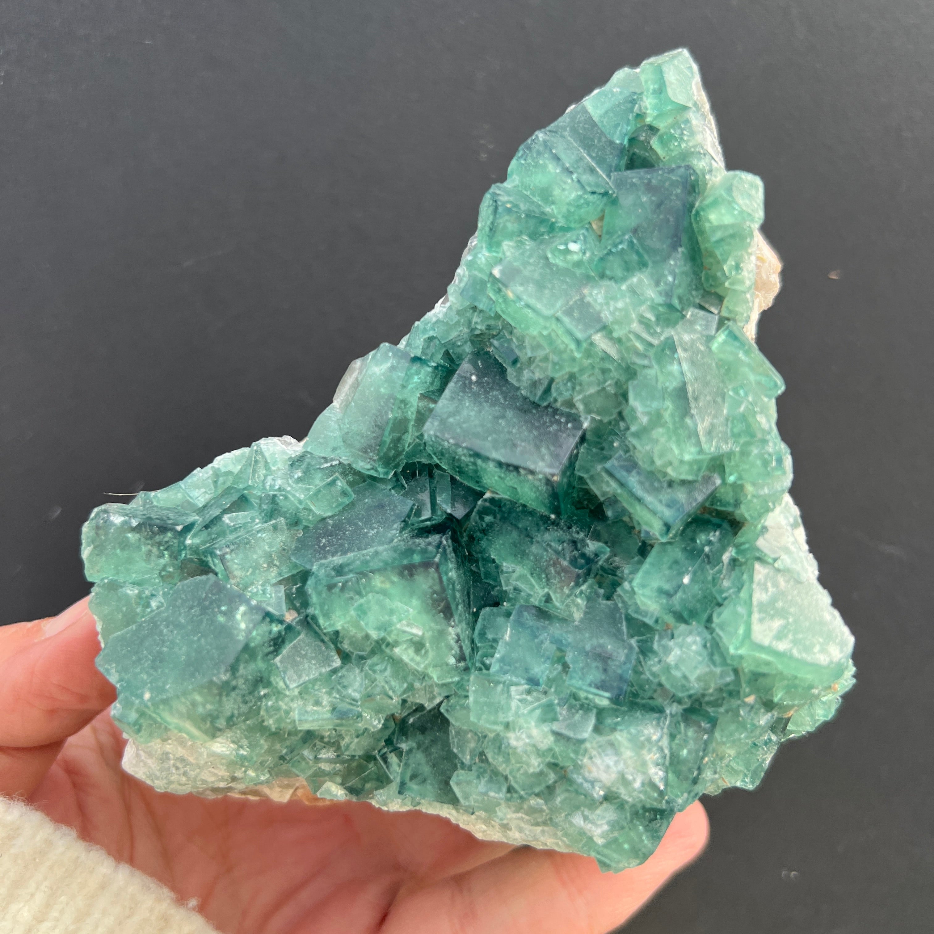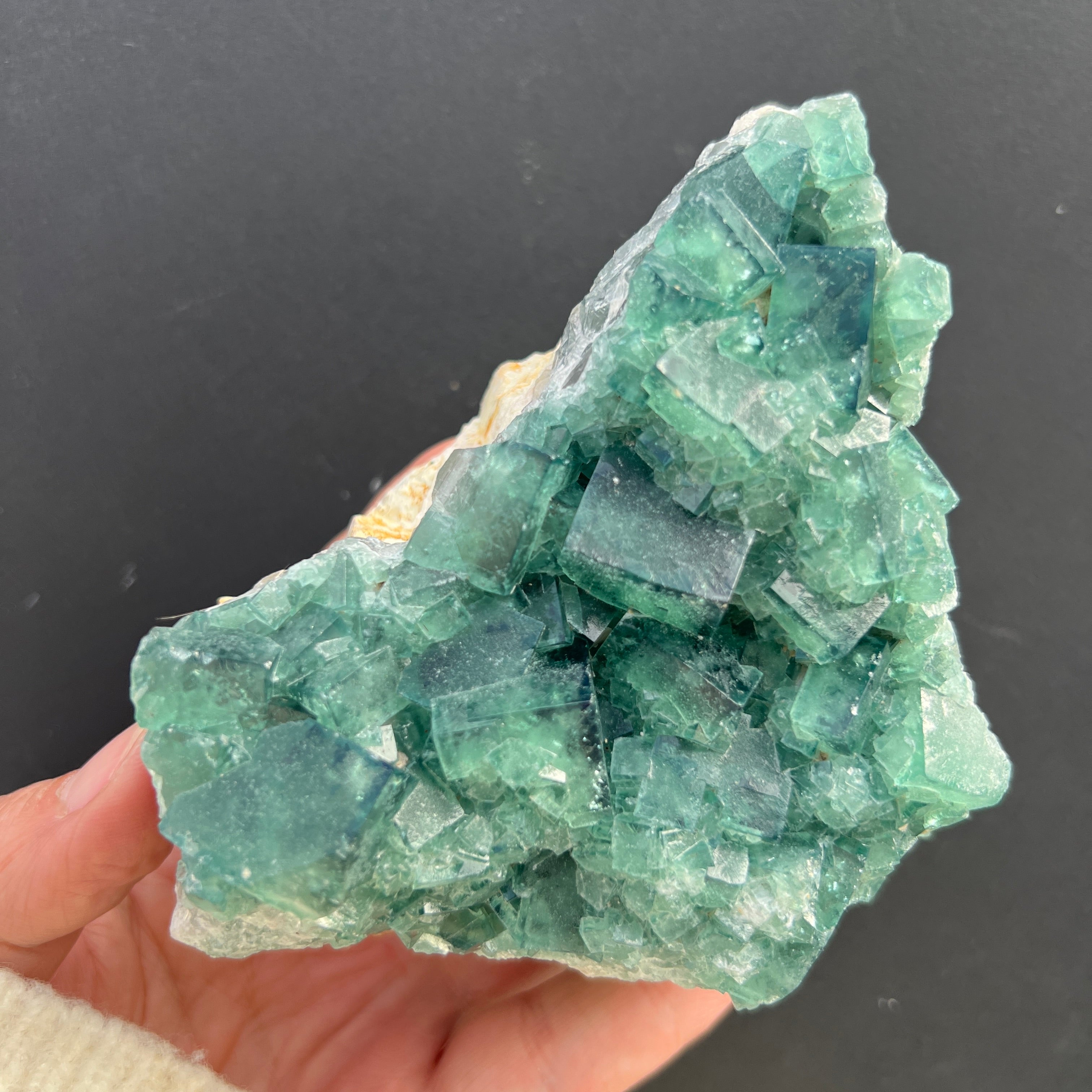Αυτό το δείγμα αποτυπώνει πιστά τα τυπικά χαρακτηριστικά του φλουορίτη: τέλειο κυβικό σχήμα, μερική διαφάνεια και μια απόχρωση που ποικίλλει διακριτικά ανάλογα με τη χημική σύνθεση και τις συνθήκες κρυστάλλωσης. Η παρουσία του χρώματος – είτε πράσινο, μωβ, μπλε ή κίτρινο – συνδέεται με φυσικές εγκλείσεις και ακαθαρσίες όπως το ίτριο, το σέριο ή ίχνη υδρογονανθράκων, και η χρωματική ζώνωση παρέχει πολύτιμες πληροφορίες για τις αλλαγές στο περιβάλλον σχηματισμού.