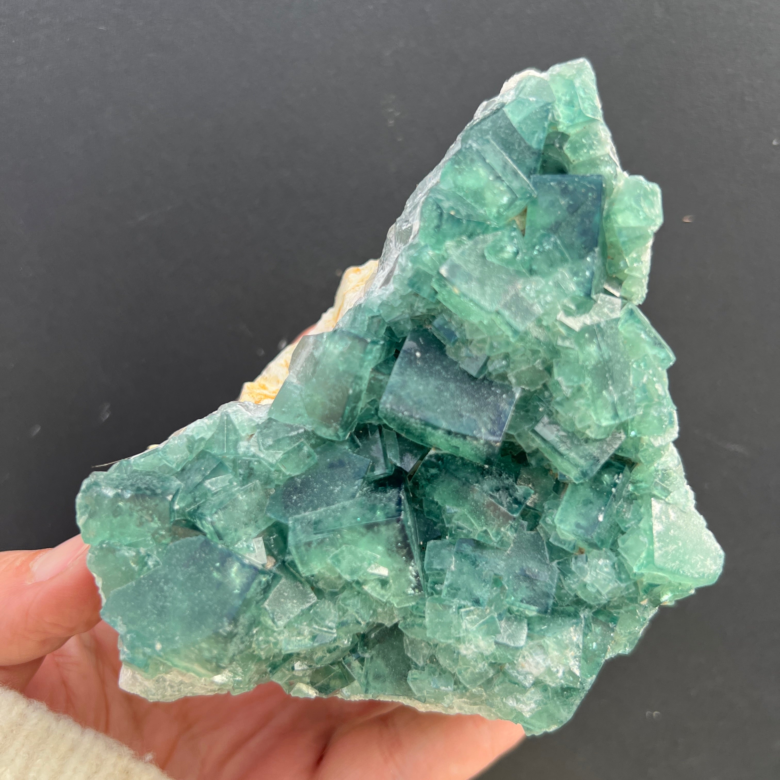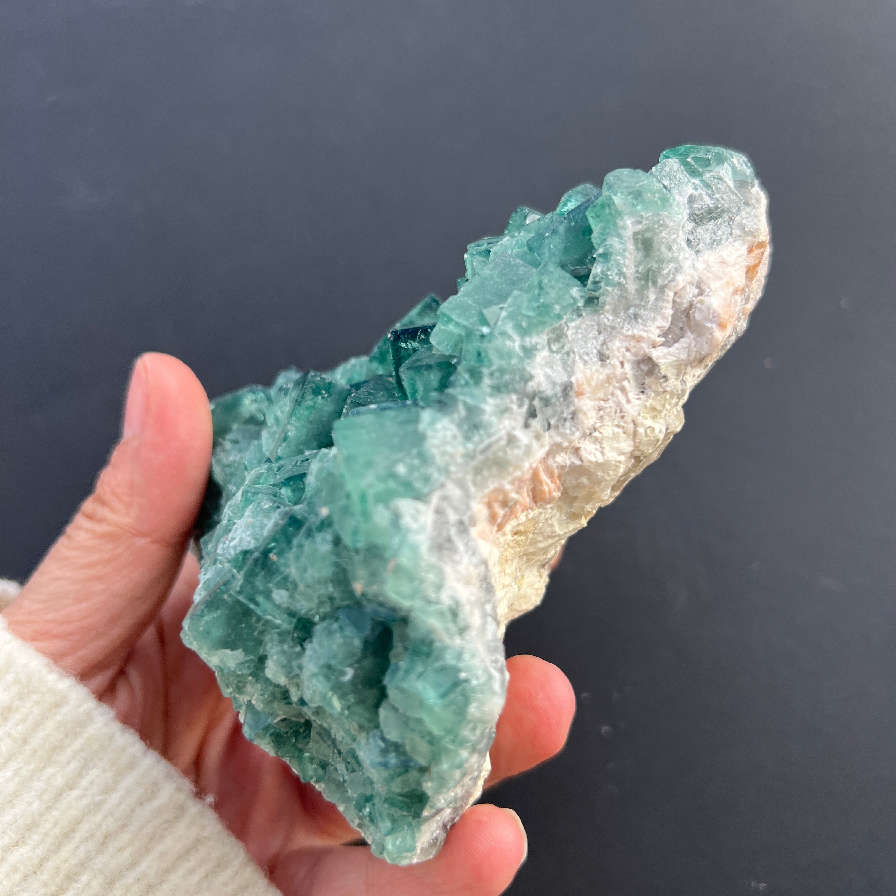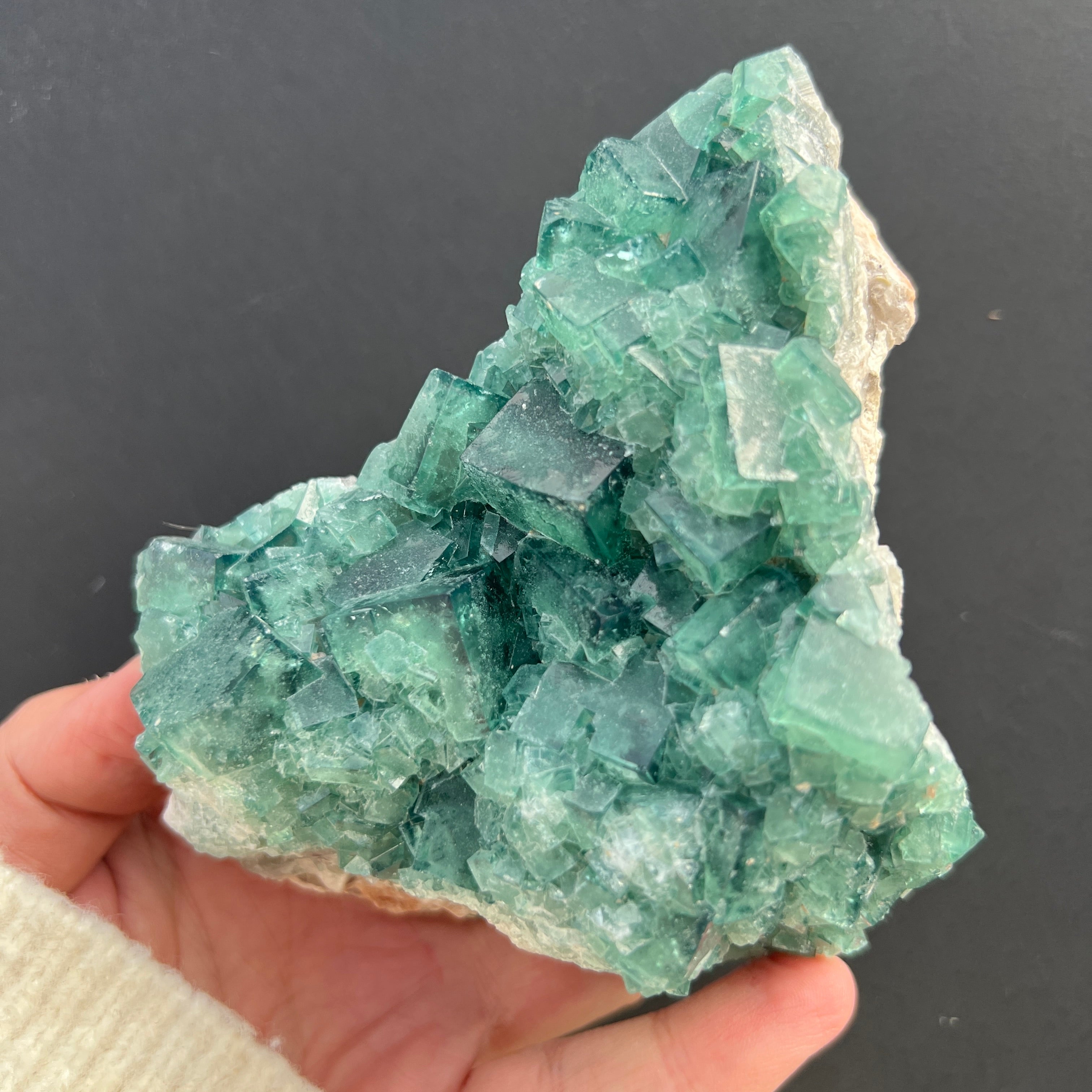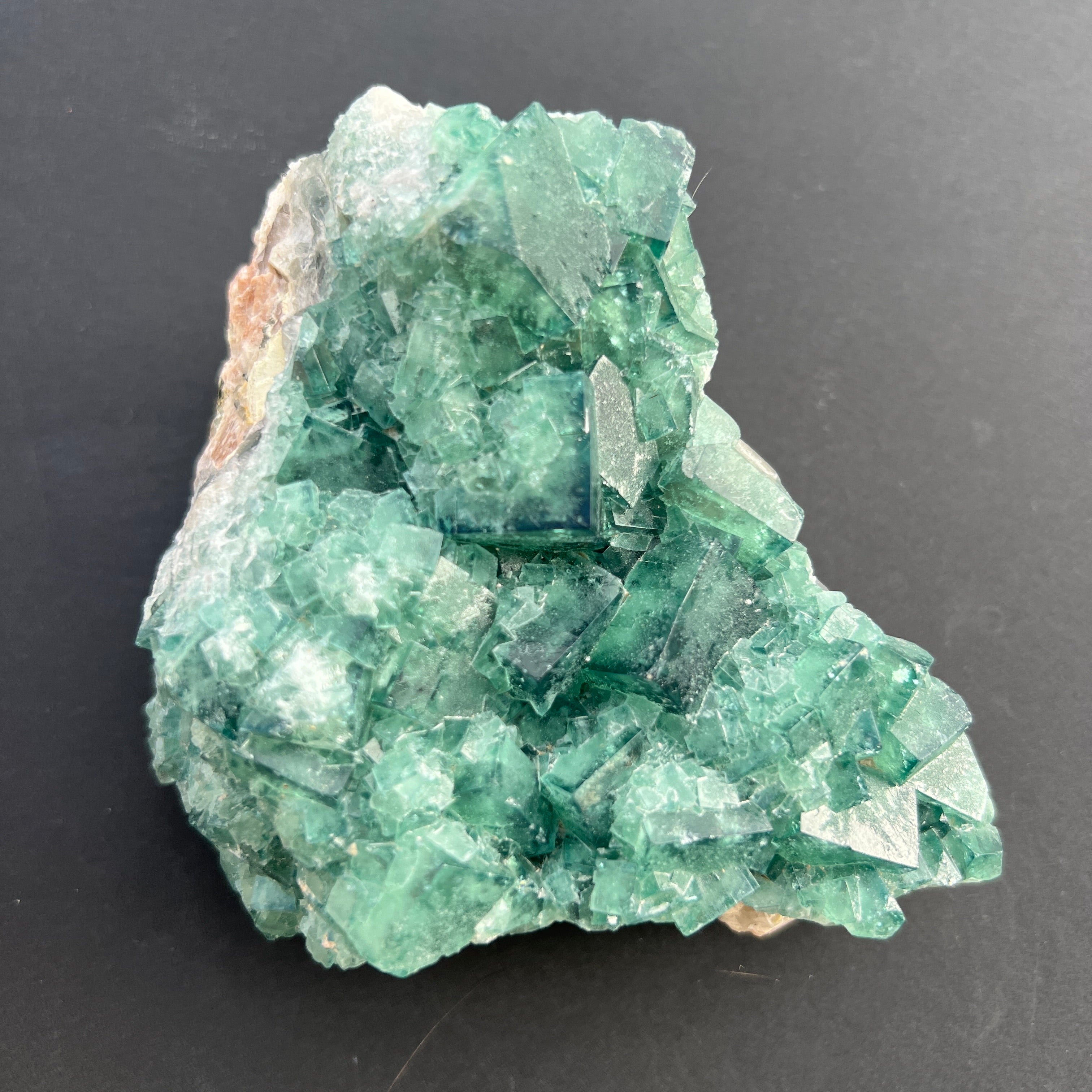 Αυτό το δείγμα αποτυπώνει πιστά τα τυπικά χαρακτηριστικά του φλουορίτη: τέλειο κυβικό σχήμα, μερική διαφάνεια και μια απόχρωση που ποικίλλει διακριτικά ανάλογα με τη χημική σύνθεση και τις συνθήκες κρυστάλλωσης. Η παρουσία του χρώματος – είτε πράσινο, μωβ, μπλε ή κίτρινο – συνδέεται με φυσικές εγκλείσεις και ακαθαρσίες όπως το ίτριο, το σέριο ή ίχνη υδρογονανθράκων, και η χρωματική ζώνωση παρέχει πολύτιμες πληροφορίες για τις αλλαγές στο περιβάλλον σχηματισμού.