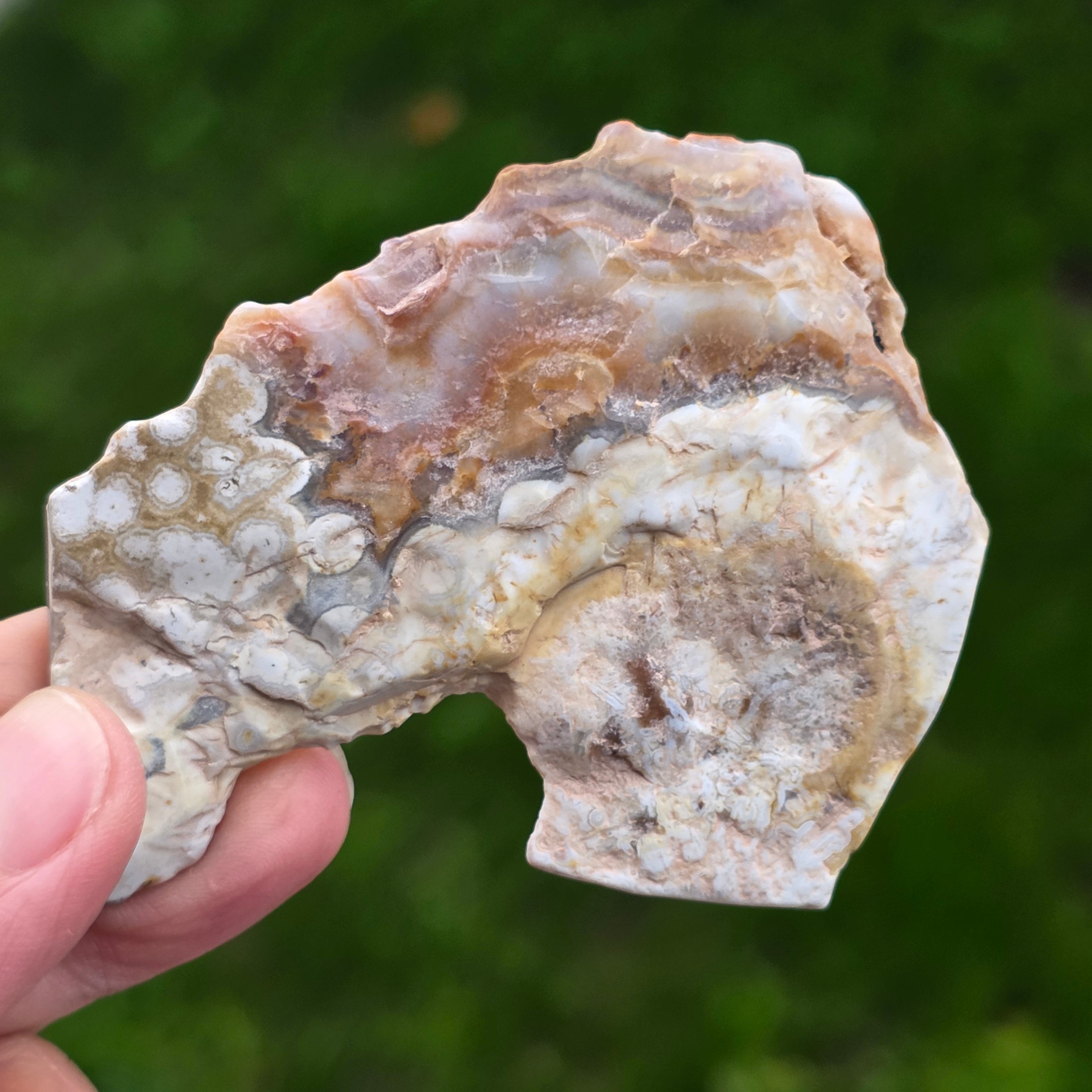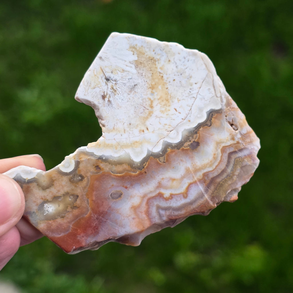 Ο αγάτης Crazy από το Μεξικό είναι μία από τις πιο ζωντανές και θεαματικές ποικιλίες αγάτη, διάσημος για τις κυματιστές γραμμές του και τα τρελά παιχνίδια χρωμάτων που μοιάζει να έχουν σχεδιαστεί από ένα ελεύθερο χέρι, χωρίς κανόνες. Σε αυτήν τη φυσική φέτα, μικρή αλλά εξαιρετικά εκφραστική, αποκαλύπτεται ολόκληρη η ιστορία του λίθου: γήινα στρώματα, ζεστές καραμελένιες αποχρώσεις, έντονο κόκκινο, πορτοκαλί, γκρι και κρεμ, αναμεμιγμένα σε σπειροειδή μοτίβα που φαίνεται να παλλουν με ζωή.