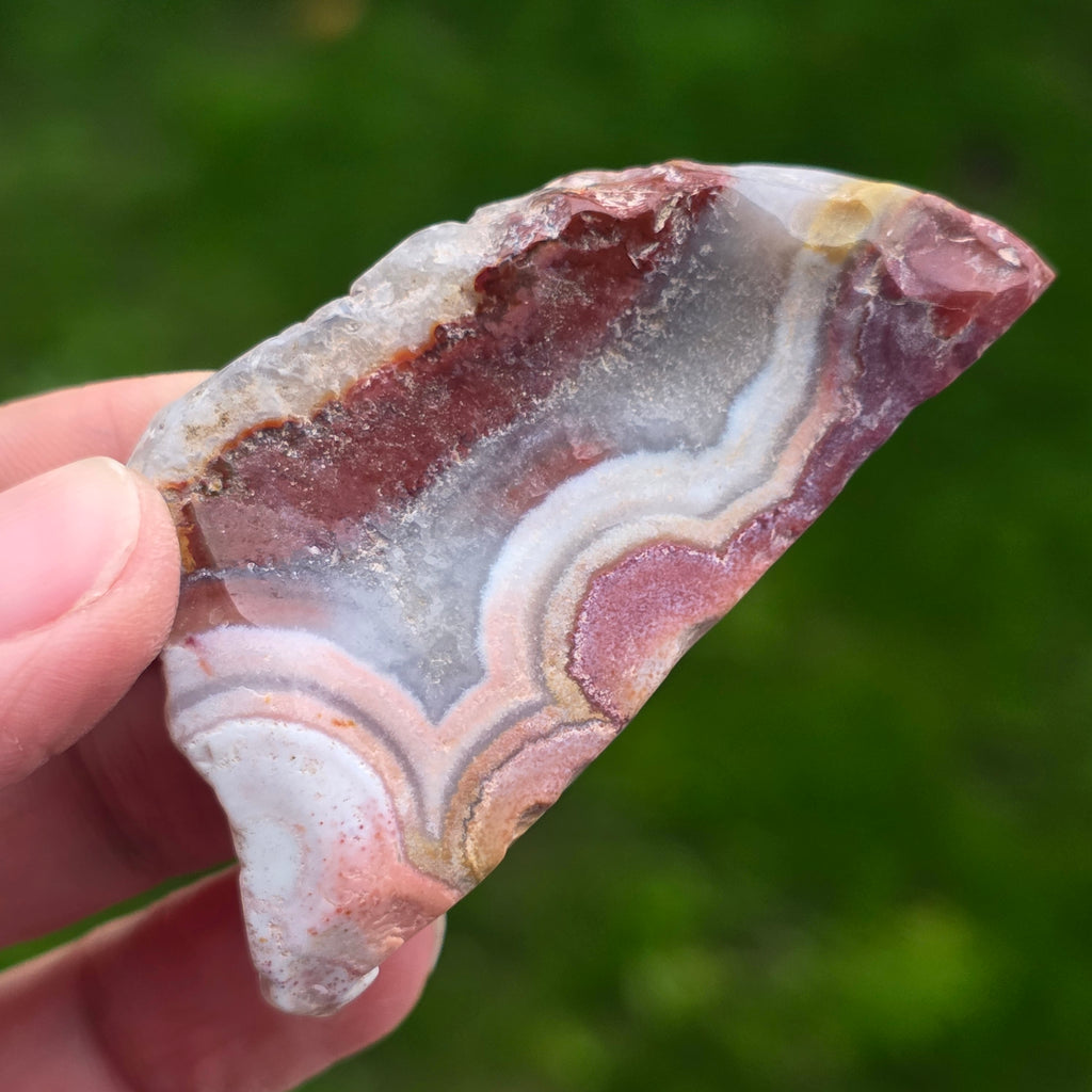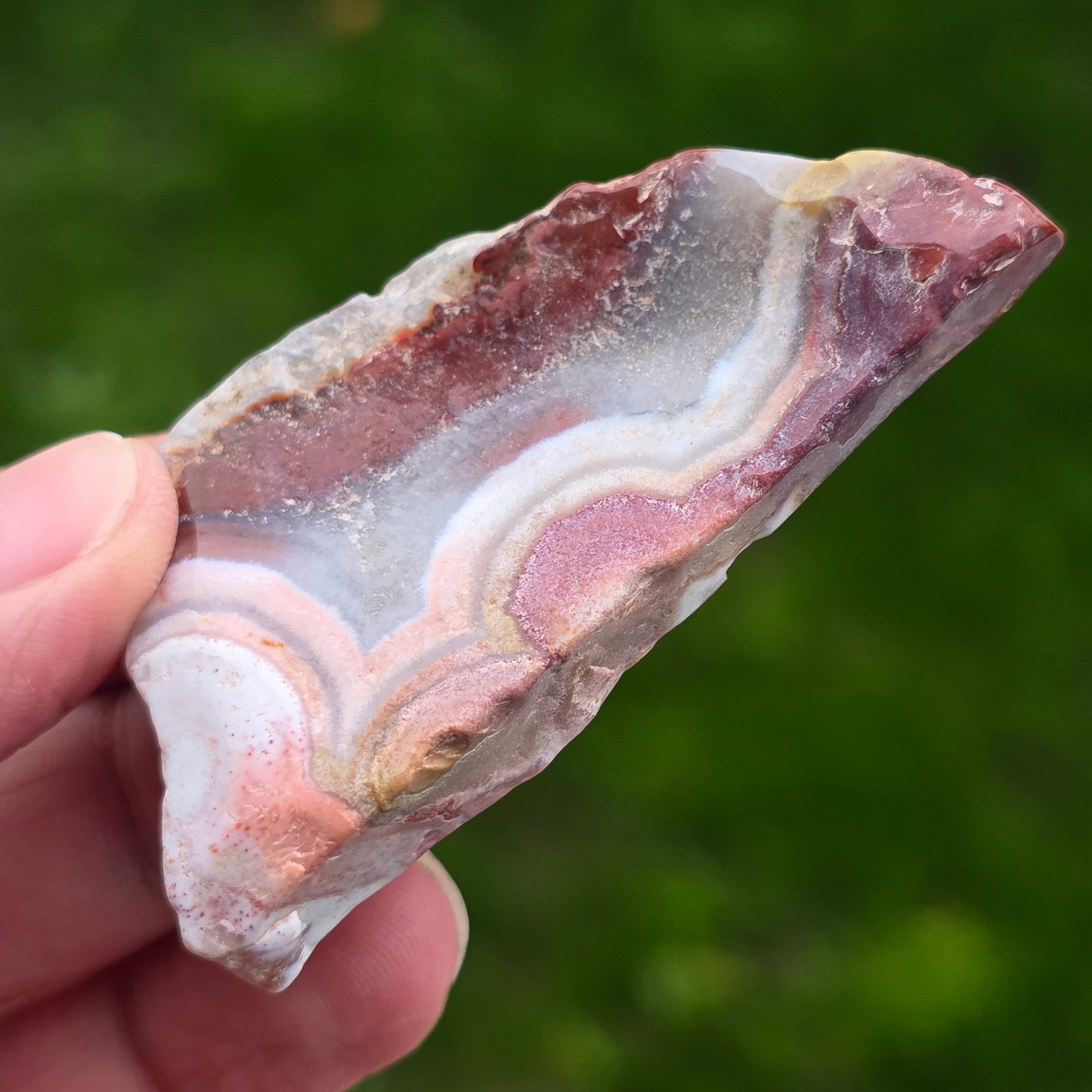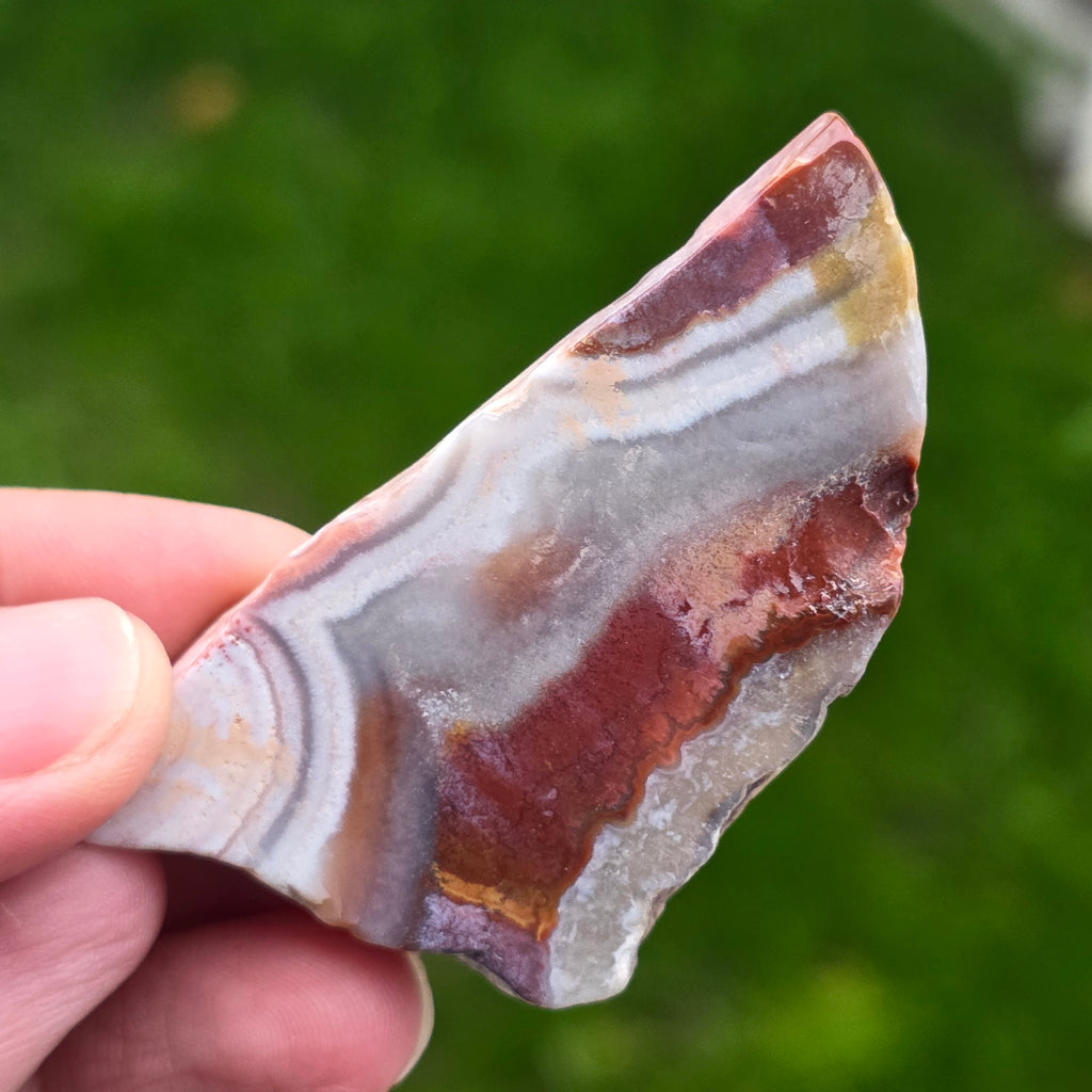 Ο αγάτης Crazy από το Μεξικό είναι μία από τις πιο ζωντανές και θεαματικές ποικιλίες αγάτη, διάσημος για τις κυματιστές γραμμές του και τα τρελά παιχνίδια χρωμάτων που μοιάζει να έχουν σχεδιαστεί από ένα ελεύθερο χέρι, χωρίς κανόνες. Σε αυτήν τη φυσική φέτα, μικρή αλλά εξαιρετικά εκφραστική, αποκαλύπτεται ολόκληρη η ιστορία του λίθου: γήινα στρώματα, ζεστές καραμελένιες αποχρώσεις, ζωηρό κόκκινο, πορτοκαλί, γκρι και κρεμ, αναμεμειγμένα σε σπειροειδή σχέδια που φαίνεται να παλλουν με ζωή.