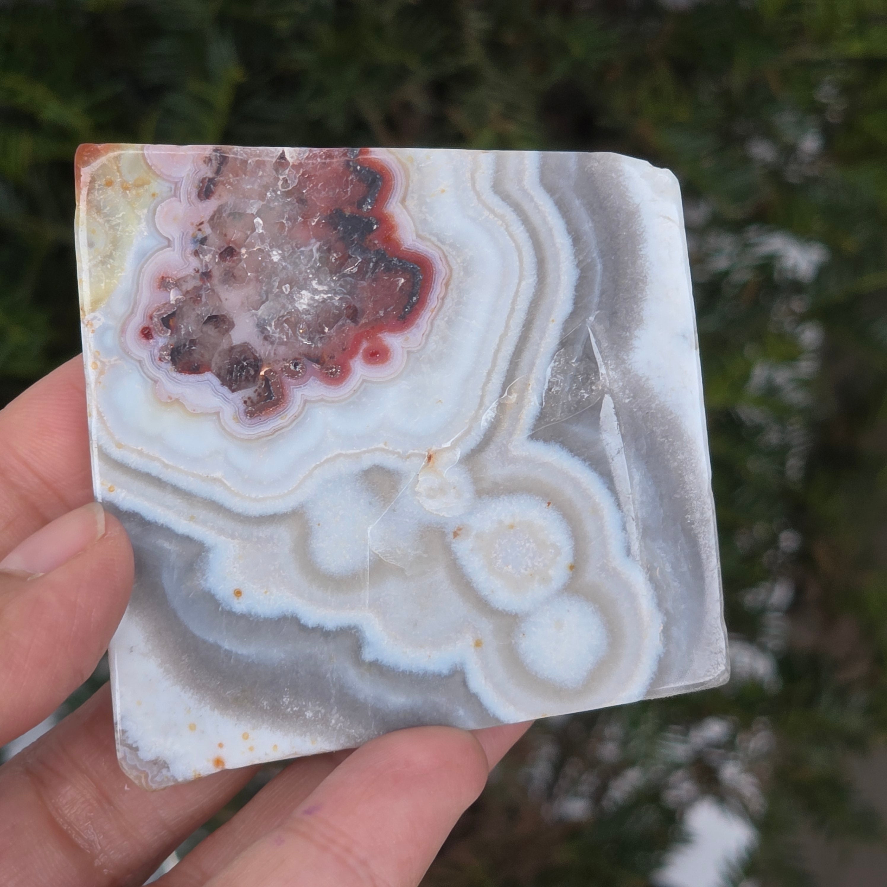 Ο αγάτης Crazy από το Μεξικό είναι μία από τις πιο ζωντανές και εντυπωσιακές ποικιλίες αγάτη, γνωστός για τις κυματιστές γραμμές του και τα τρελά παιχνίδια χρωμάτων που μοιάζουν να έχουν δημιουργηθεί από ένα ελεύθερο χέρι, χωρίς κανόνες. Σε αυτήν τη φυσική φέτα, μικρή αλλά εξαιρετικά εκφραστική, αποκαλύπτεται ολόκληρη η ιστορία του λίθου: γήινα στρώματα, ζεστές αποχρώσεις καραμέλας, λαμπερό κόκκινο, πορτοκαλί, γκρι και κρεμ, αναμεμιγμένα σε σπιράλ μοτίβα που φαίνεται να παλμούν με ζωή.