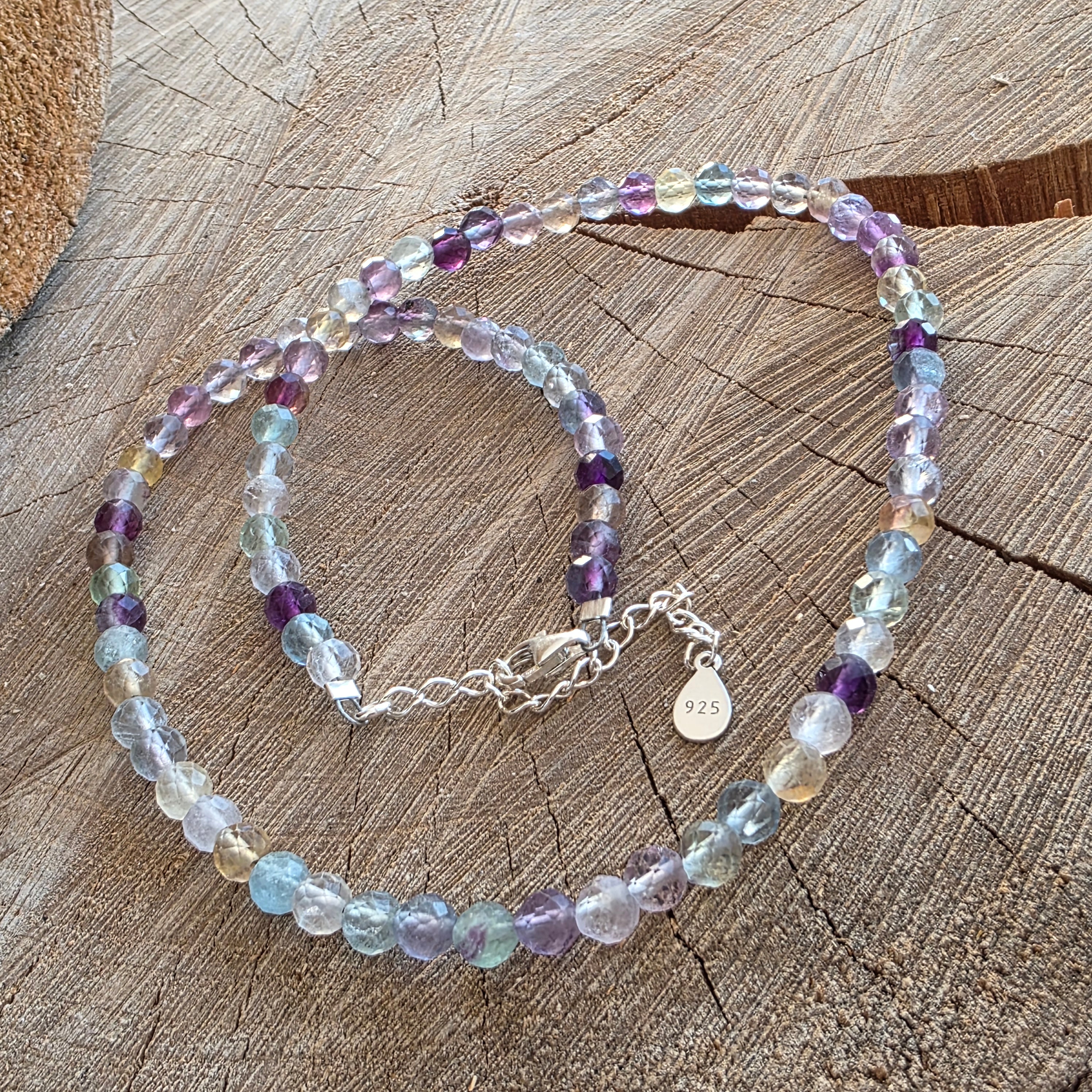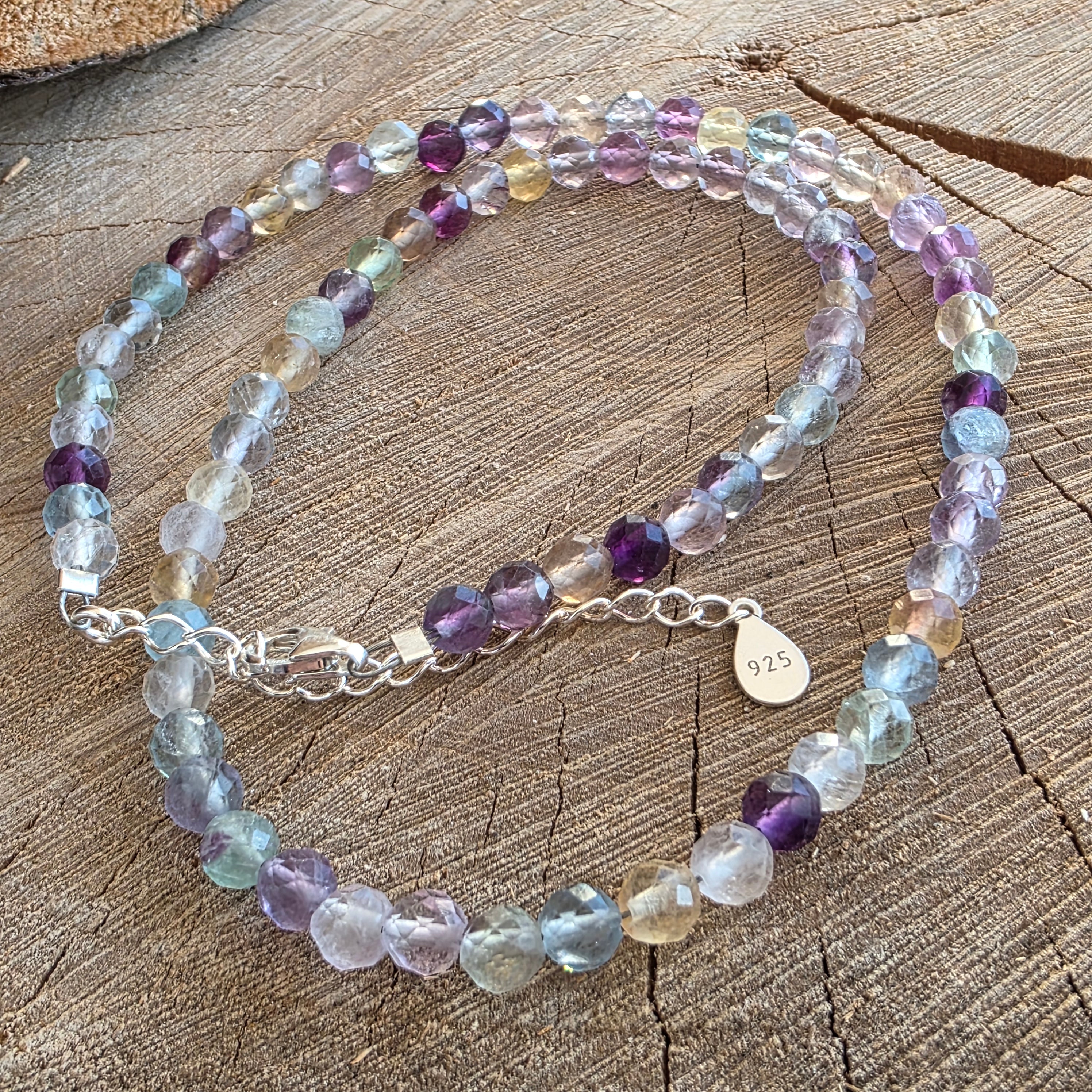 Ένα κολιέ σαν ένα παράθυρο ανοιχτό στο φως - ζωντανό, καθαρό, παιχνιδιάρικο και βαθιά ταυτόχρονα. Τα χάντρα από φθορίτη φθορίτη 6 mm λάμπουν σε αποχρώσεις που χορεύουν ανάμεσα σε μοβ, πράσινο, μπλε και ροζ, σαν γέφυρα μεταξύ συγκίνησης και λογικής, μεταξύ ονείρου και διαύγειας.