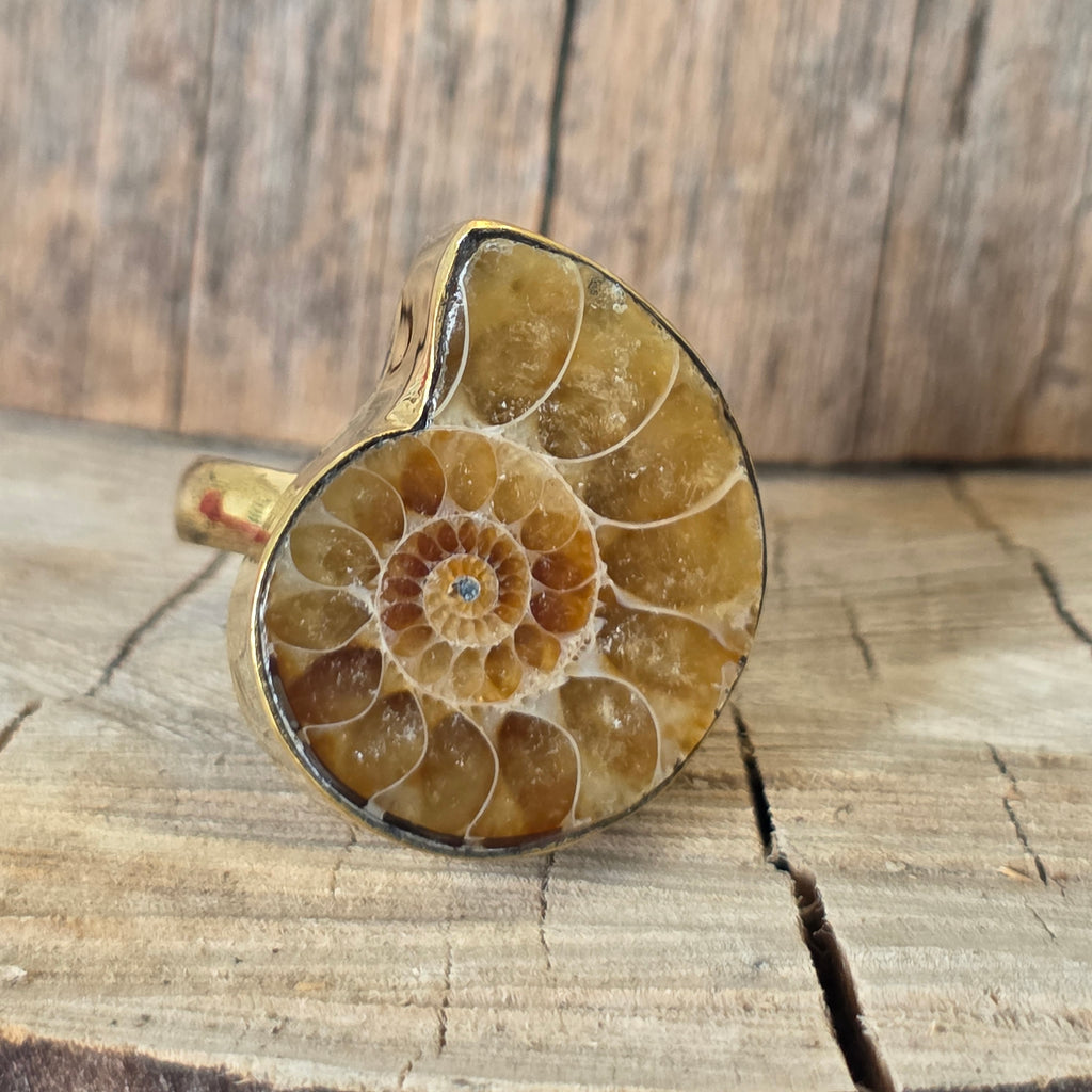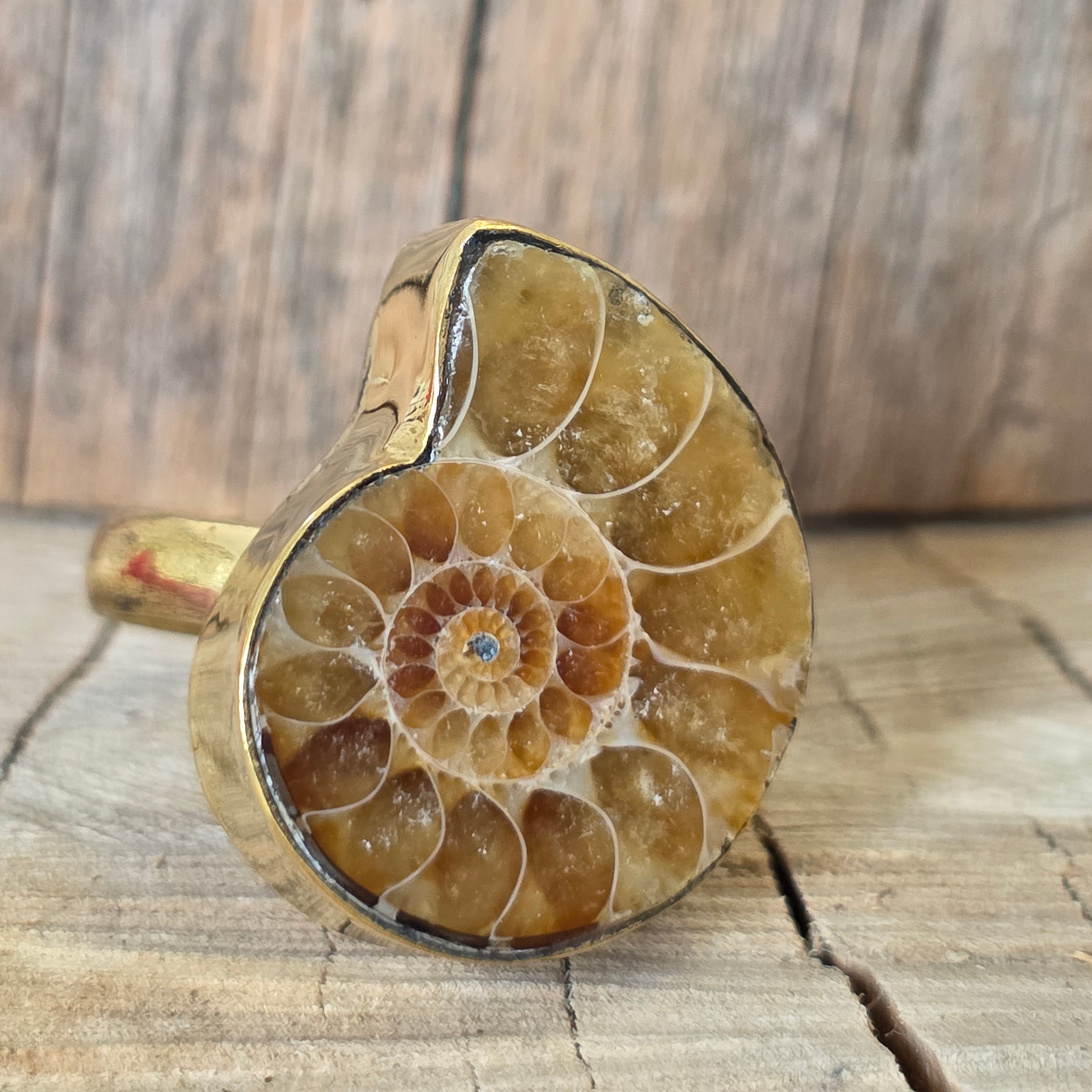 Επιλέξτε αυτό μπρούτζινο δαχτυλίδι με αμμωνίτη και κουβαλήστε μαζί σας την ομορφιά του χρόνου μεταμορφωμένη σε τέχνη. Ένα μοναδικό κόσμημα, γεννημένο από τη θάλασσα και διαμορφωμένο από τη φύση, που φέρνει κομψότητα και ισορροπία στην κάθε μέρα. 🌊✨