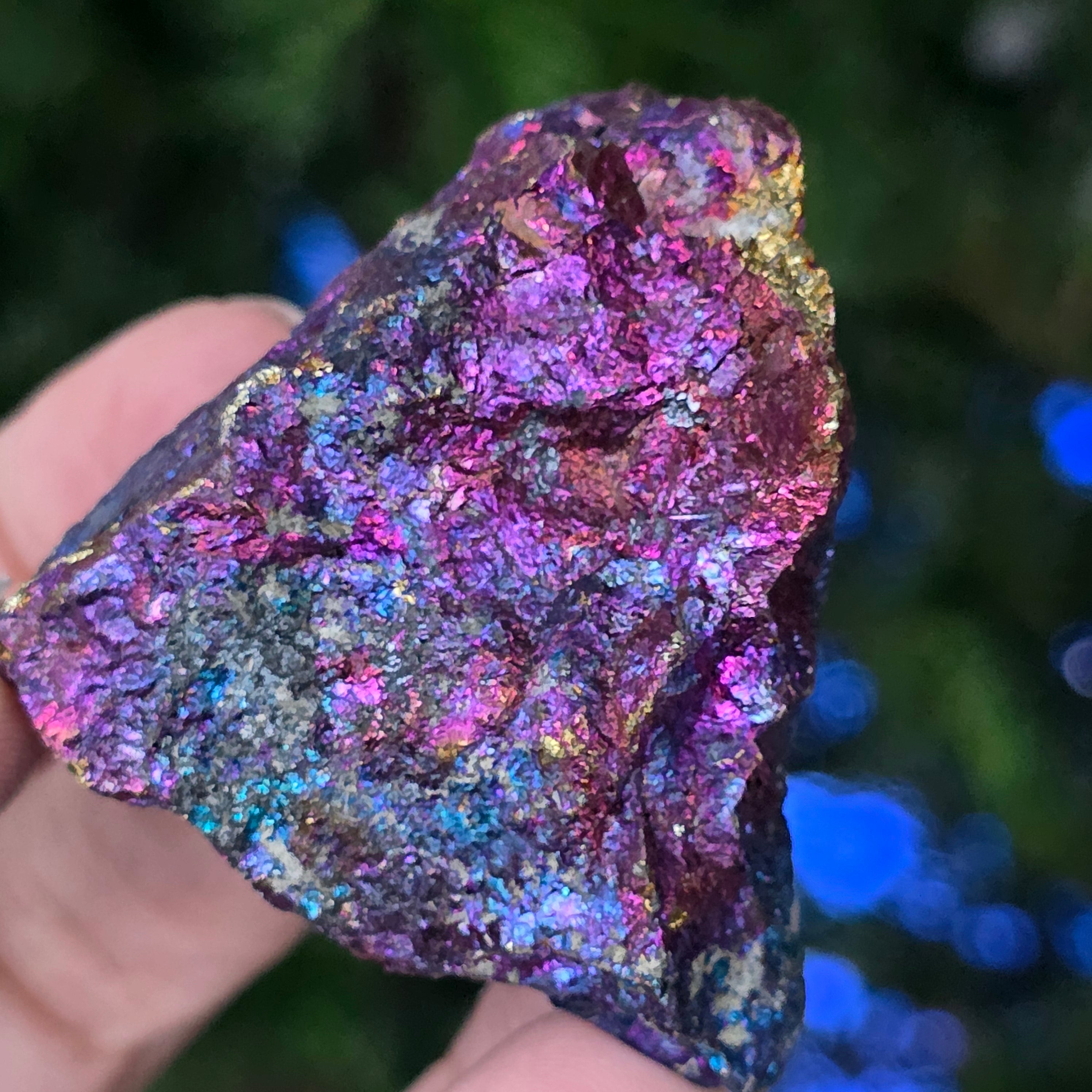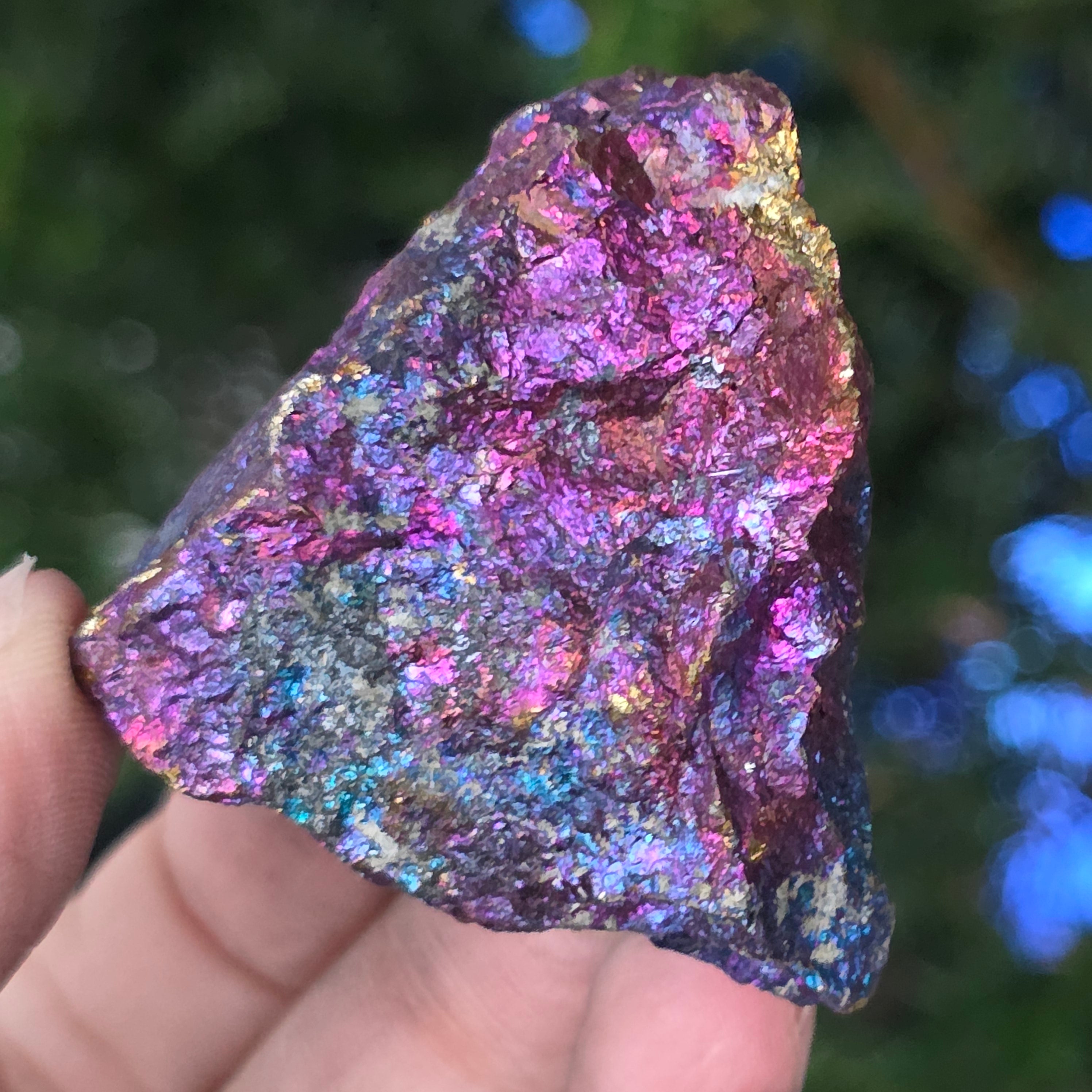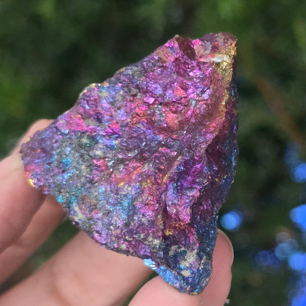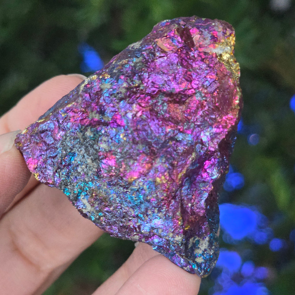 Ο μπλε χαλκοπυρίτης, γνωστός και ως ιριδίζων χαλκοπυρίτης,είναι ένας τύπος χαλκοπυρίτη που παρουσιάζει λαμπερές αποχρώσεις του μπλε, μοβ, πράσινου ή άλλων ιριδίζοντων χρωμάτων. Αυτή η ιριδίζουσα εμφάνιση προκαλείται από ένα λεπτό στρώμα οξείδωσης στην επιφάνεια του ορυκτού, μια φυσική διαδικασία που συμβαίνει όταν ο χαλκοπυρίτης εκτίθεται στον αέρα και την υγρασία για μεγάλο χρονικό διάστημα.