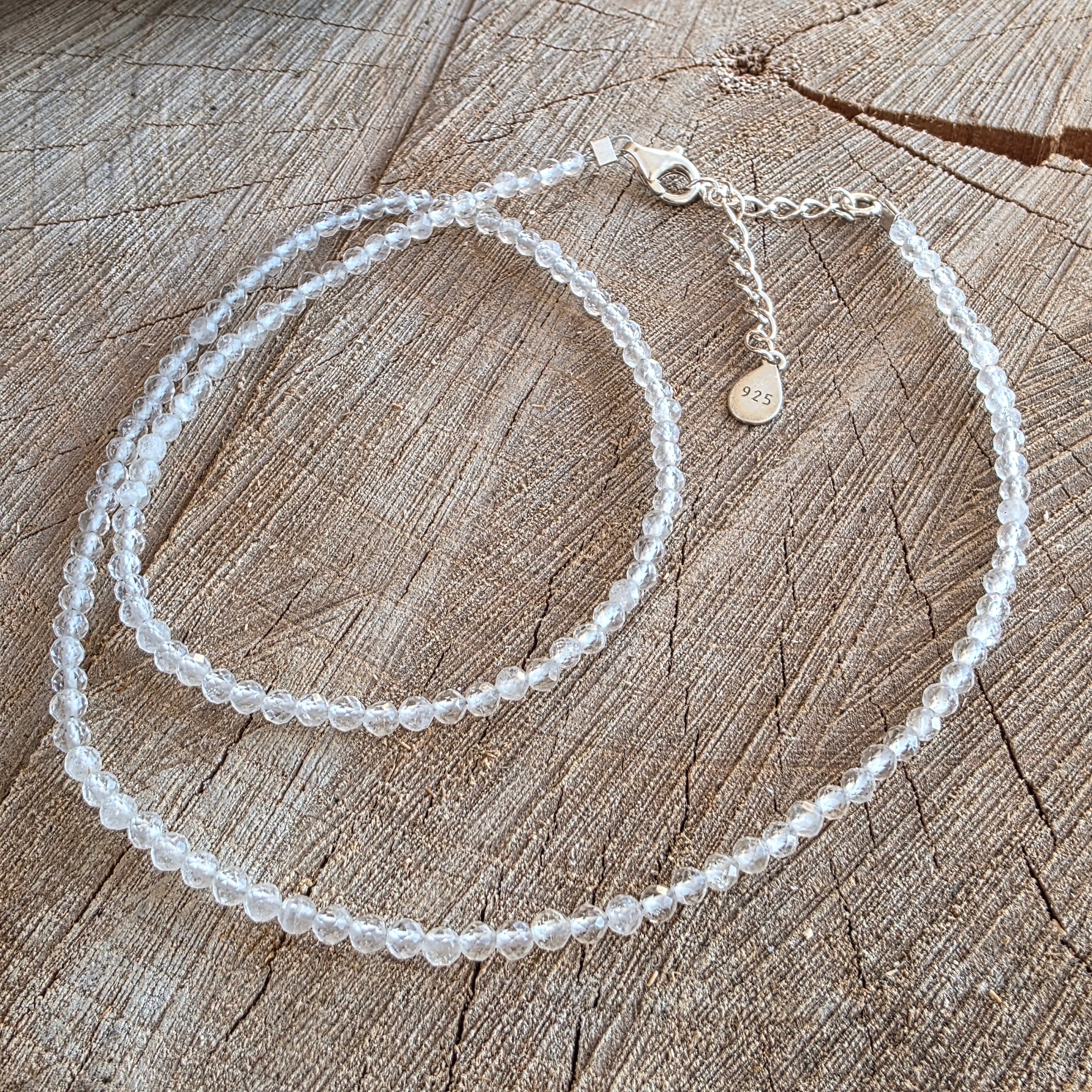 Το νήμα αποτελείται εξ ολοκλήρου από σφαίρες που αντιμετωπίζονται από 3mm άχρωμο χαλαζία, διαφανείς κρύσταλλοι που αντικατοπτρίζουν το φως σε πρόστιμο, σχεδόν αιθέρια φωτεινότητα. Κάθε σφαιρίδιο μοιάζει με ένα κομμάτι δροσιάς που αλιεύεται με την πάροδο του χρόνου, μια σαφή σκέψη, ένα κενό χώρο που γεμίζει. Η απόλυτη σαφήνεια του χαλαζία δεν είναι κρύα - αντίθετα, προσφέρει μια απαλή δόνηση, άνοιγμα, καθαρής ηρεμίας.