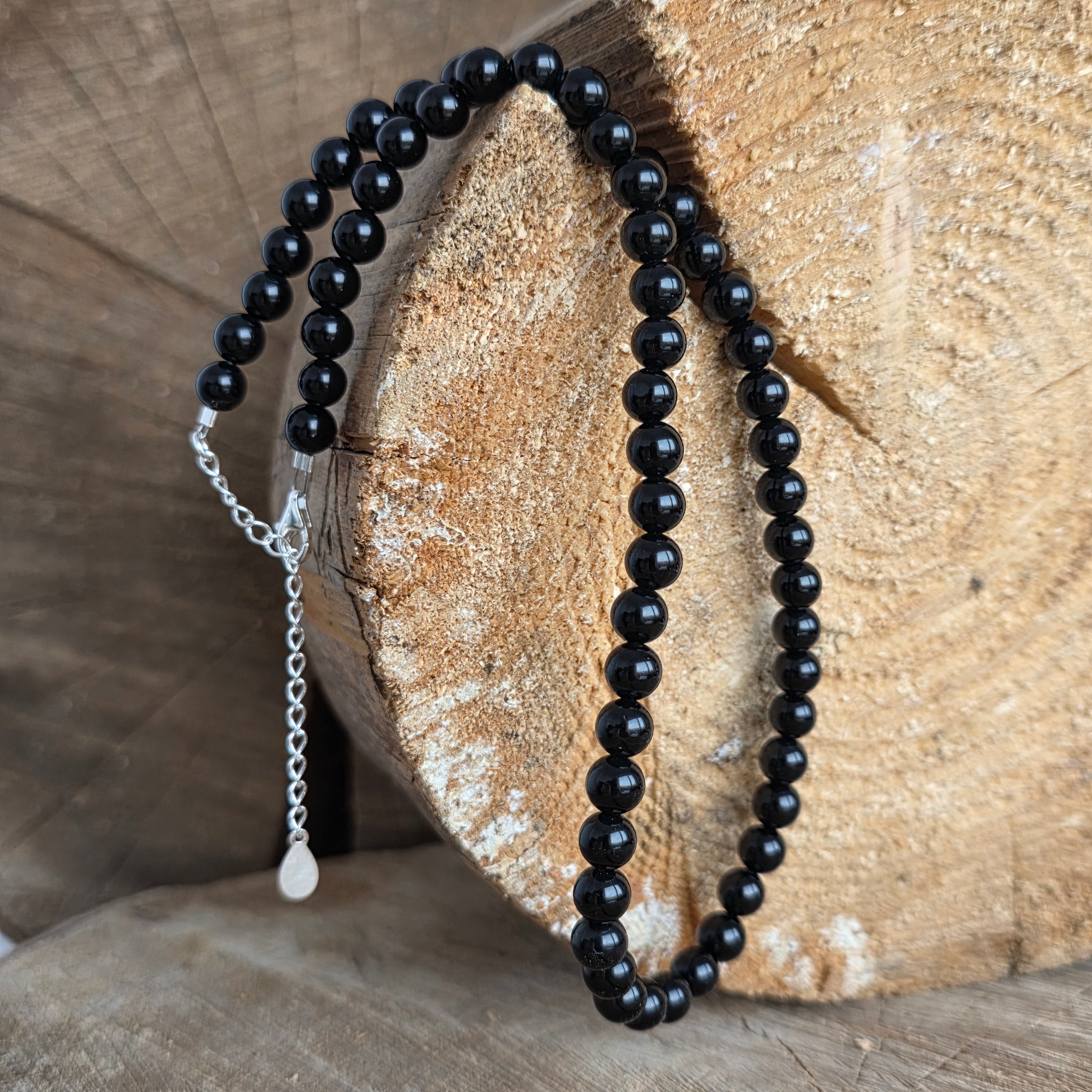 Ένα κολιέ σαν μια καθαρή νύχτα όπου η πανσέληνος λάμπει πάνω στη σιωπή της γης. Οι λείες μαύρες χάντρες όνυχα 6 χλστ σχηματίζουν μια γραμμή δύναμης και μυστηρίου, ένας προστατευτικός κύκλος που απορροφά τον θόρυβο του κόσμου και αφήνει χώρο στην παρουσία.