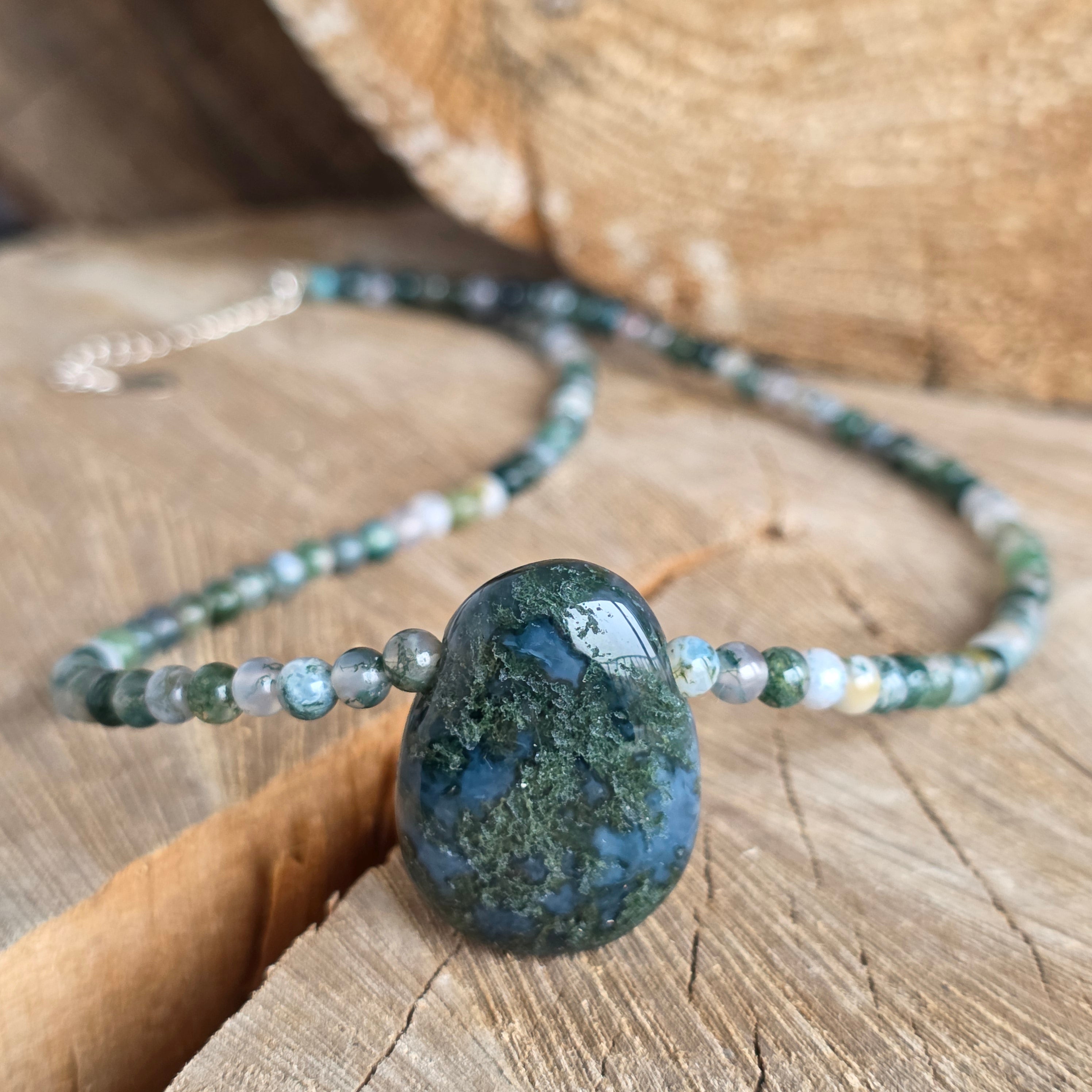 Ένα κολιέ σαν ένα μικρό δάσος, φορεμένο στο λαιμό – πράσινο, οργανικό, γεμάτο ζωή και μυστήριο. Οι χάντρες από βότσαλο μόσχου 4 mm αποκαλύπτουν μικροπεριβάλλοντα: διαφανείς μορφές, διαπερασμένες από πράσινες φλέβες που θυμίζουν βρύα, φύλλα και ρίζες που σφυγμομετρούν στο βάθος.