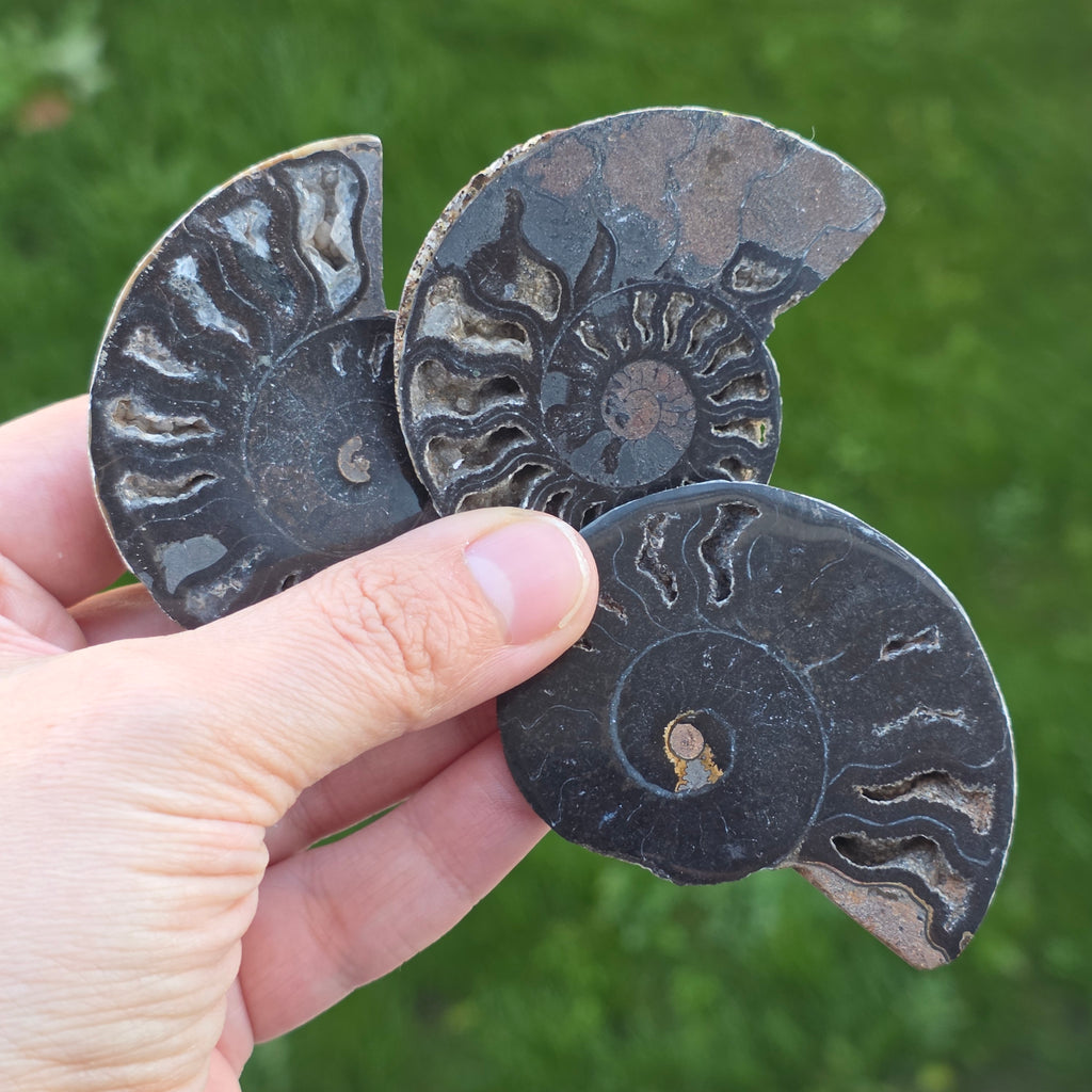 Cristalele fosile de amonit sunt confecționate din fosile autentice de amonit. Aceste fosile pot avea diferite dimensiuni și ornamente, în funcție de specie și perioada geologică în care au trăit.