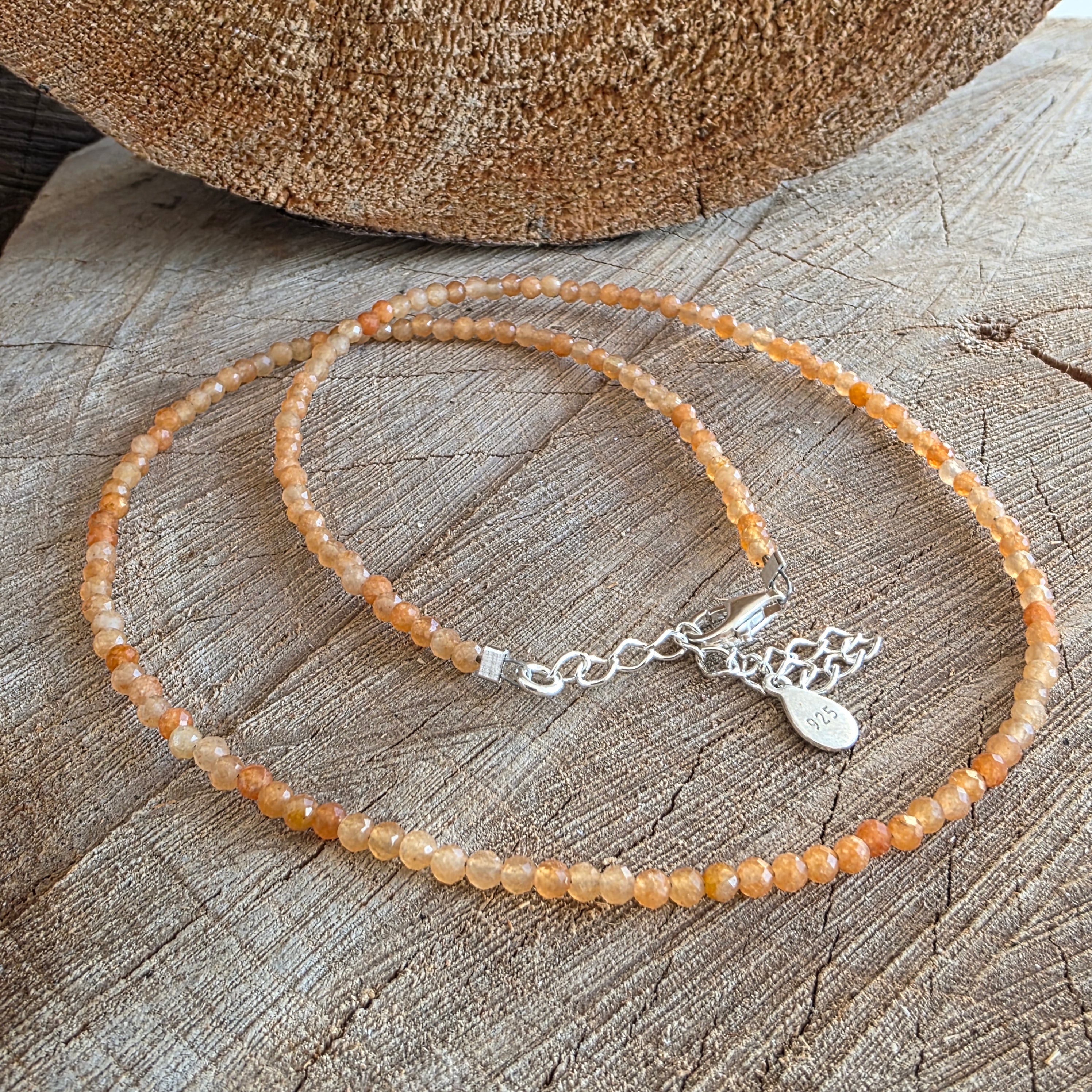 Το νήμα αποτελείται εξ ολοκλήρου από σφαίρες που αντιμετωπίζονται από 2,5 mm Πορτοκαλί Adventurine, λεπτές χάντρες, διαφανές σε μερικές γωνίες και μεταξένιες σε άλλες, που πιάνουν το φως σε ήπια σπινθήρες, όπως η λάμψη της Δύσης πάνω από τη ζεστή άμμο. Οι αποχρώσεις ποικίλλουν μεταξύ του σβήσιμου ροδάκινου και μιας λεπτής απόχρωσης του φωτός κεχριμπάρι - ένα ηλιακό χρώμα, αλλά το ανενόχλητο, το οποίο ανακουφίζει, δεν τυφλώνει.