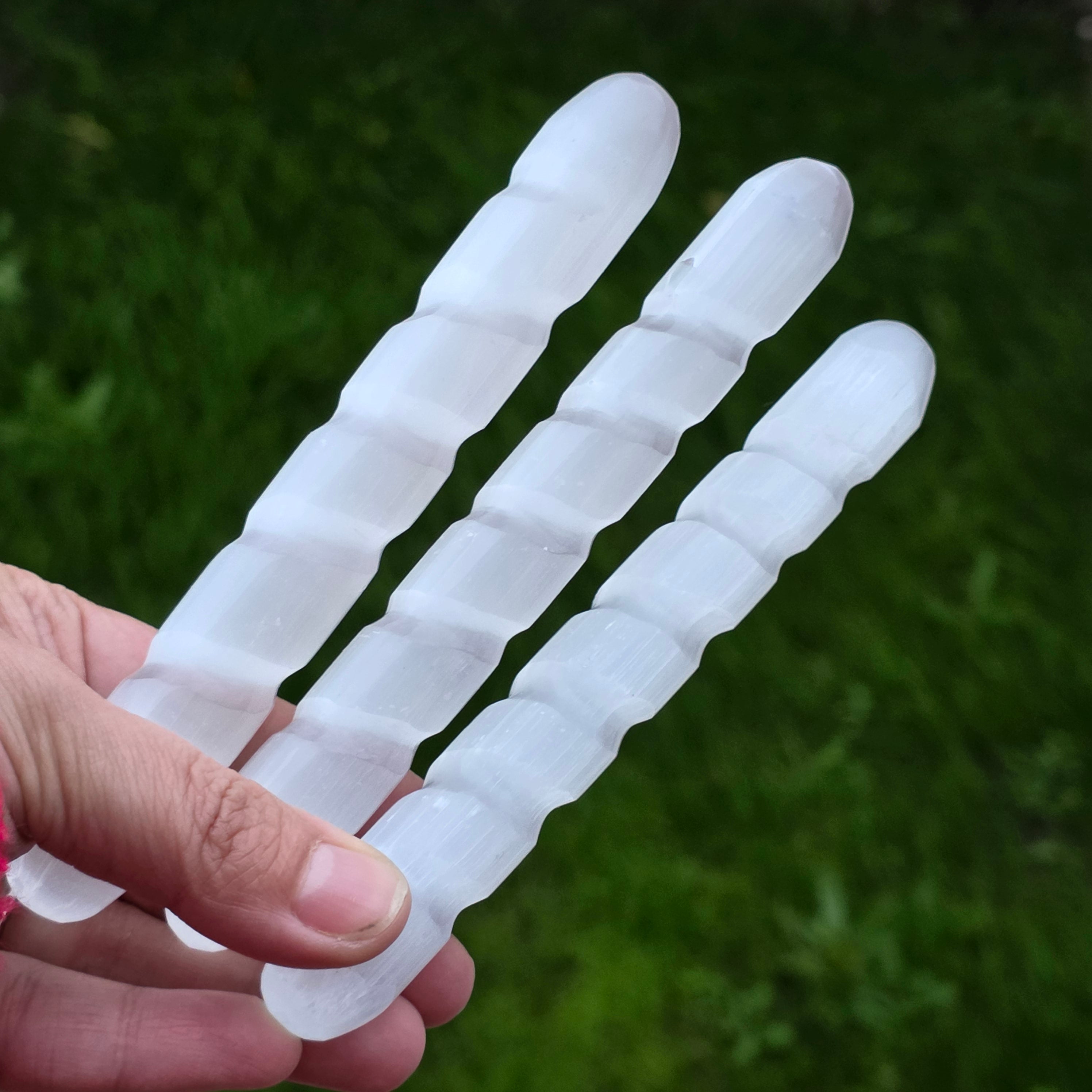 Selenitul este adesea folosit ca un cristal de sprijin în practicile spirituale, ajutând la deschiderea și activarea chakrelor 6 si 7, care sunt asociate cu intuiția, clarviziunea și conexiunea la nivel spiritual.