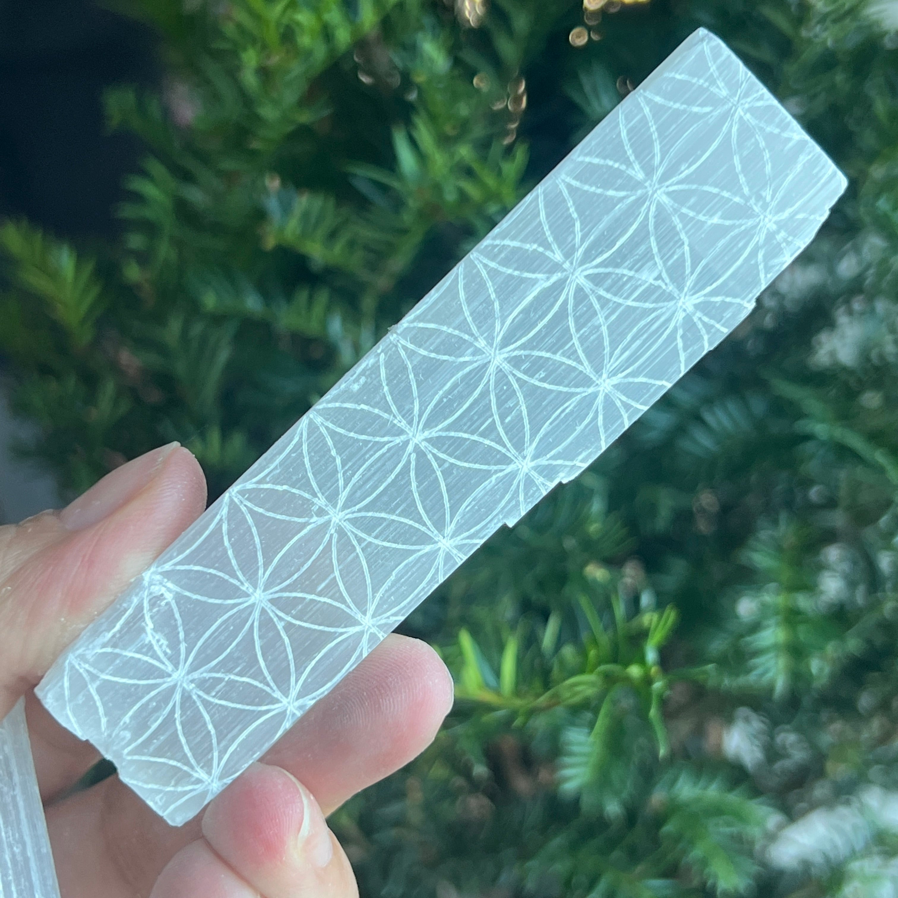 Floarea Vieții este unul dintre cele mai sacre simboluri din geometria universală, reprezentând interconectarea tuturor formelor de viață și energia creației. Gravura sa pe selenit amplifică puterea de curățare și reechilibrare energetică a acestei pietre, transformând fiecare baghetă într-un instrument spiritual unic.