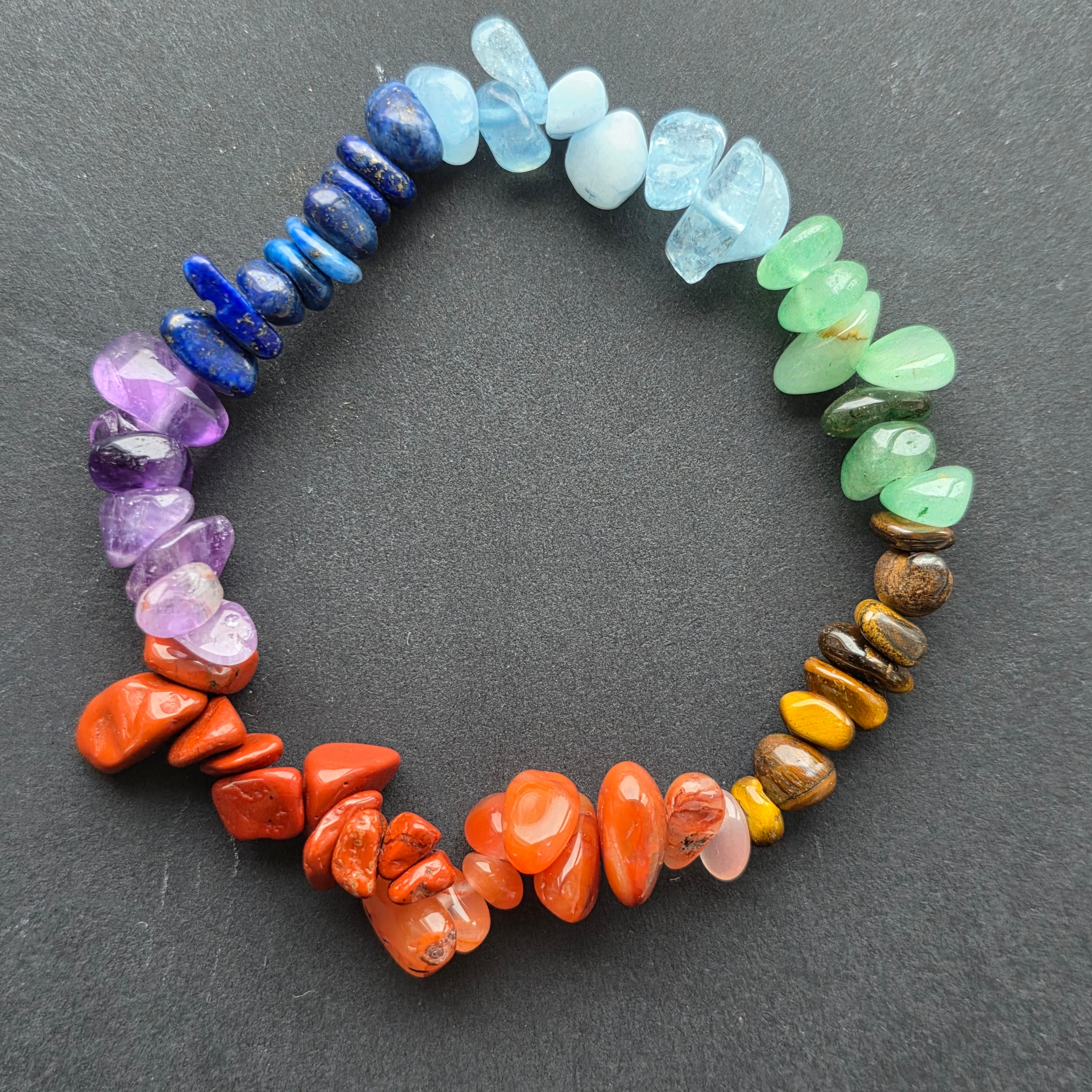 • Pietre: mix natural specific celor 7 chakre (roșu, portocaliu, galben, verde, albastru deschis, albastru închis, violet)