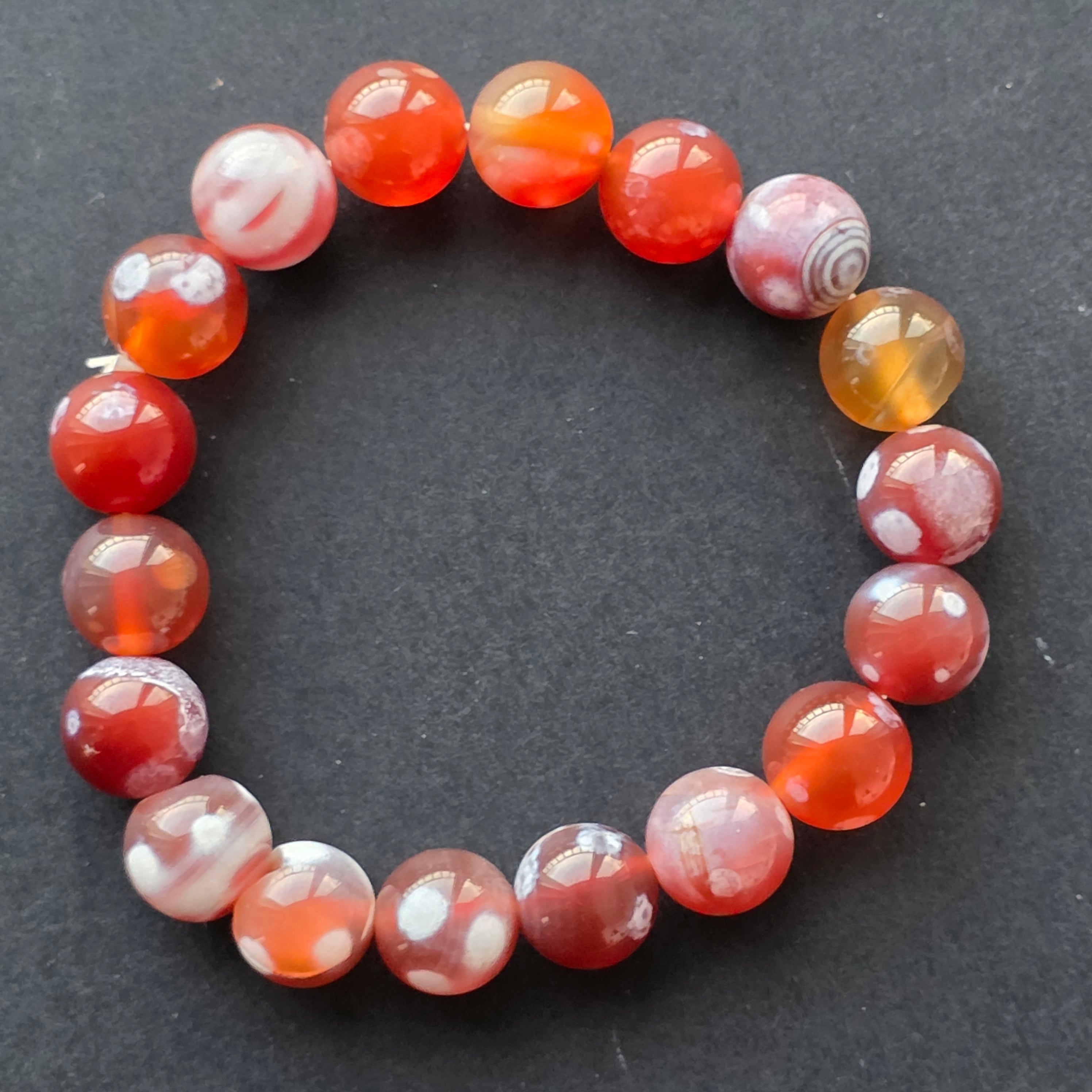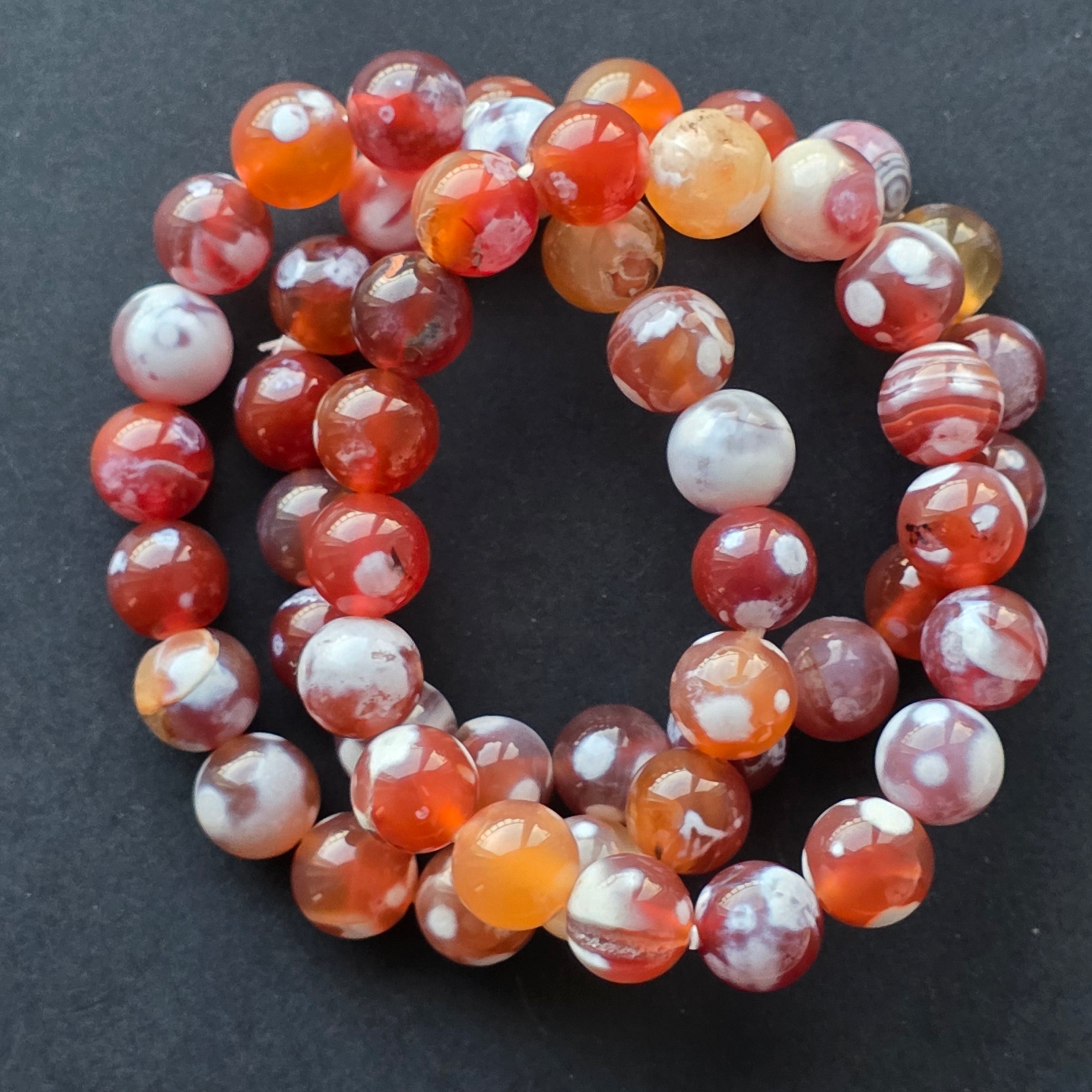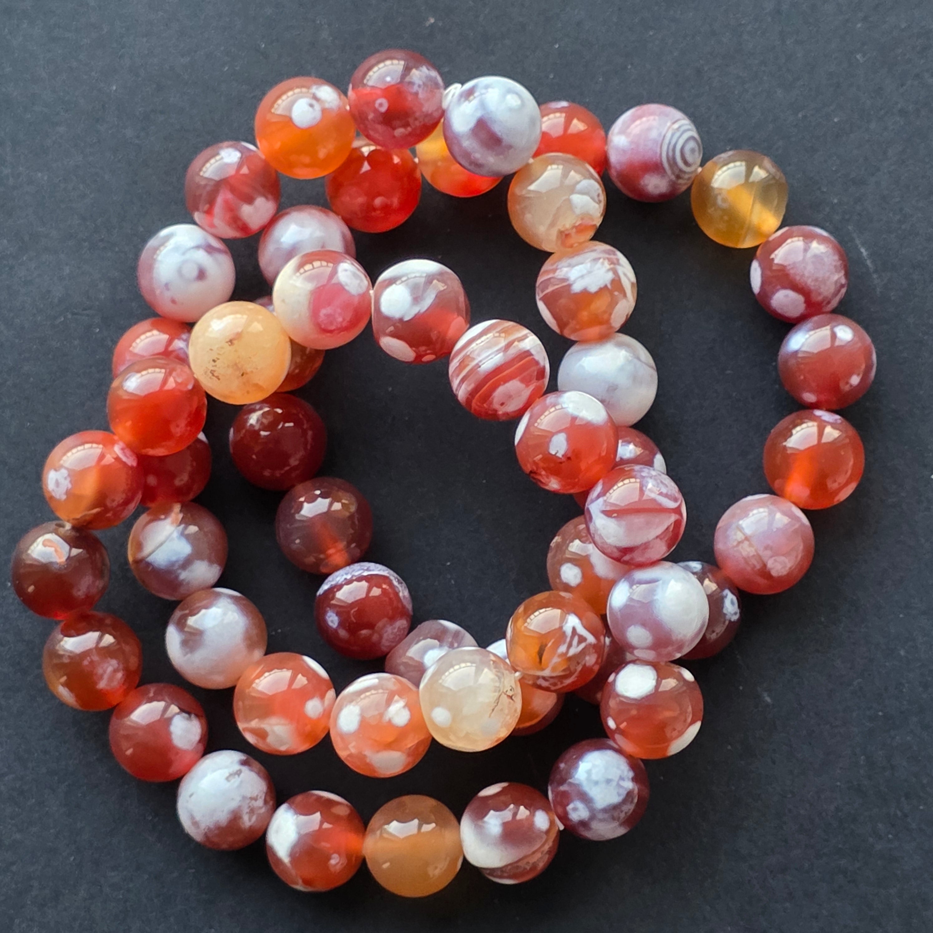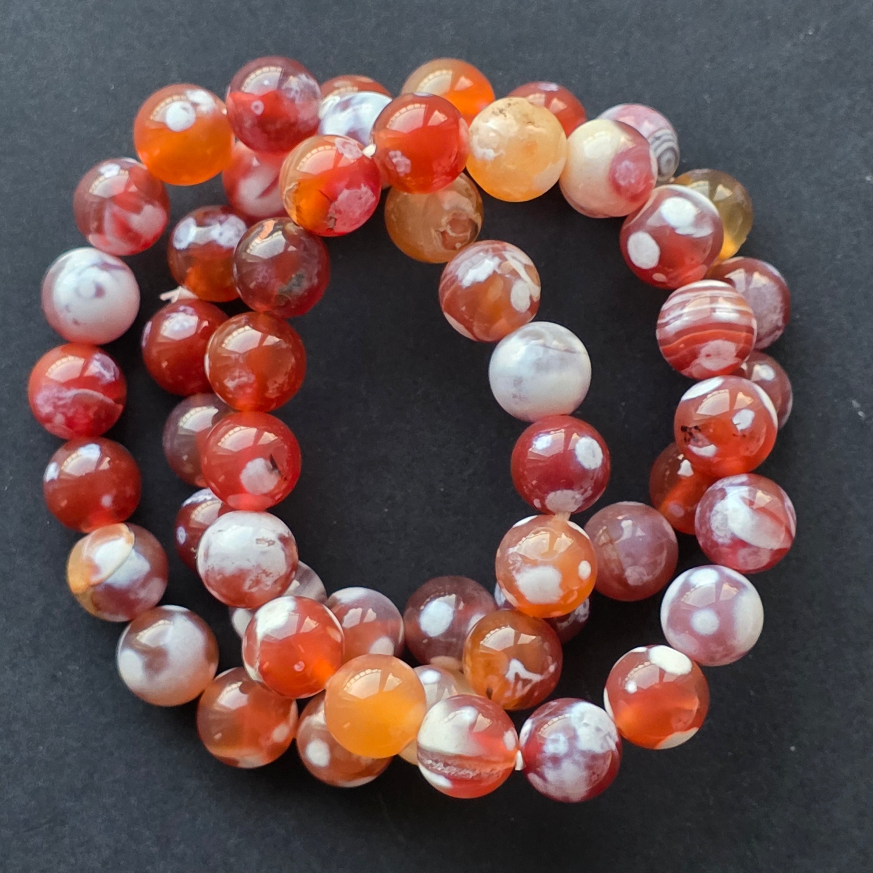 • Piatra: agat portocaliu (agate fire) – mărgele sferice 10–11 mm
