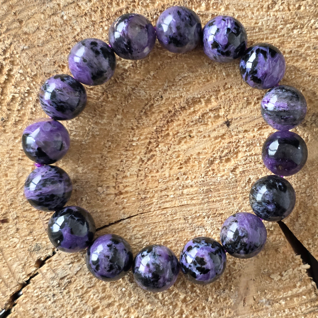 O brățară spectaculoasă, ce poartă în ea misterul amurgurilor nordice. Mărgelele rotunde de 12 mm din charoit natural, șlefuite manual până la un luciu mătăsos, dezvăluie vortexuri fascinante de violet, lavandă, gri sidefat și negru profund. Fiecare piatră este o lume în sine, cu texturi fluide și irizații care par să danseze în lumină – o adevărată operă a naturii, unică în felul ei.