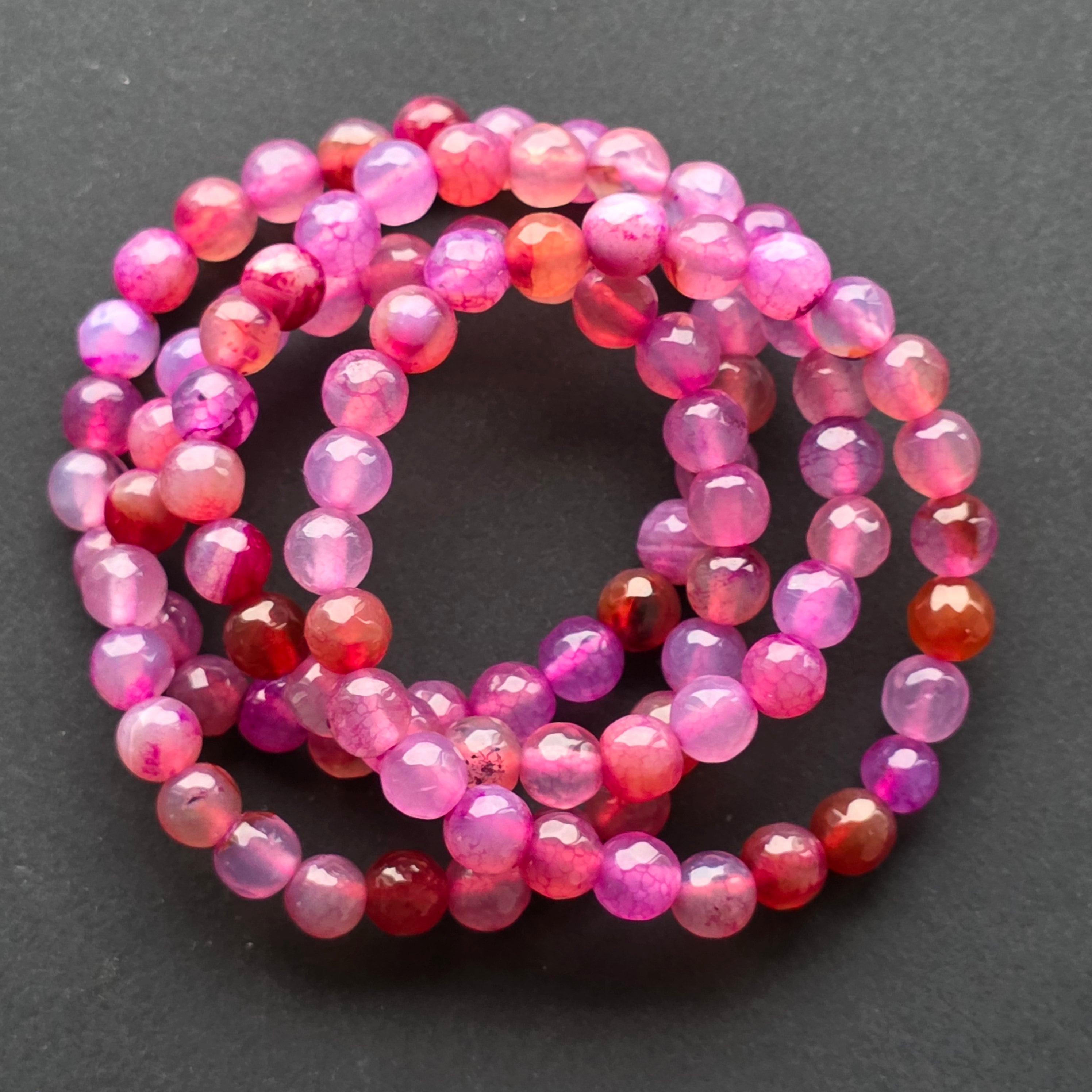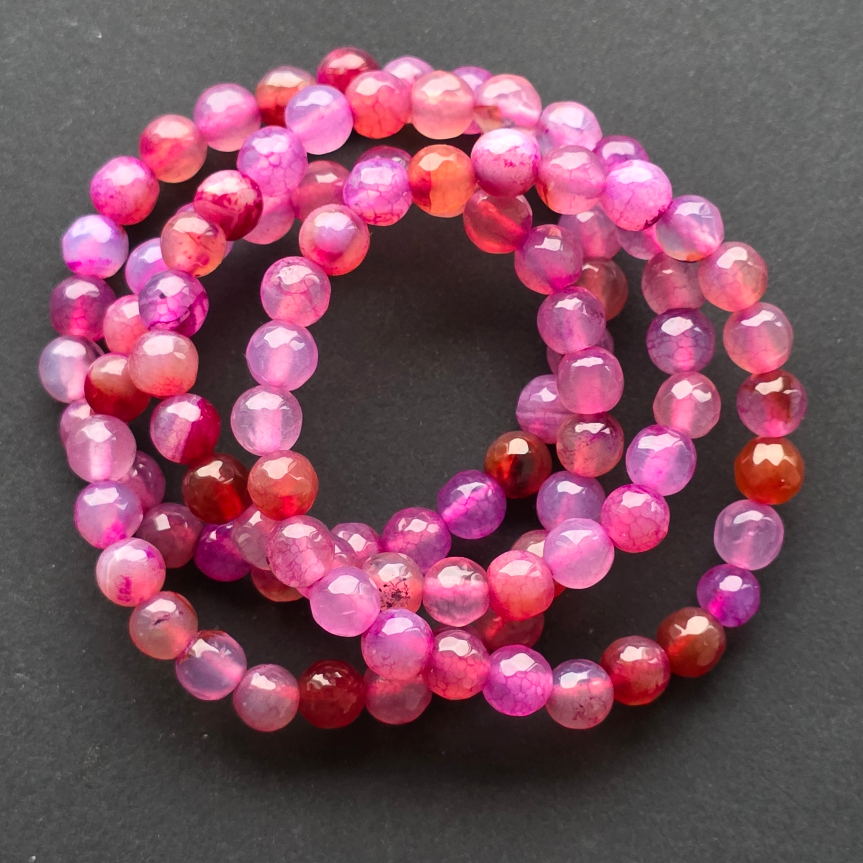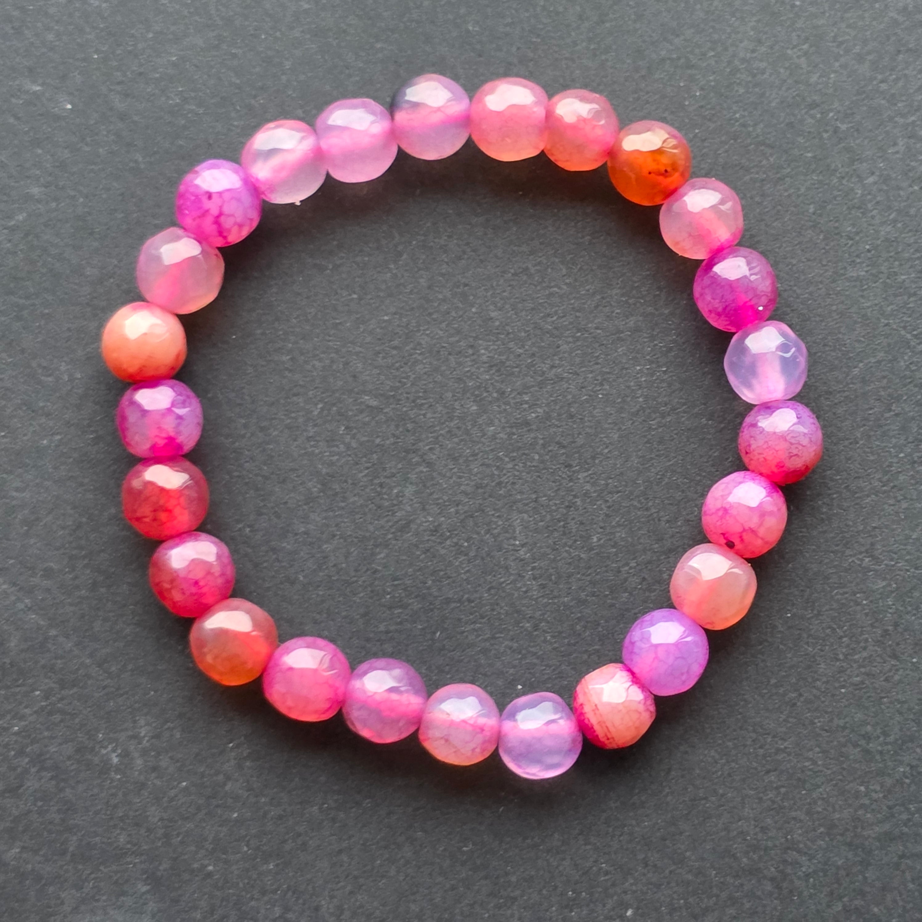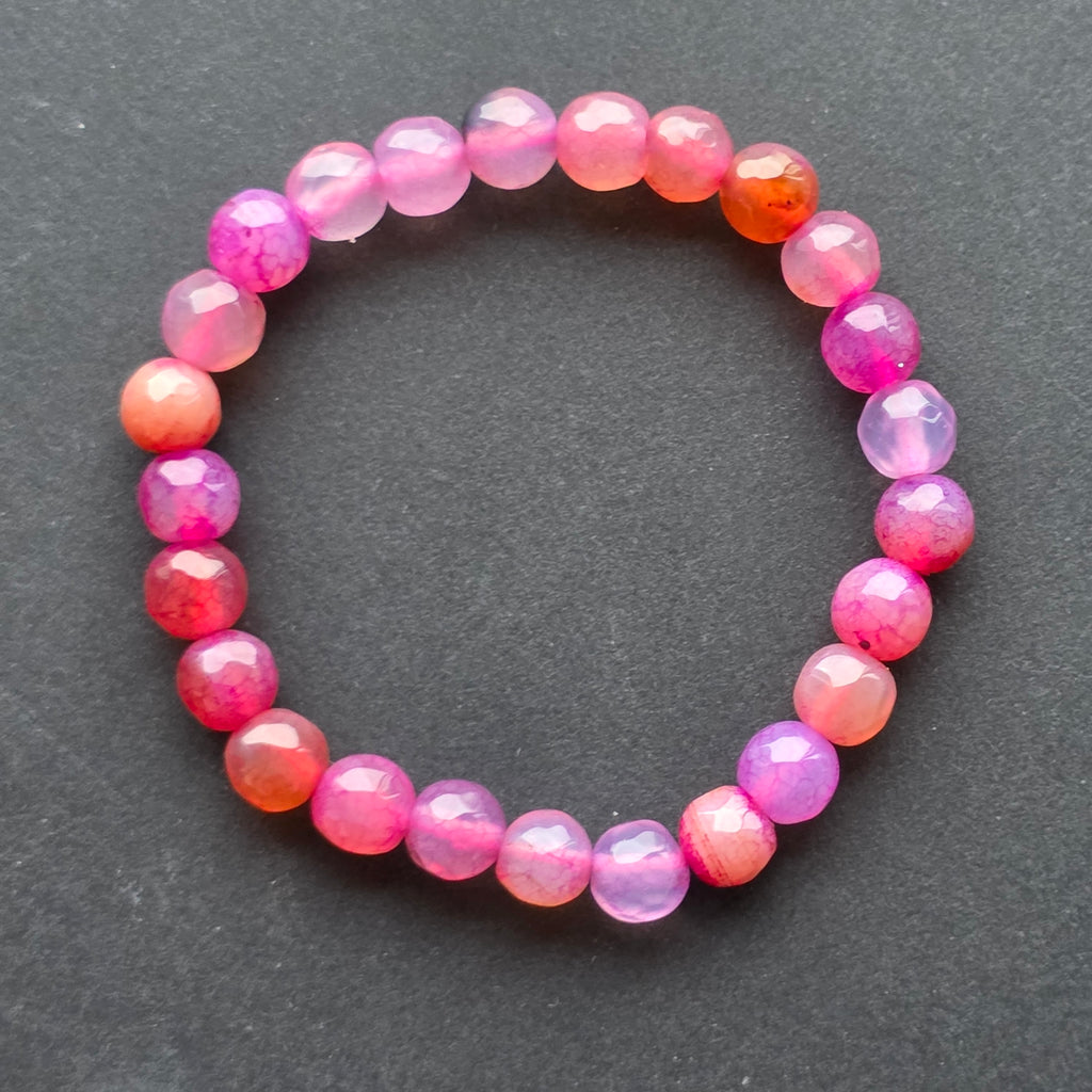Această brățară pare desprinsă din lumea poveștilor unde culorile dansează liber, iar lumina se joacă pe fiecare mărgea ca într-un curcubeu miniatural. Agatul roz din Modelul 2 se distinge prin tonuri mai vibrante, calde și energice, care aduc aminte de fructe coapte în soare sau de bujori în floare – pline de vitalitate și optimism.