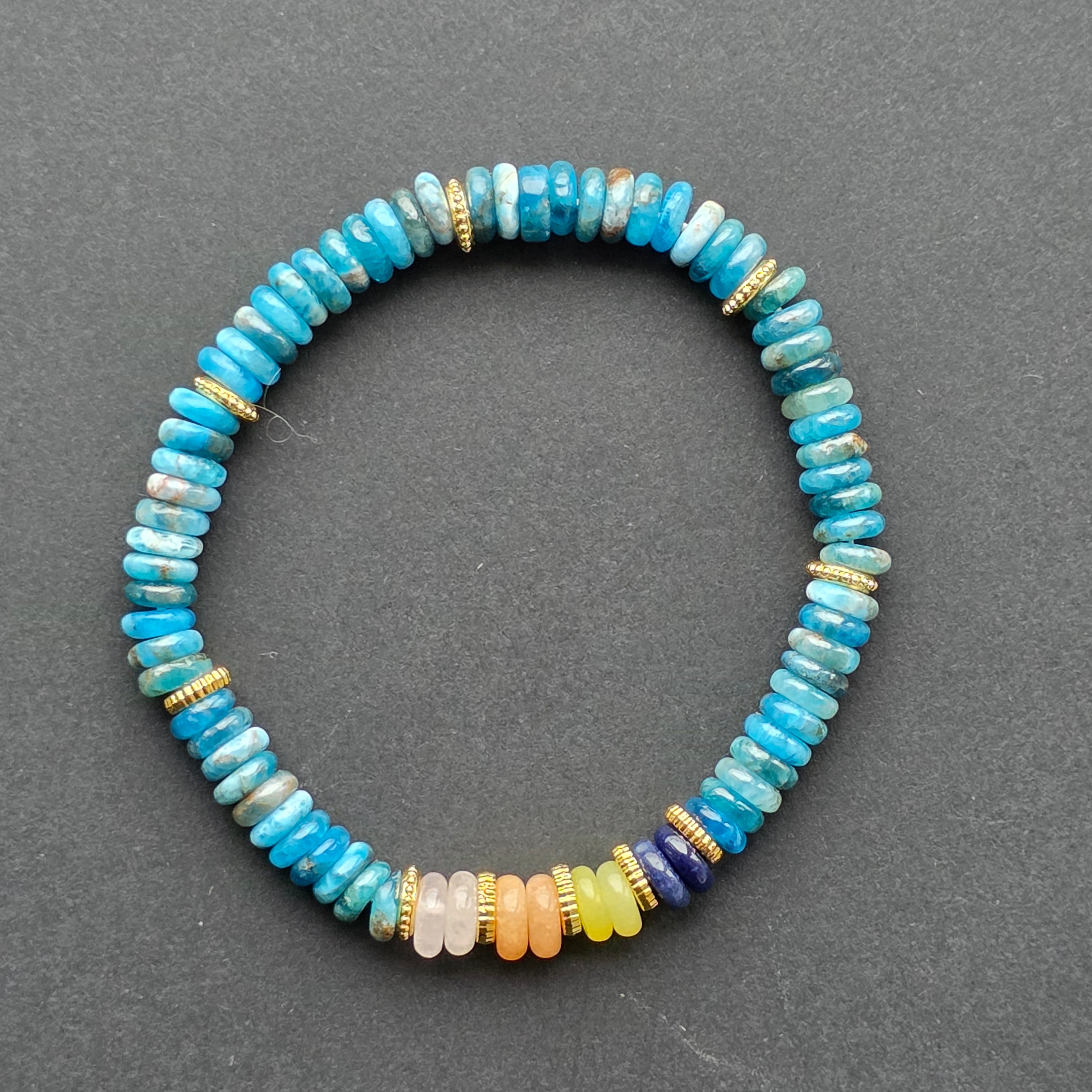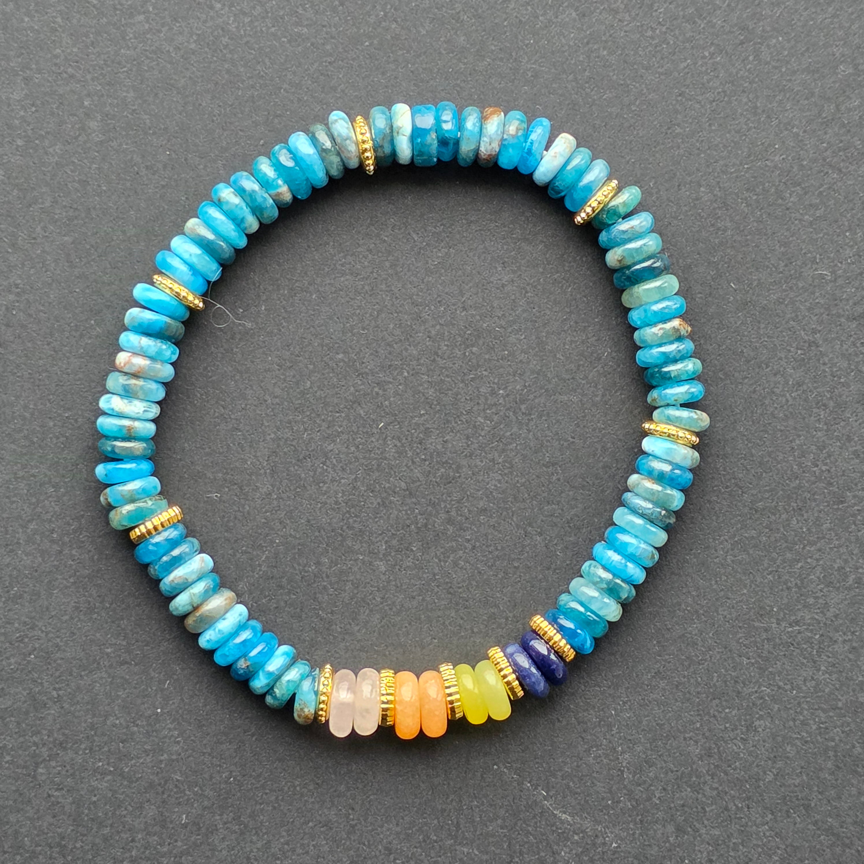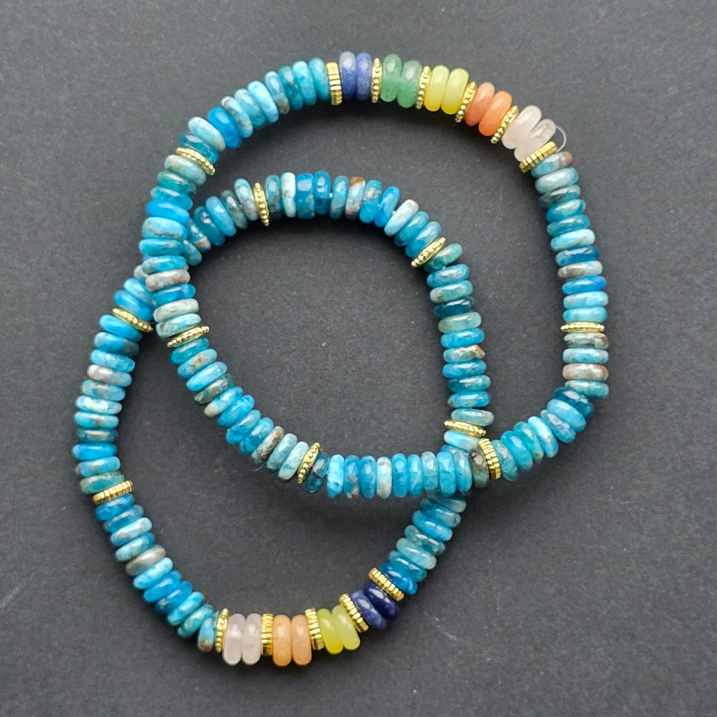 Brățara din apatit albastru captează lumina într-un mod aparte, cu reflexe profunde ce amintesc de valurile oceanului. Fiecare disc este slefuit pentru a păstra acel joc cromatic specific apatitei — un amestec vibrant de albastru turcoaz și nuanțe marine mai închise, care creează o textură vizuală bogată și elegantă.