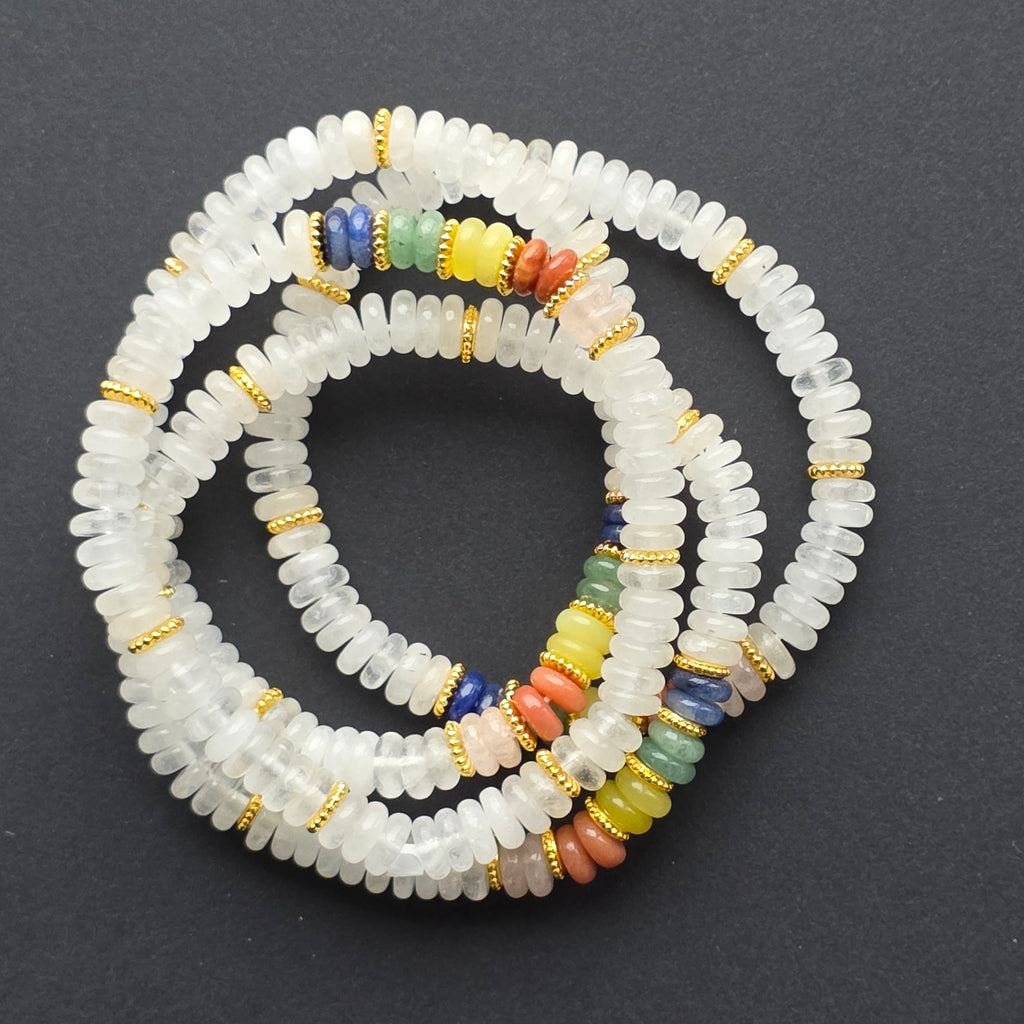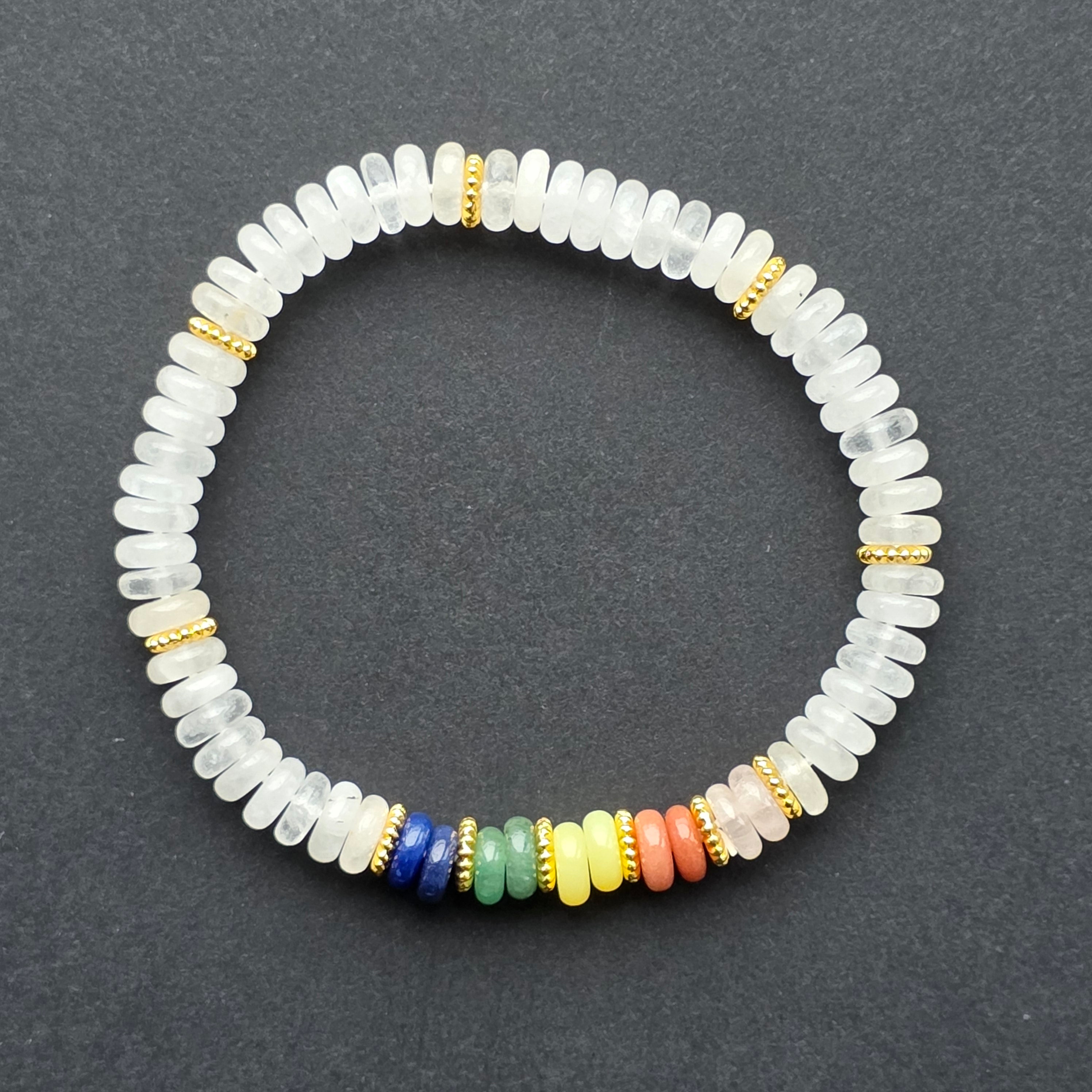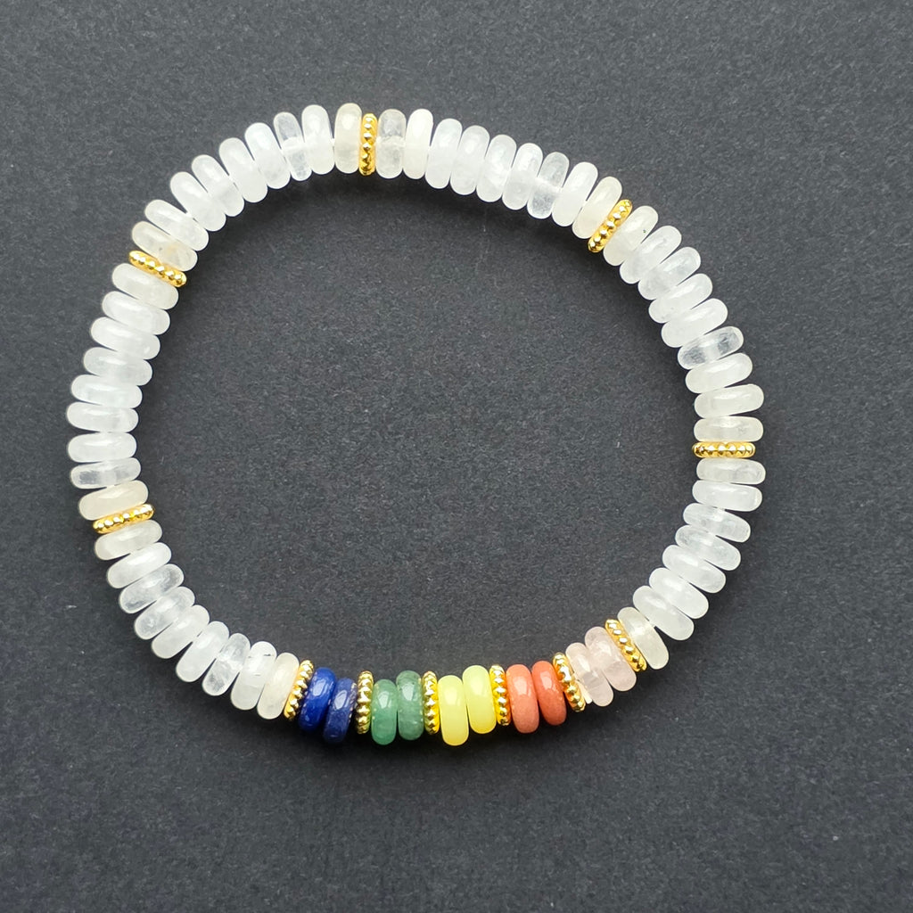 În partea centrală se află segmentul 7 chakre, construit din pietre colorate, care oferă un accent vibrant și simbolic. Această combinație între puritatea cuarțului și energia culorilor creează un accesoriu armonios, echilibrat și vizual extrem de plăcut.
