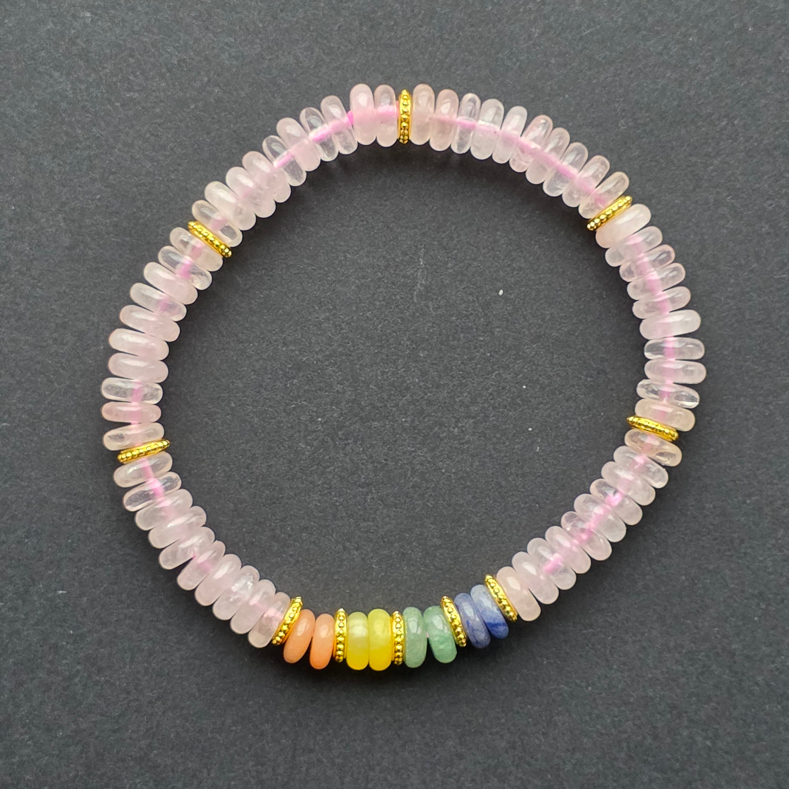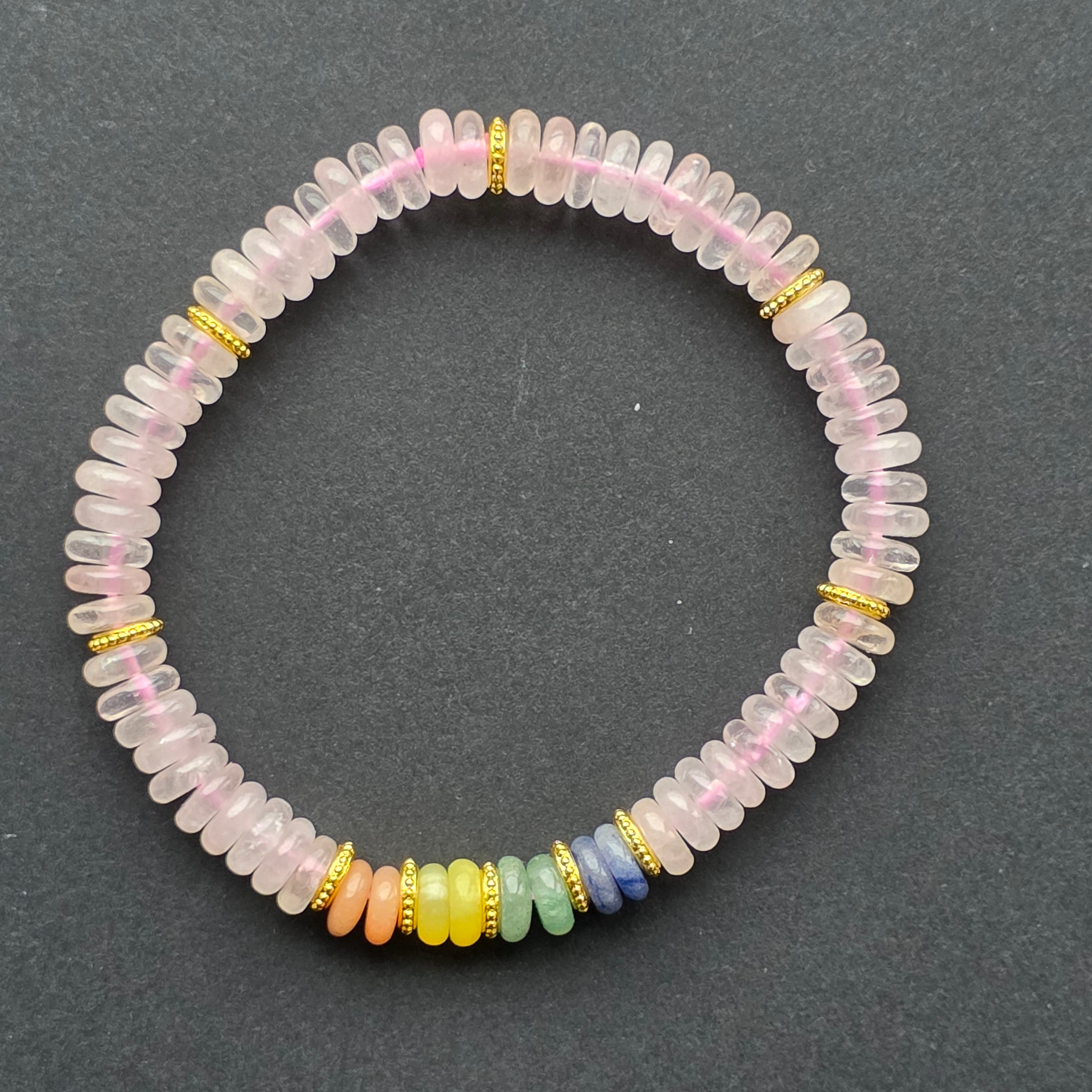 Segmentul 7 chakre adaugă un accent vibrant, echilibrând armonia rozului cu un strop de culoare și dinamism. Jocul de tonuri creează un punct focal discret, dar rafinat, perfect pentru cei care își doresc atât simplitate, cât și un mic detaliu expresiv.