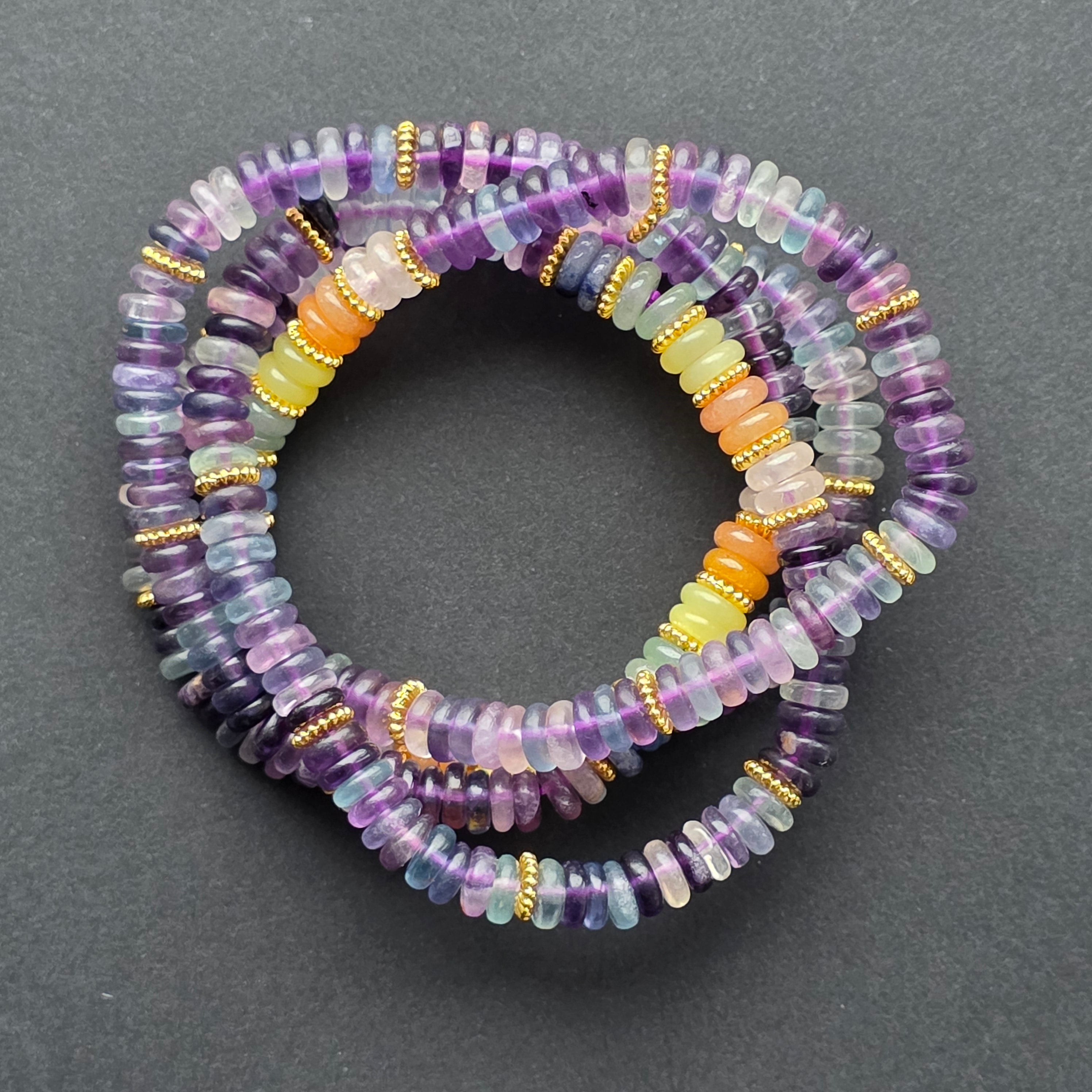În zona centrală se află un segment dedicat celor 7 chakre, creat din pietre multicolore ce adaugă un accent vibrant și simbolic. Acest contrast dintre movul eteric al fluorinei și culorile calde ale chakrelor creează o brățară ce radiază armonie, expresivitate și sensibilitate vizuală.