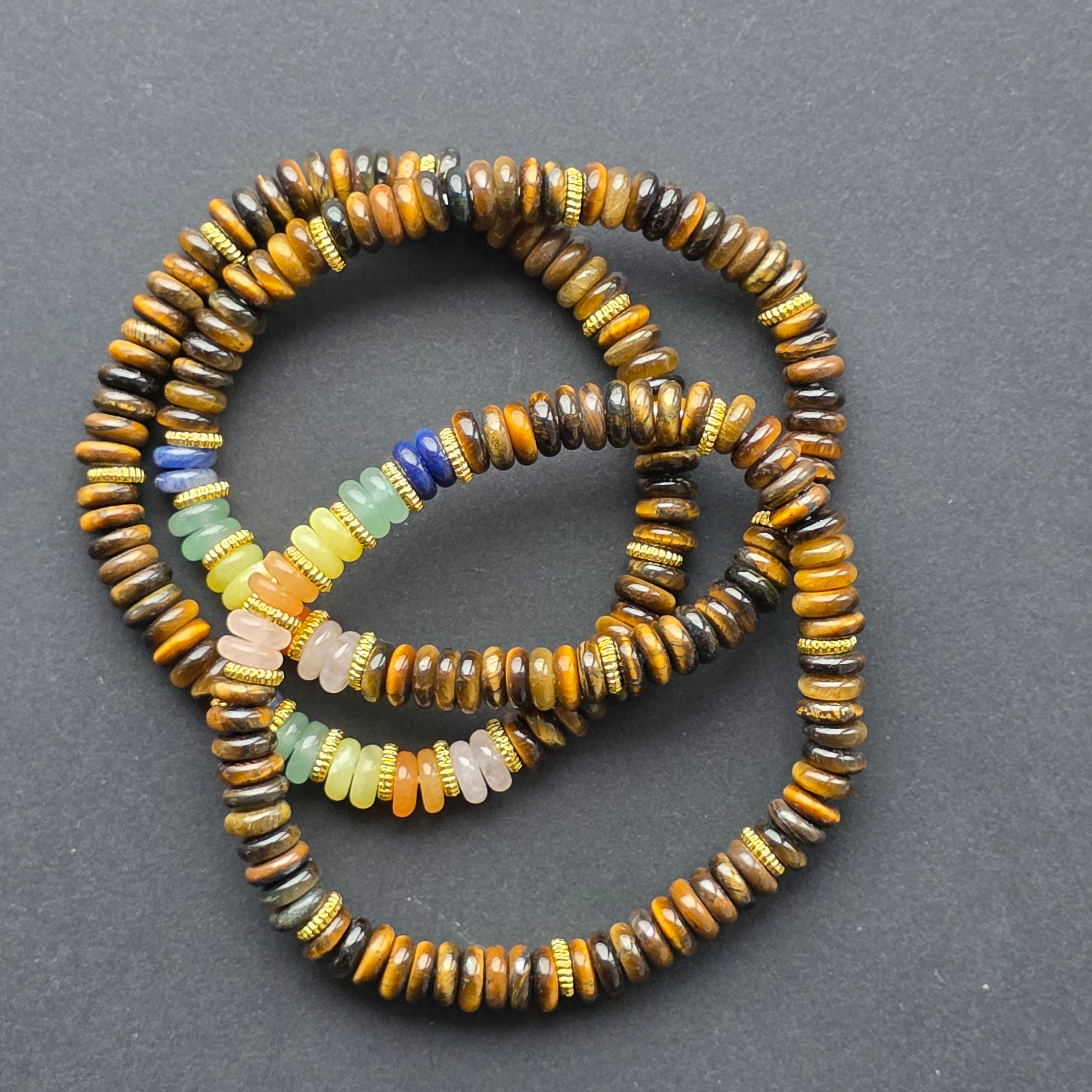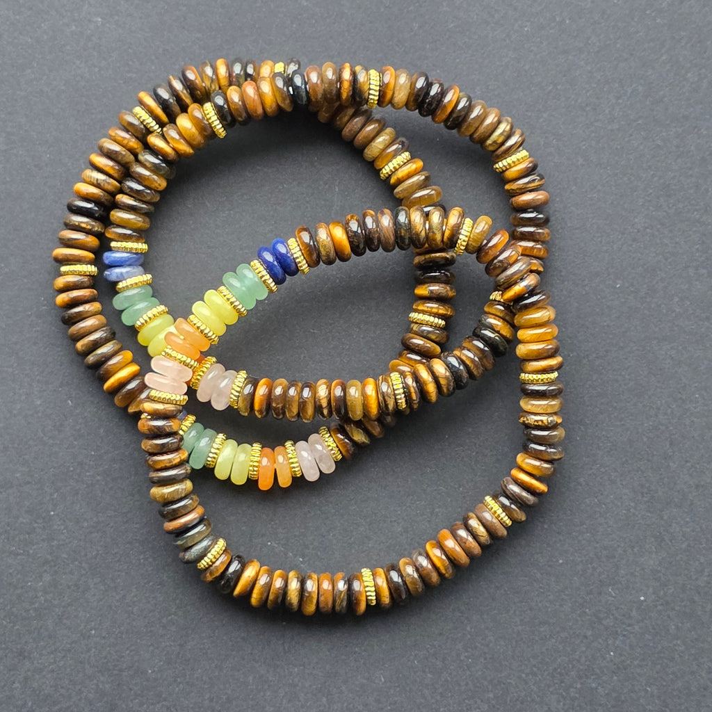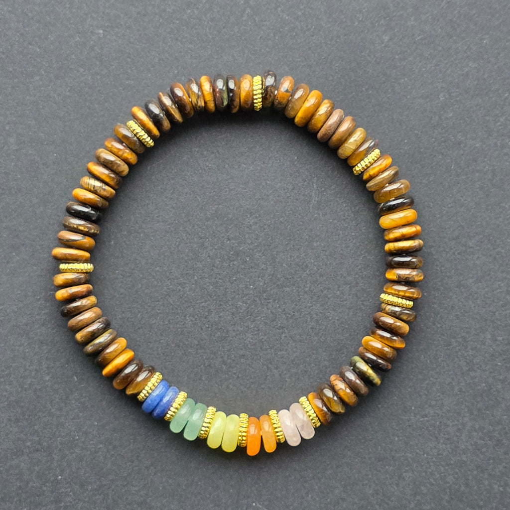 Realizată din ochi de tigru natural, această brățară îmbină frumusețea mătăsoasă a pietrei cu energia culorilor chakrelor. Discurile fine, cu luciu specific cat’s eye, creează o strălucire caldă, mișcătoare, ce dansează la lumină, în timp ce segmentul central multicolor aduce un contrast plin de vitalitate.