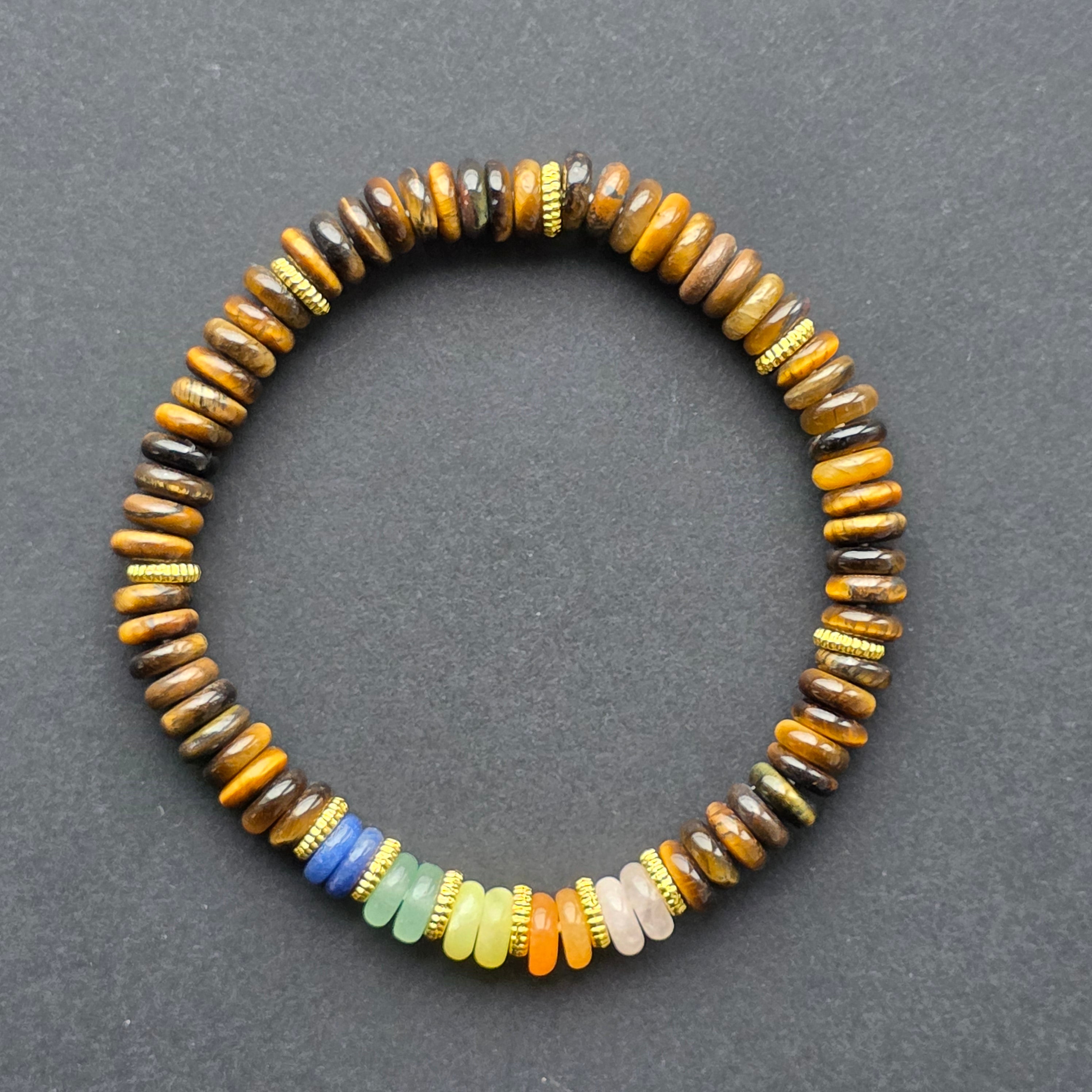 Culorile celor 7 chakre adaugă un accent armonios, transformând brățara într-o piesă nu doar estetică, ci și simbolică — un reminder discret al echilibrului interior și al intenției personale. Nuanțele naturale ale ochiului de tigru se îmbină perfect cu tonurile vii ale chakrelor, creând un accesoriu modern, energic și sofisticat.