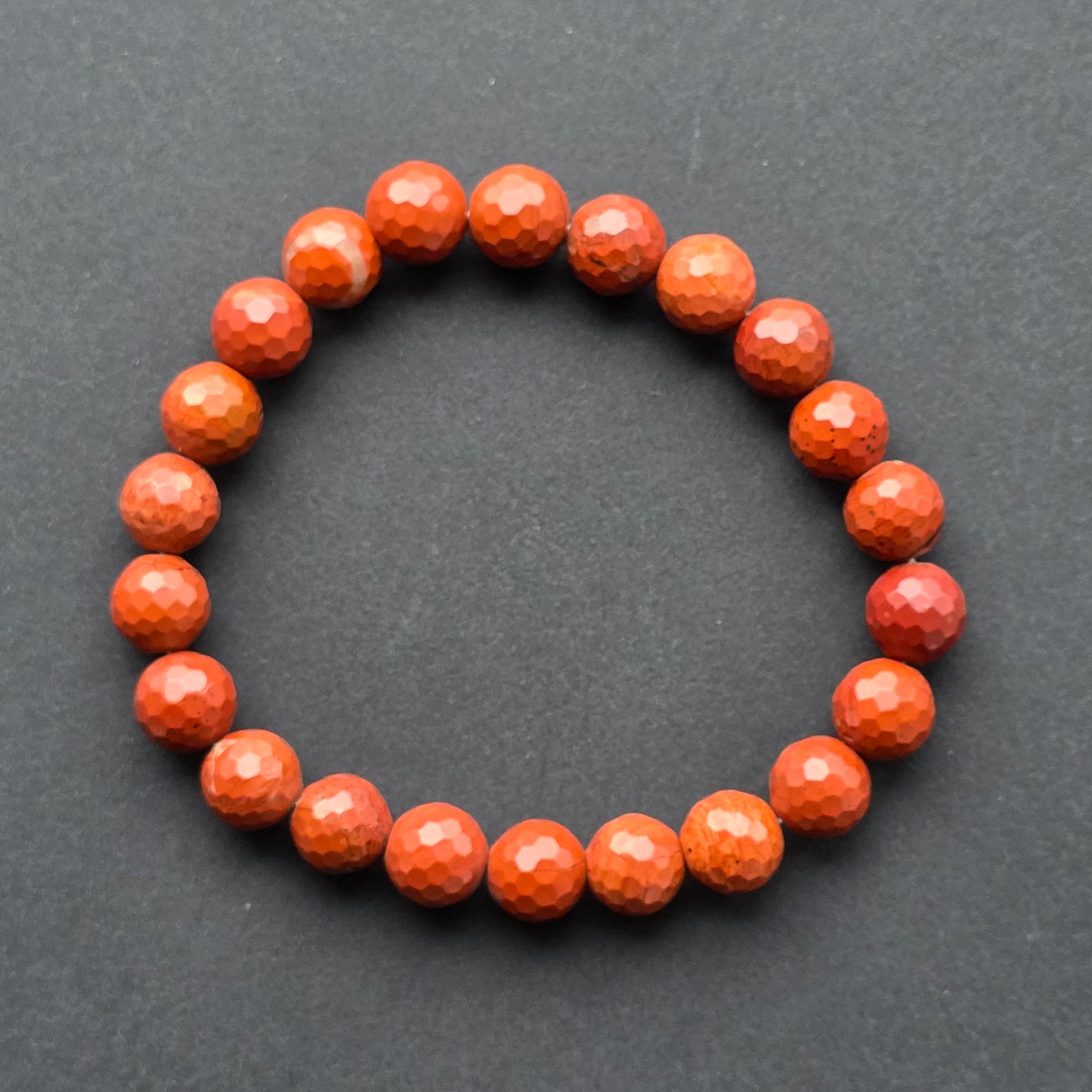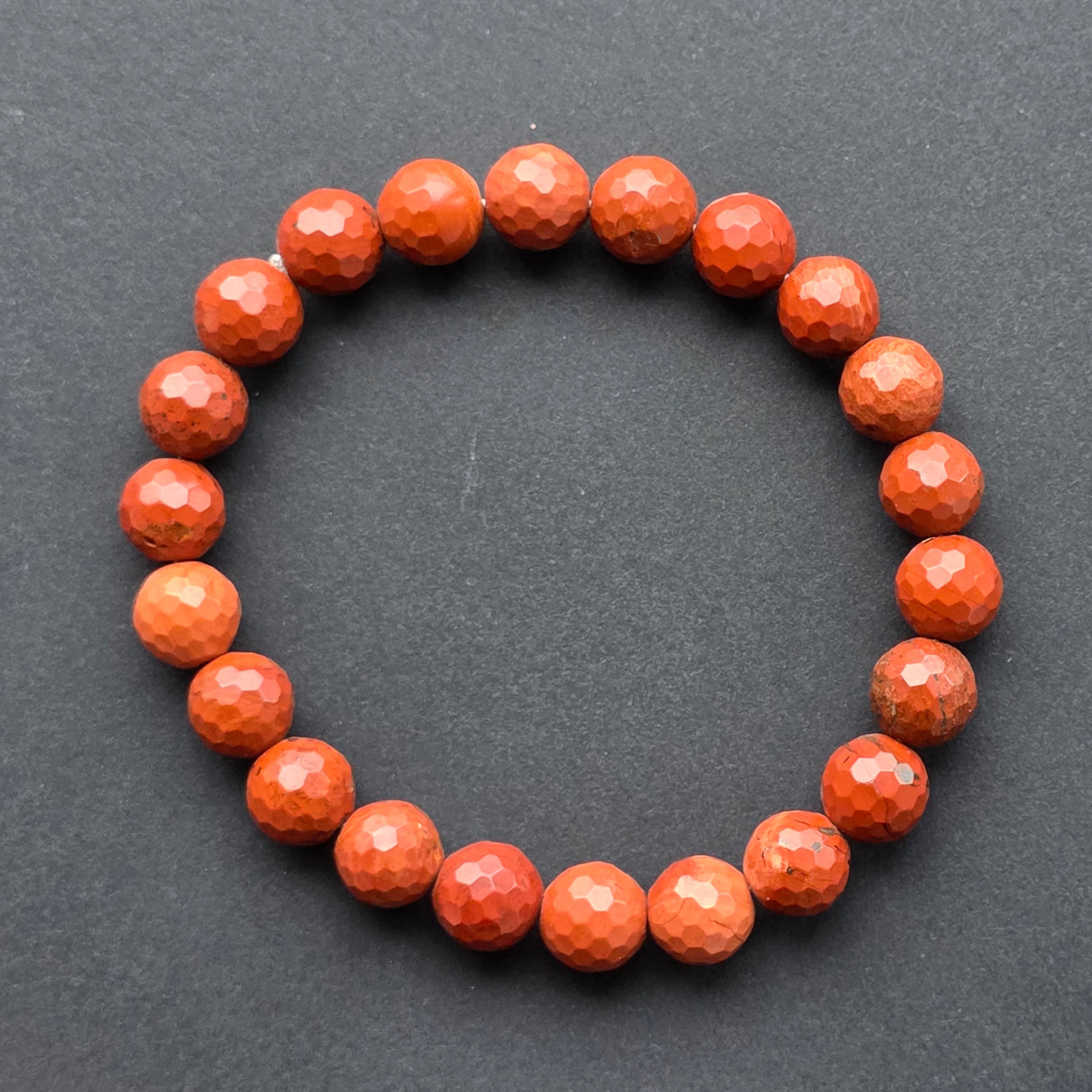 Brățara din jasp roșu este o piesă cu prezență puternică, caldă, plină de caracter. Mărgelele mari, fațetate, surprind lumina în scântei subtile, păstrând totuși acea textură mată și profundă specifică jaspului — o piatră cunoscută pentru naturalețea și robustețea ei.
