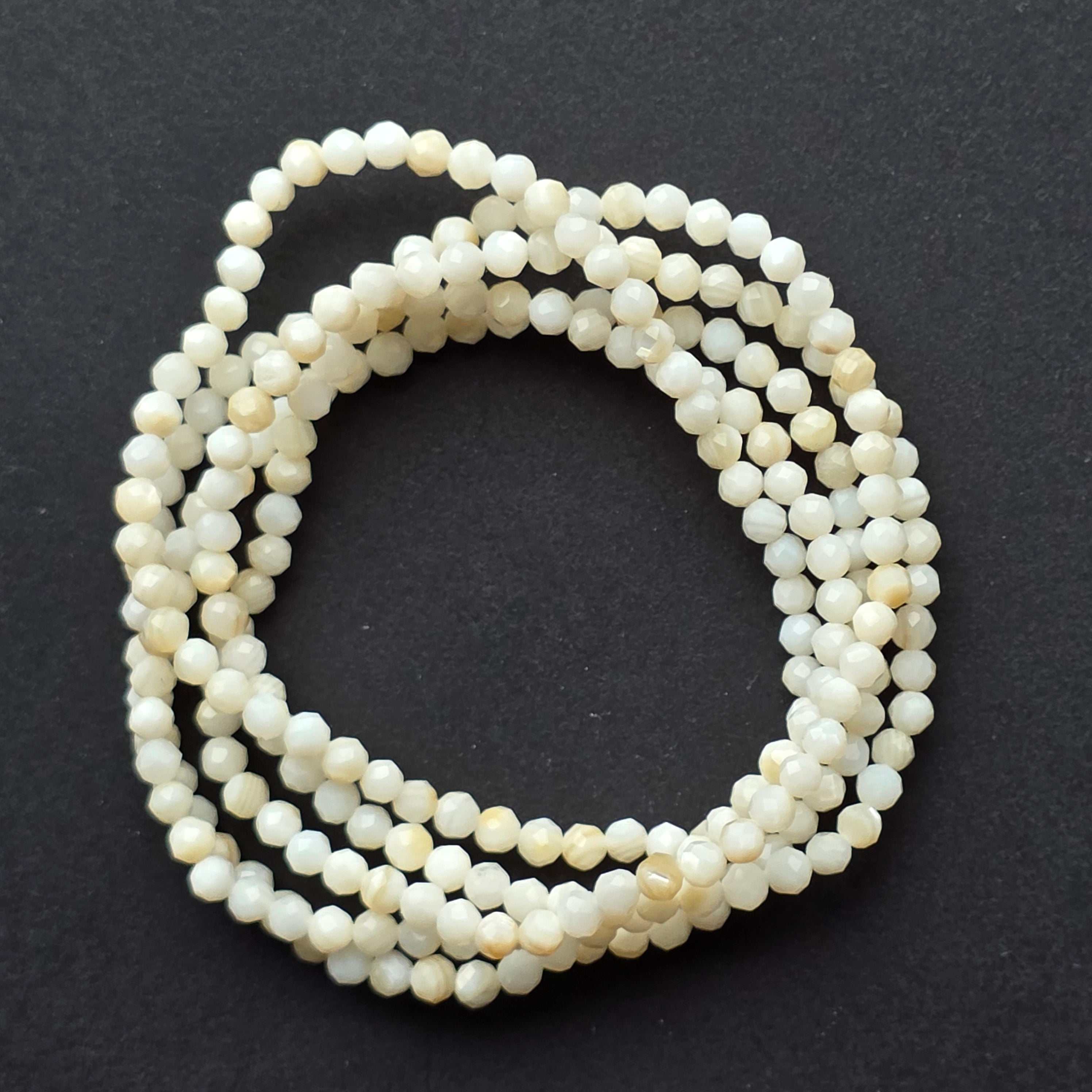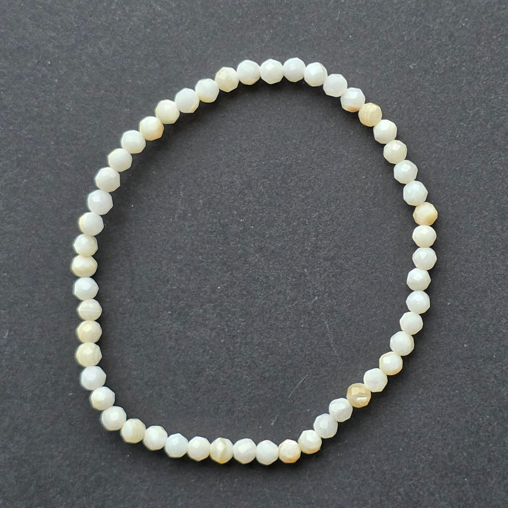 Brățara fațetată din sidef este o piesă cu lumină proprie — delicată, caldă și subtil perlată. Mărgelele mici, atent fațetate, surprind fiecare rază de lumină într-un joc fin de reflexii, păstrând totuși naturalețea organică a scoicii din care sunt create.