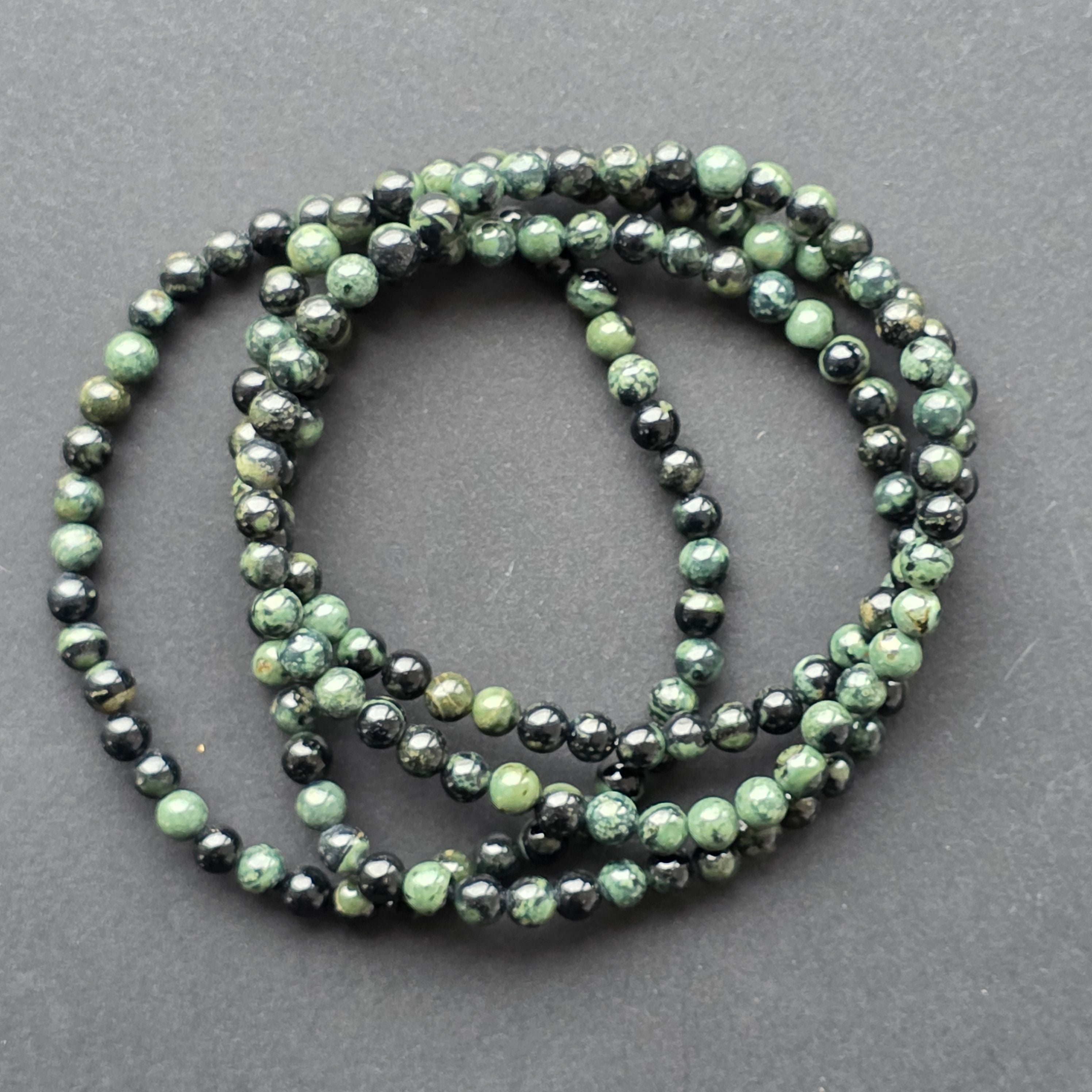 Brățara din jasp kambaba poartă în ea liniștea adâncimilor, culorile pădurilor tropicale și misterul pietrelor vechi de milioane de ani. Textura sa organică, verde-închis combinat cu negru catifelat, pare sculptată de timp și de natură, ca o hartă subtilă a lumilor ascunse sub scoarța Pământului.
